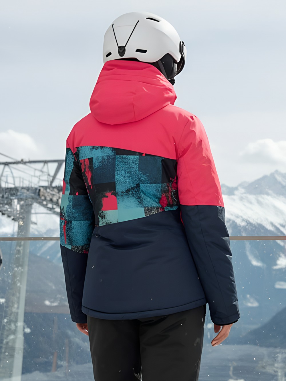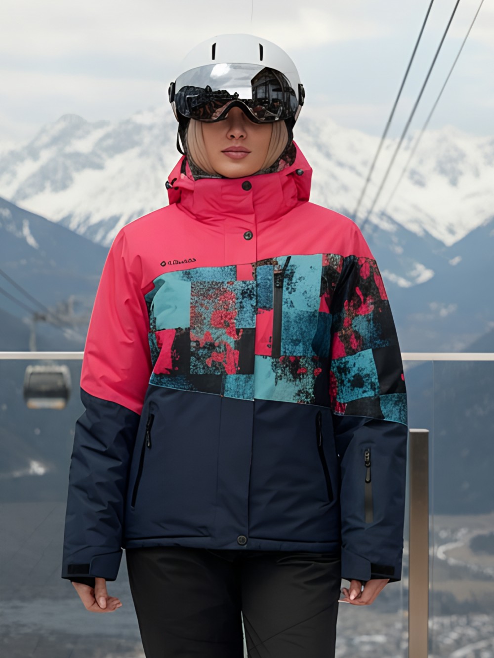 Яркие цвета — красный, зеленый, розовый, бирюзовый и салатовый — в сочетании с абстрактным геометрическим рисунком и светоотражающими деталями создают стильный образ, который выделит вас на фоне зимних пейзажей. Этот костюм идеально подходит как для спортивных мероприятий, так и для повседневных прогулок по городу.