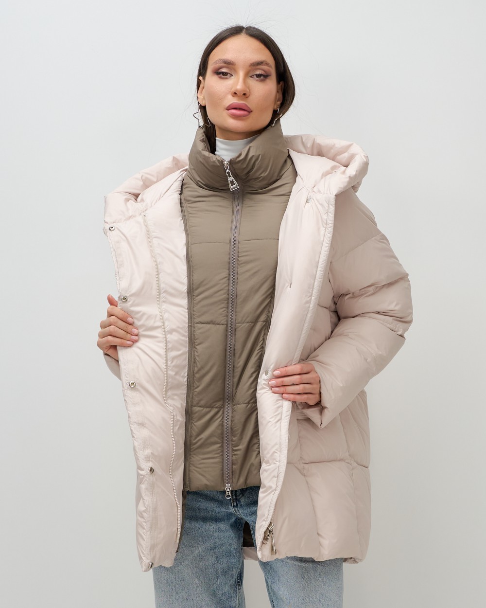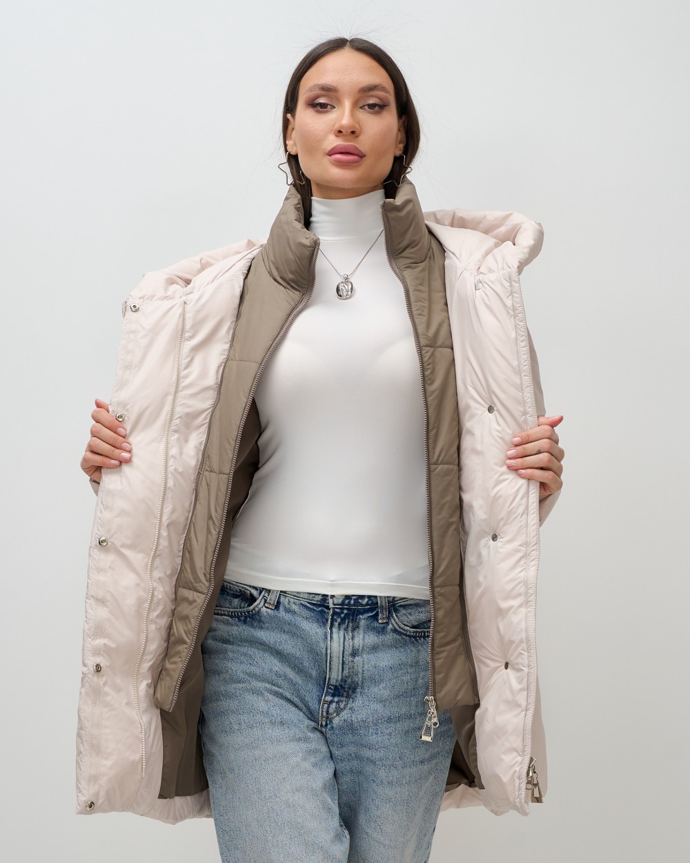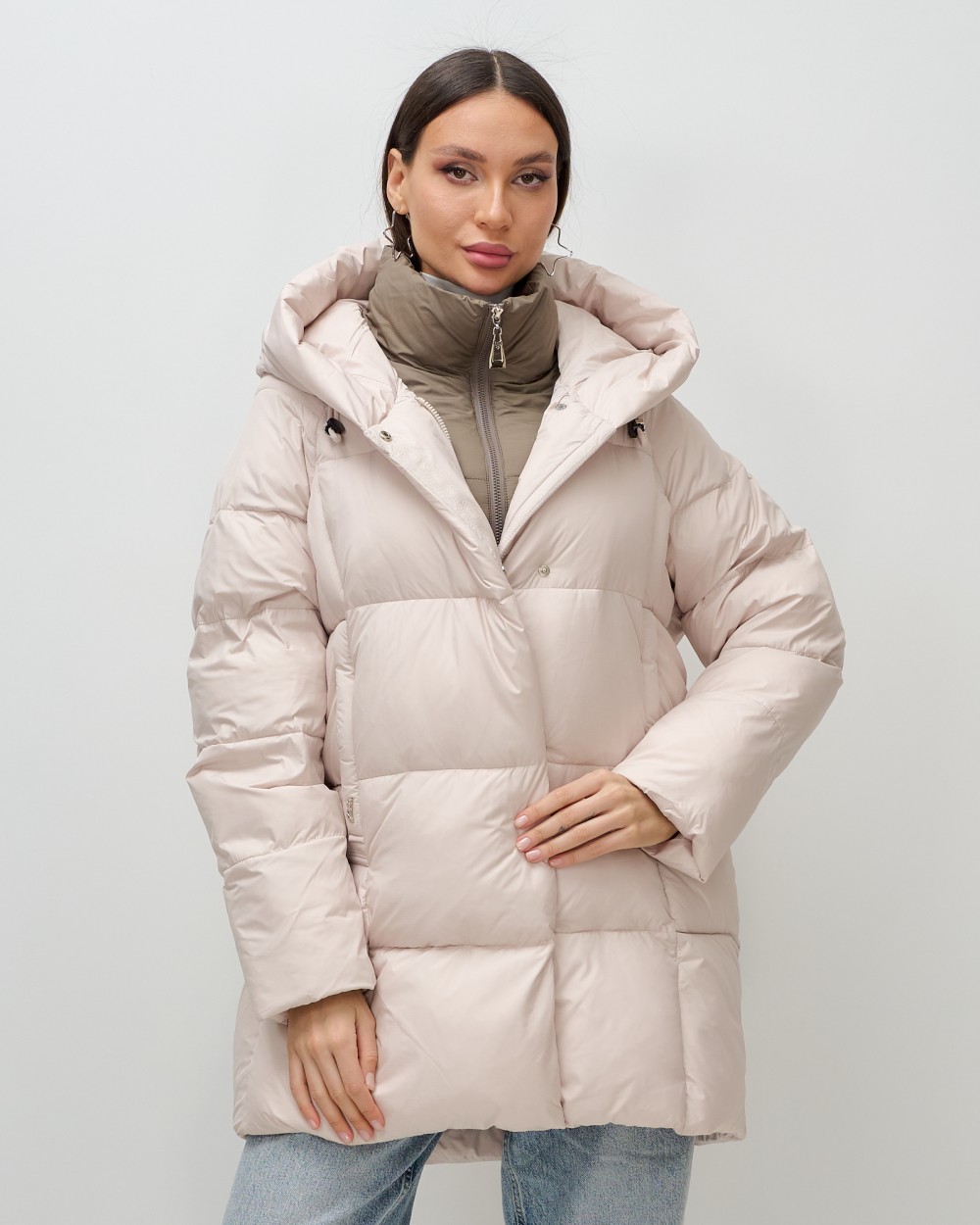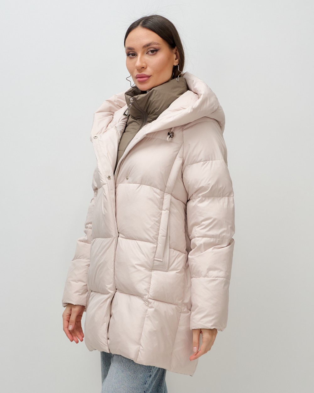 Куртка двубортная женская зимняя с капюшоном бежевого цвета 7736B