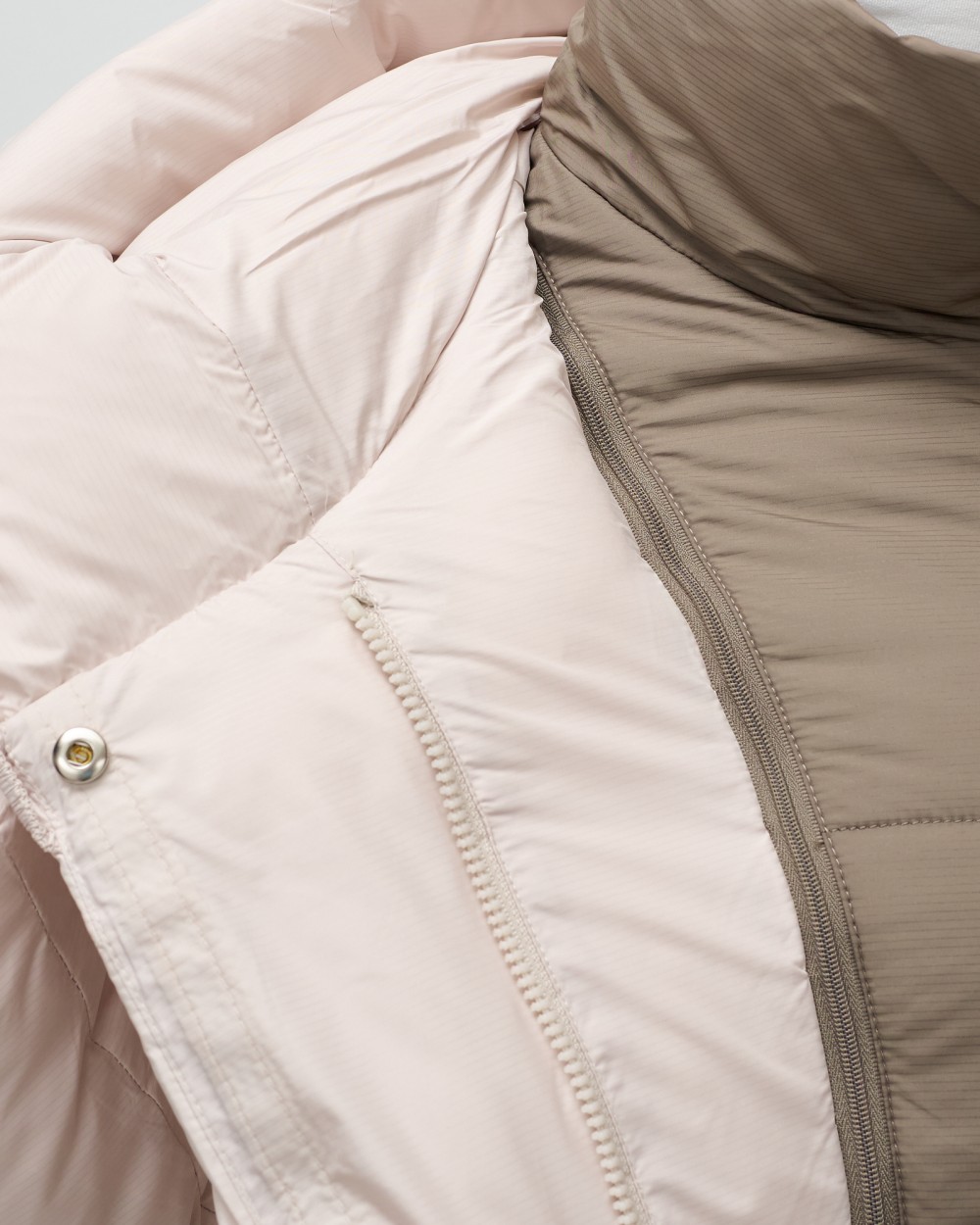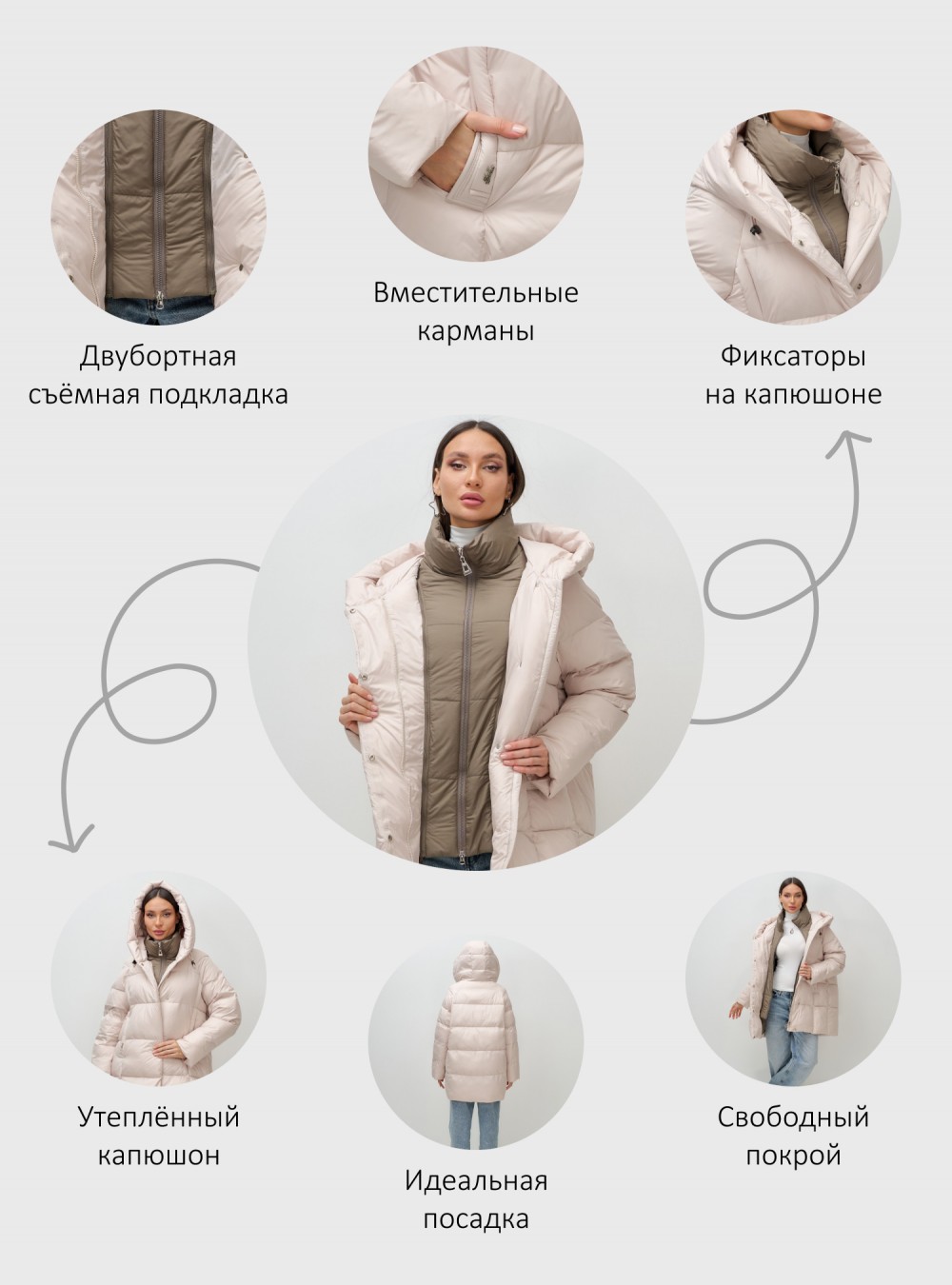 Куртка имеет укороченный подол, внутренние карманы и фиксатор на капюшоне, что добавляет удобства в повседневной носке. Прямой и свободный покрой позволяет сочетать её как с офисным, так и повседневным стилем. Длинные рукава на манжете и съемный воротник придают модели дополнительную функциональность.