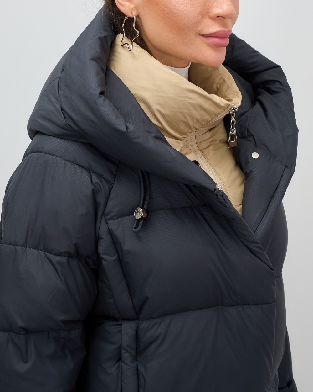 Куртка двубортная женская зимняя с капюшоном черного цвета 7736Ch