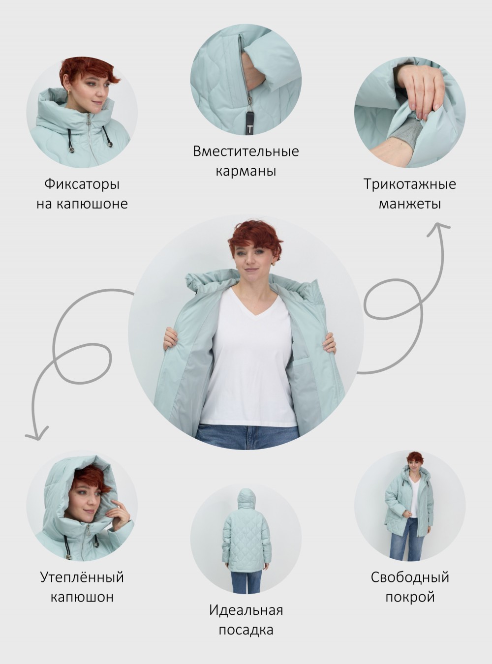 Куртка представлена в различных цветах: черный, серый, бежевый и бирюзовый. Среди особенностей модели — быстросохнущие свойства, водоотталкивающий и гипоаллергенный материал, а также дышащая ткань с разрезом, что делает ее идеальным выбором для активного образа жизни.