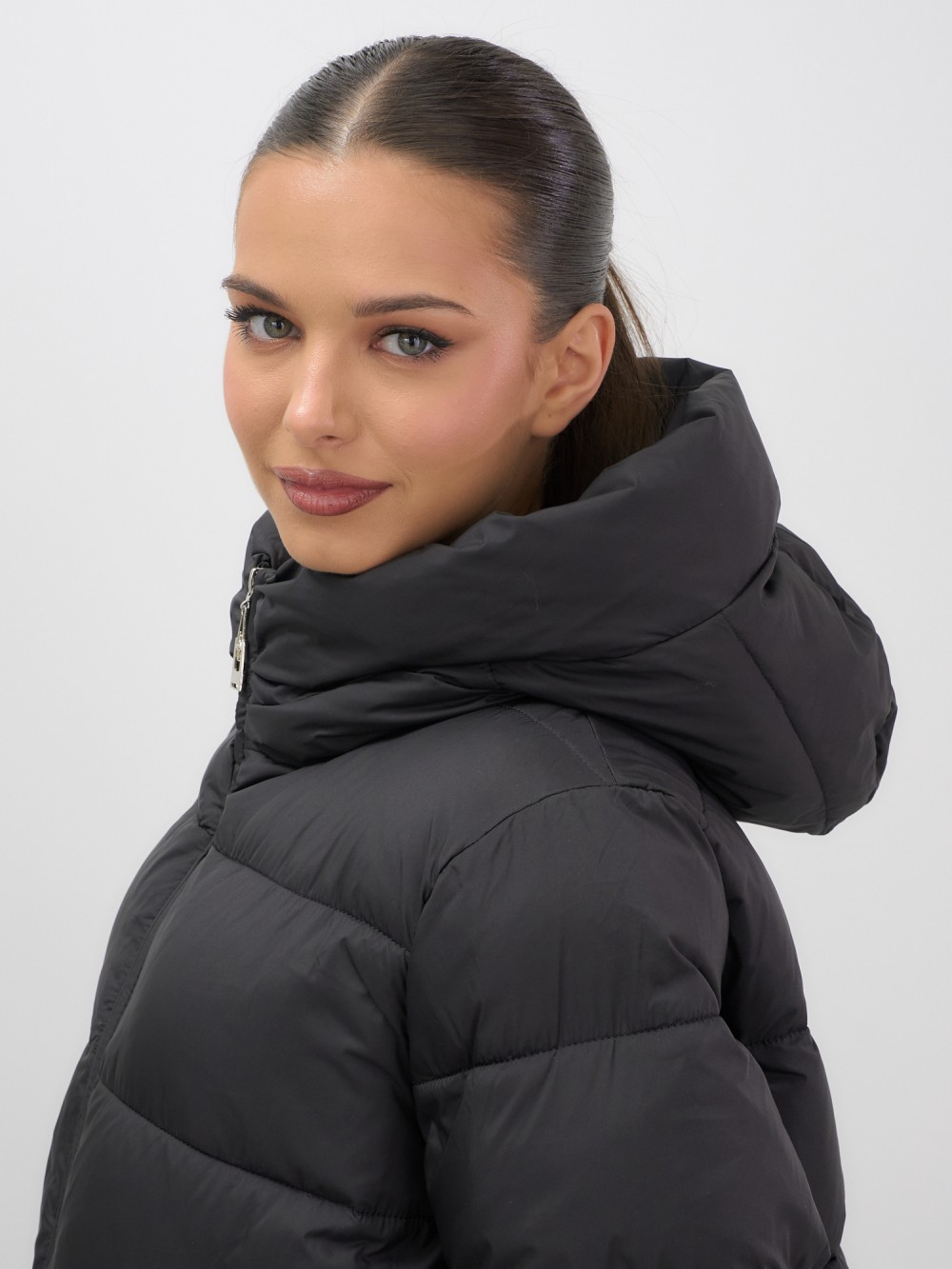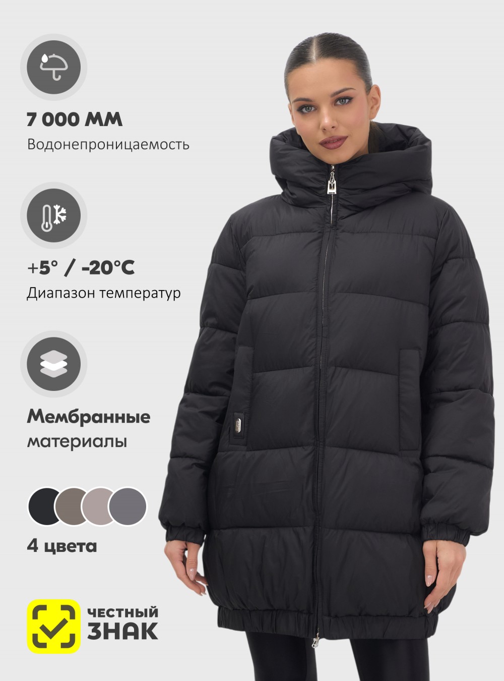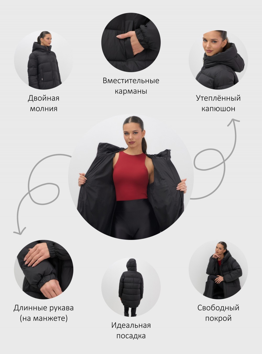 Дополнительные преимущества включают внутренние карманы для удобства, а также дышащий и гипоаллергенный материал, который не вызывает дискомфорта. Съемный воротник и фиксатор на капюшоне добавляют модели элегантности и функциональности.