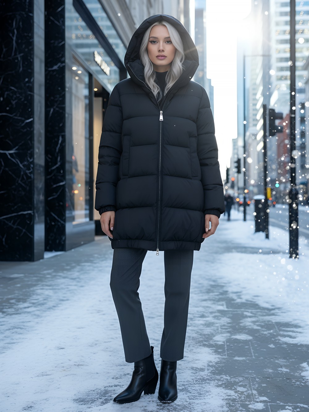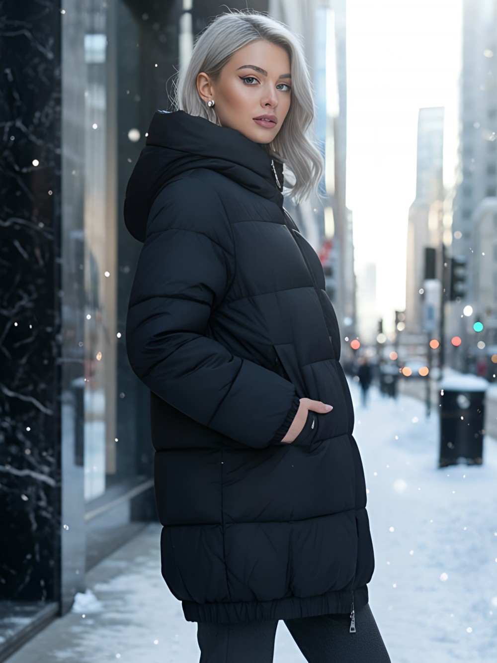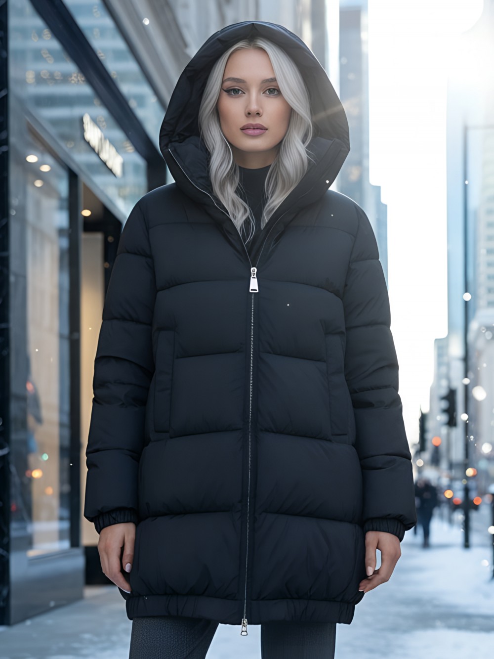 Дополнительные преимущества включают внутренние карманы для удобства, а также дышащий и гипоаллергенный материал, который не вызывает дискомфорта. Съемный воротник и фиксатор на капюшоне добавляют модели элегантности и функциональности.