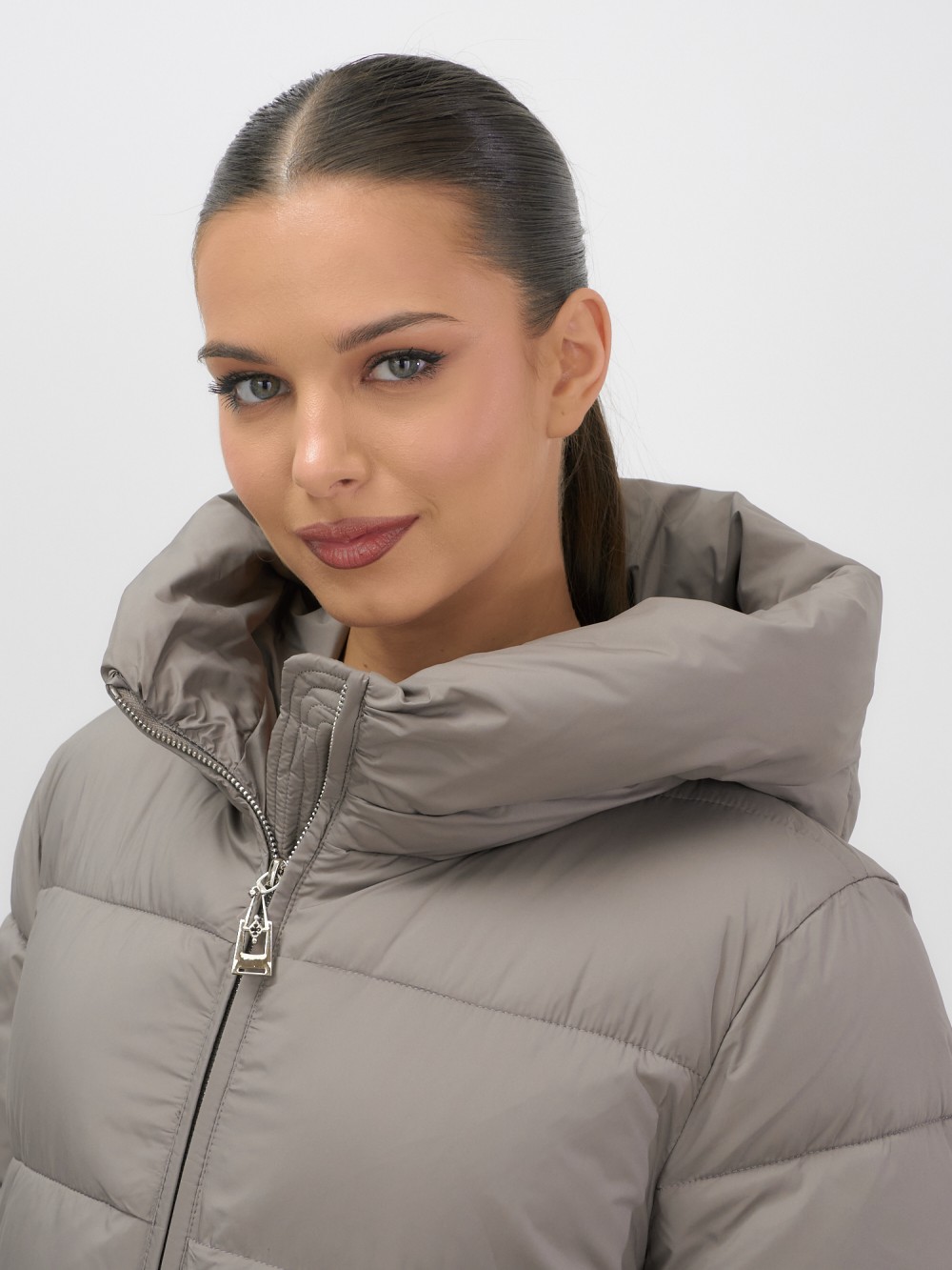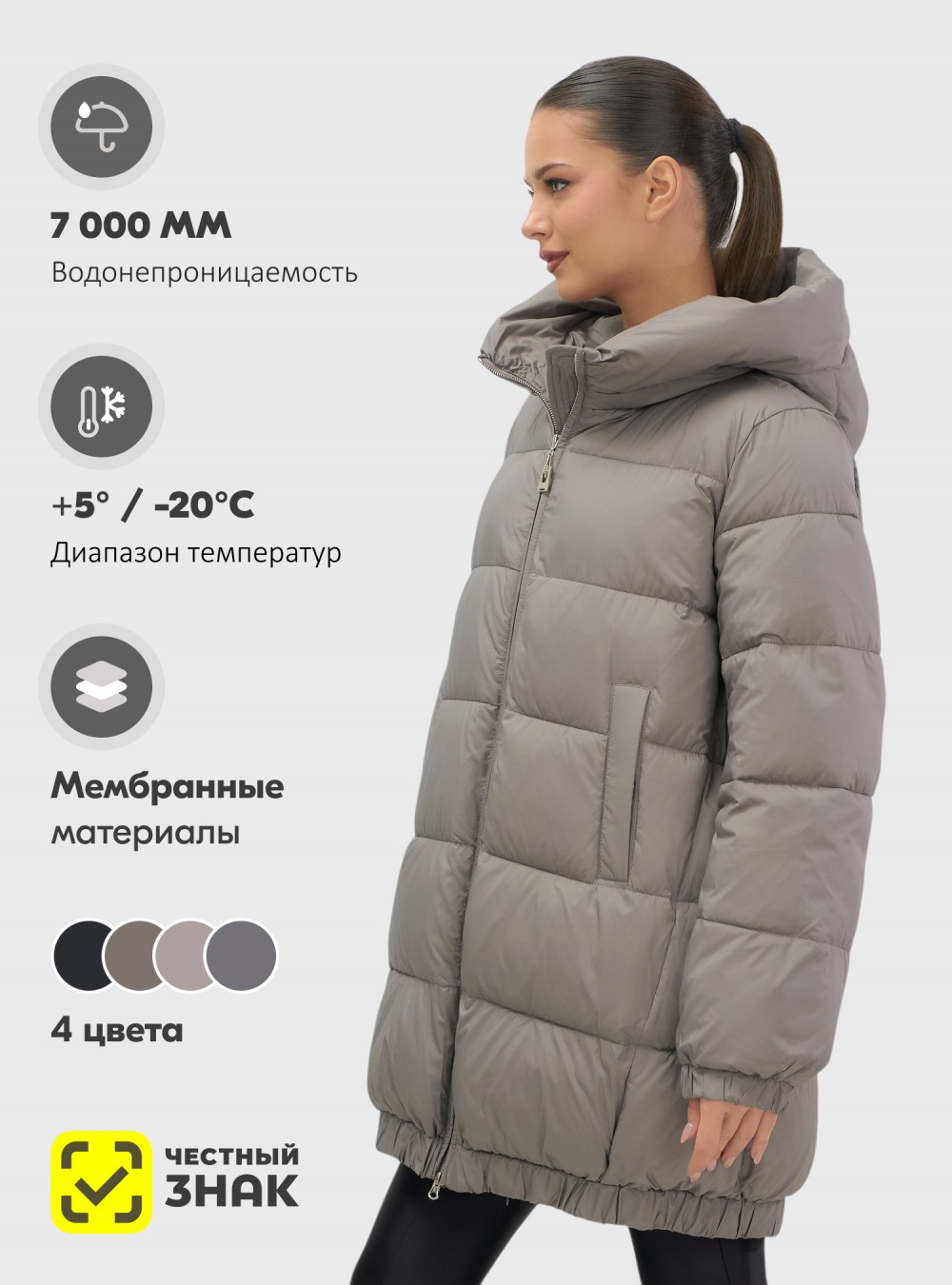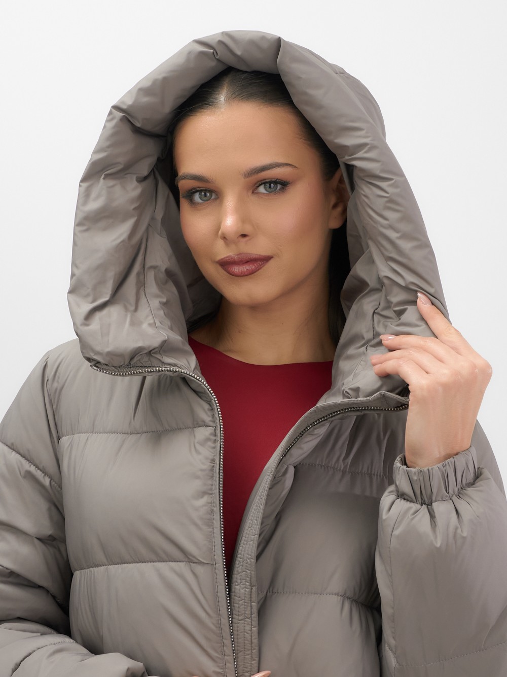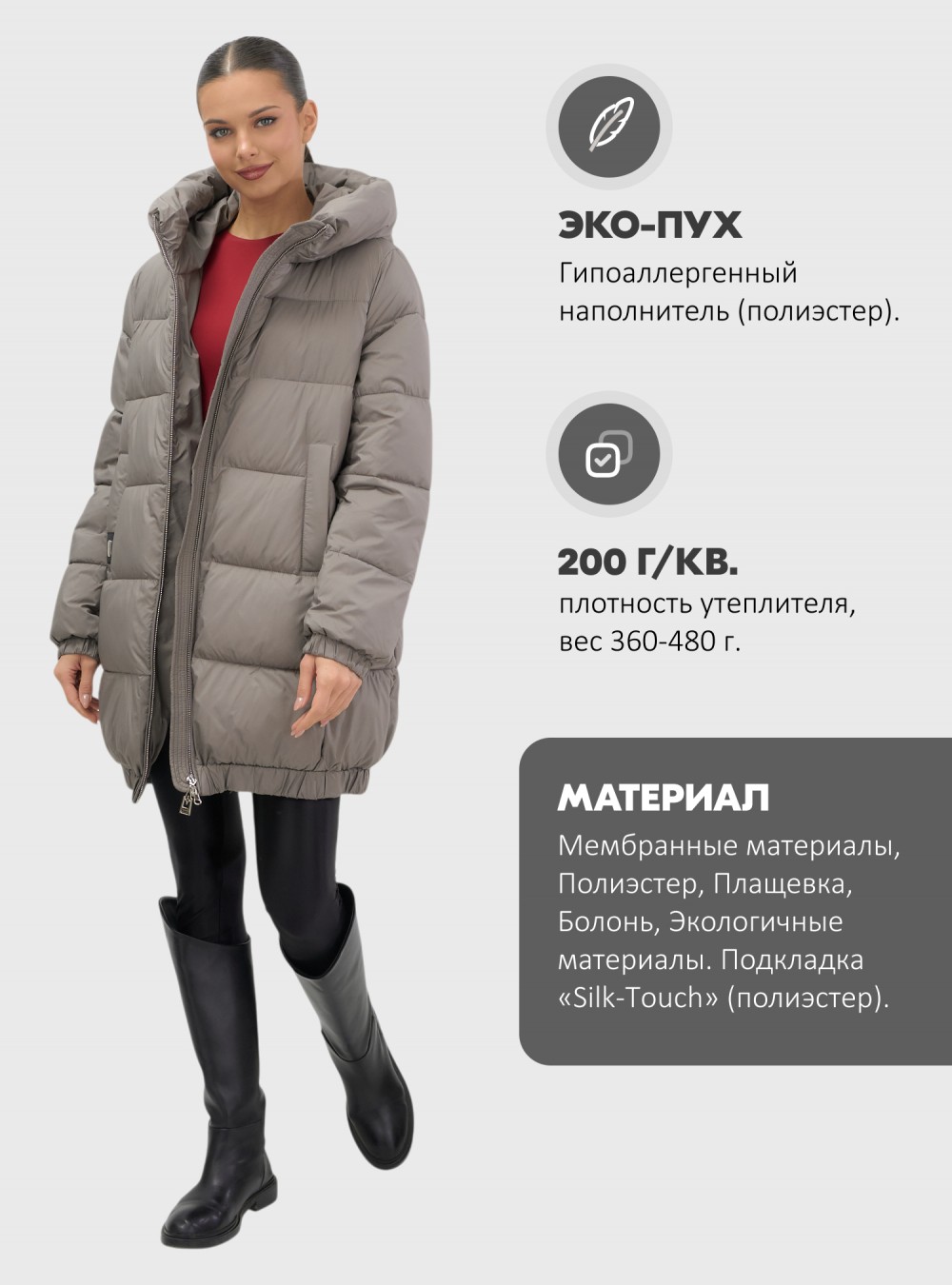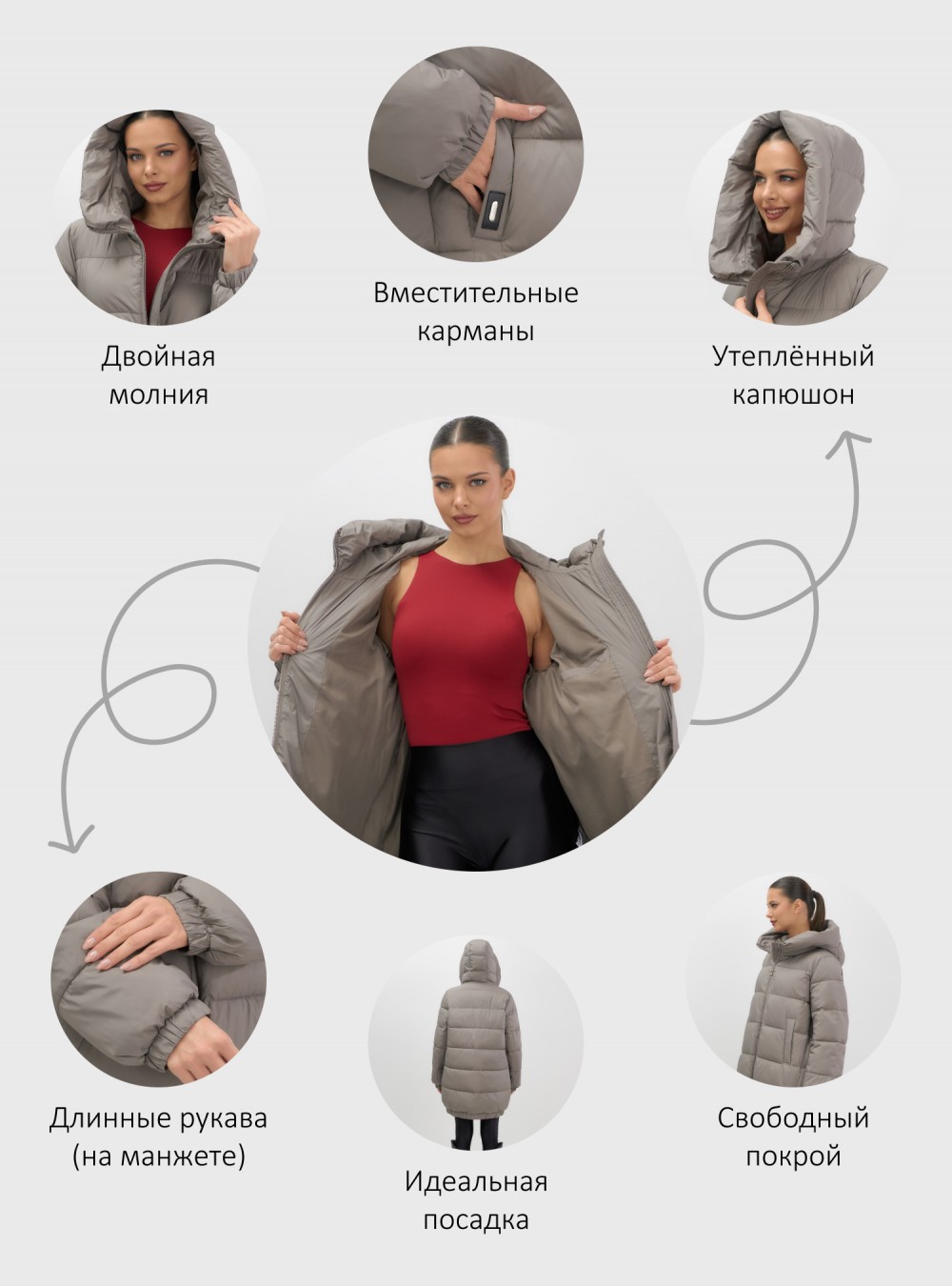 Дополнительные преимущества включают внутренние карманы для удобства, а также дышащий и гипоаллергенный материал, который не вызывает дискомфорта. Съемный воротник и фиксатор на капюшоне добавляют модели элегантности и функциональности.