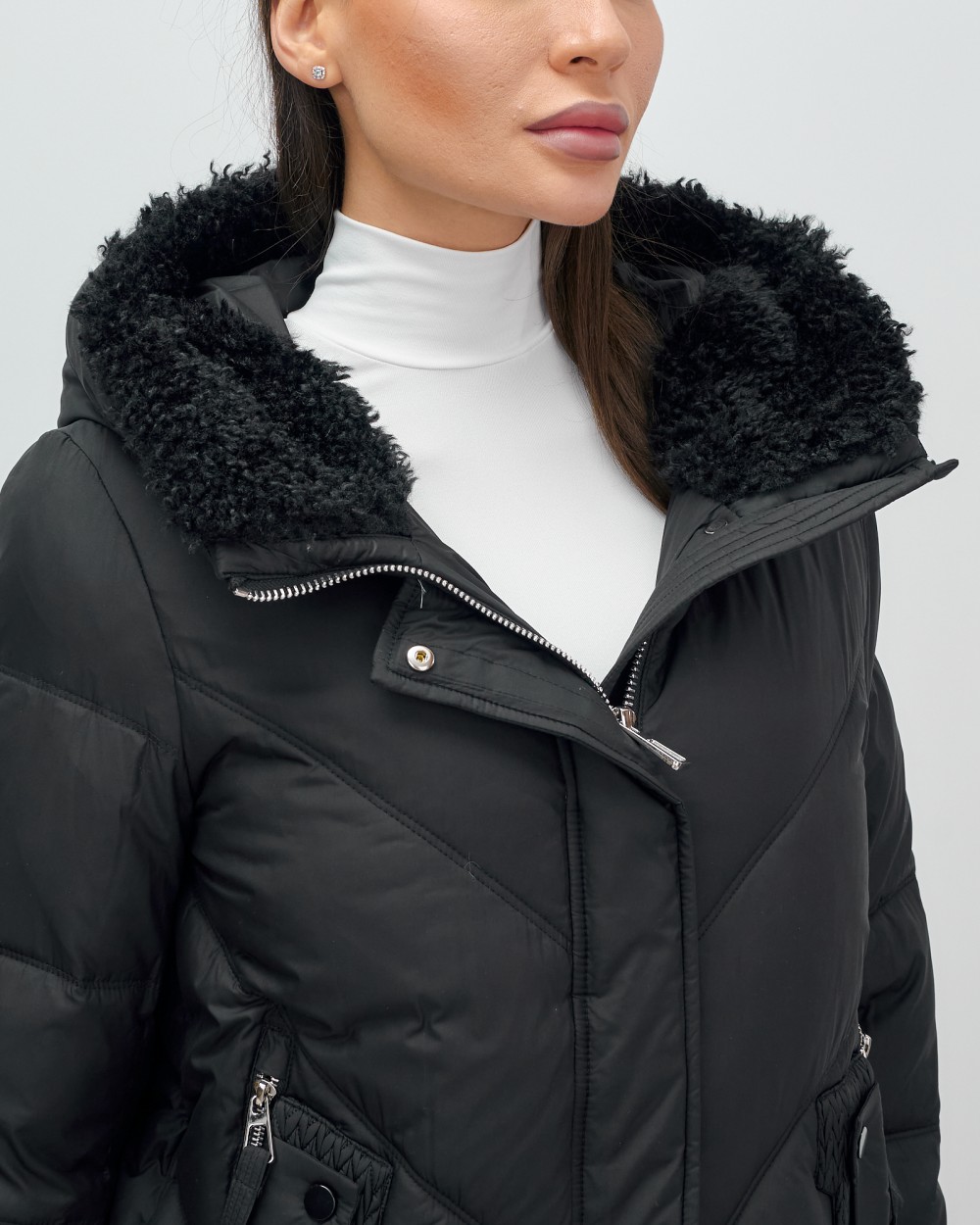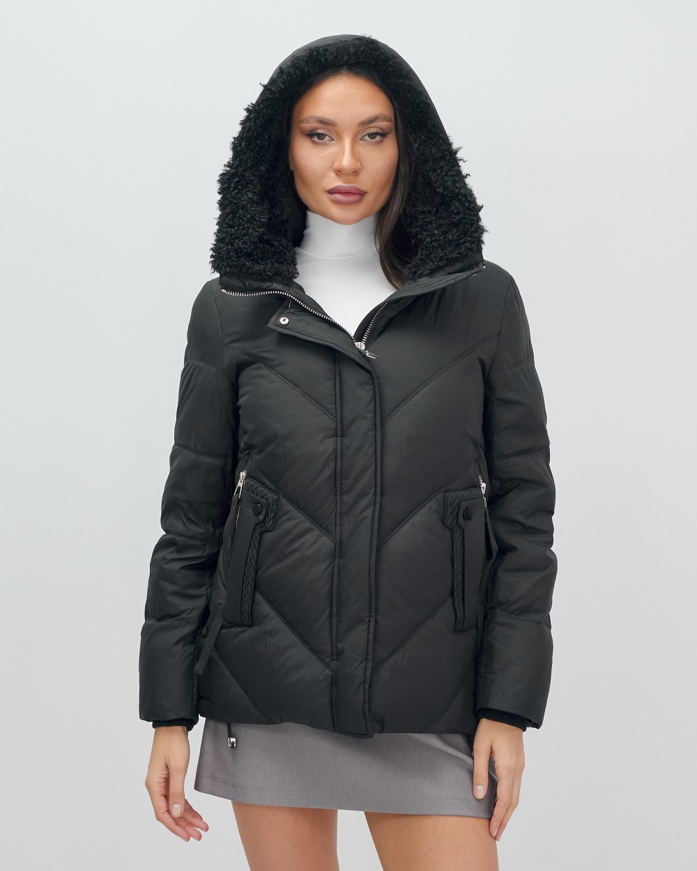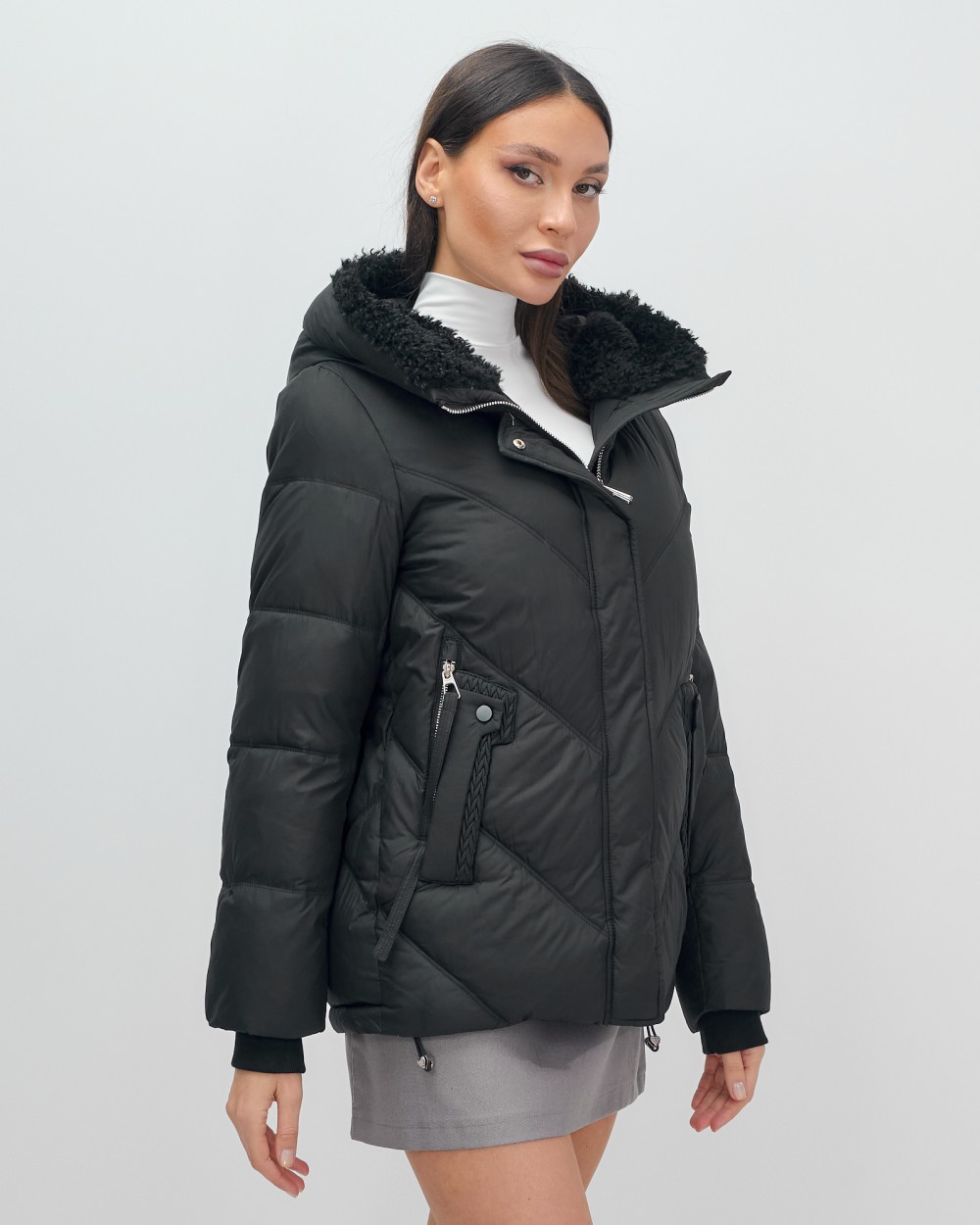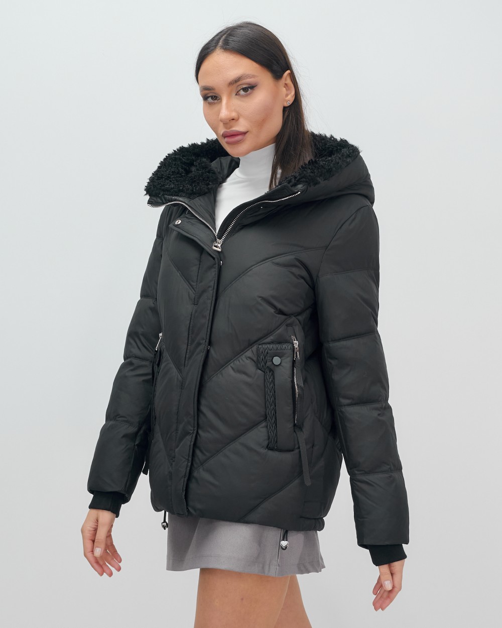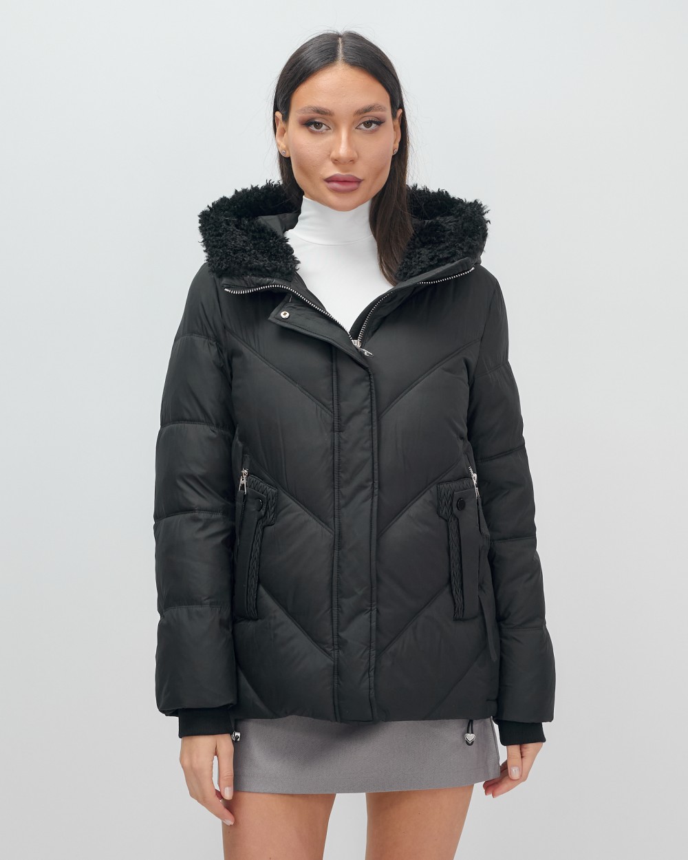 Куртка зимняя женская из овчина стильная и модная черного цвета 7348Ch
