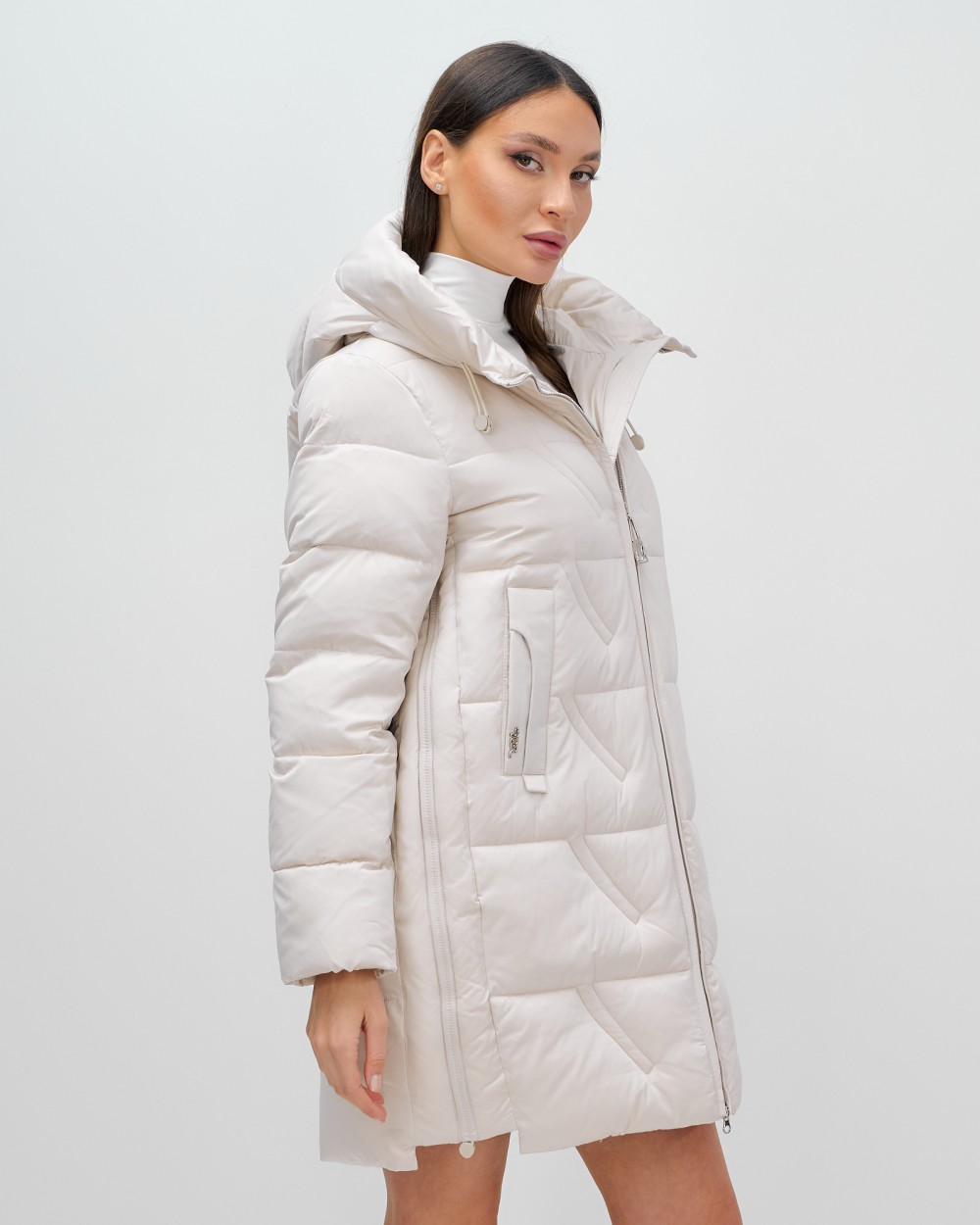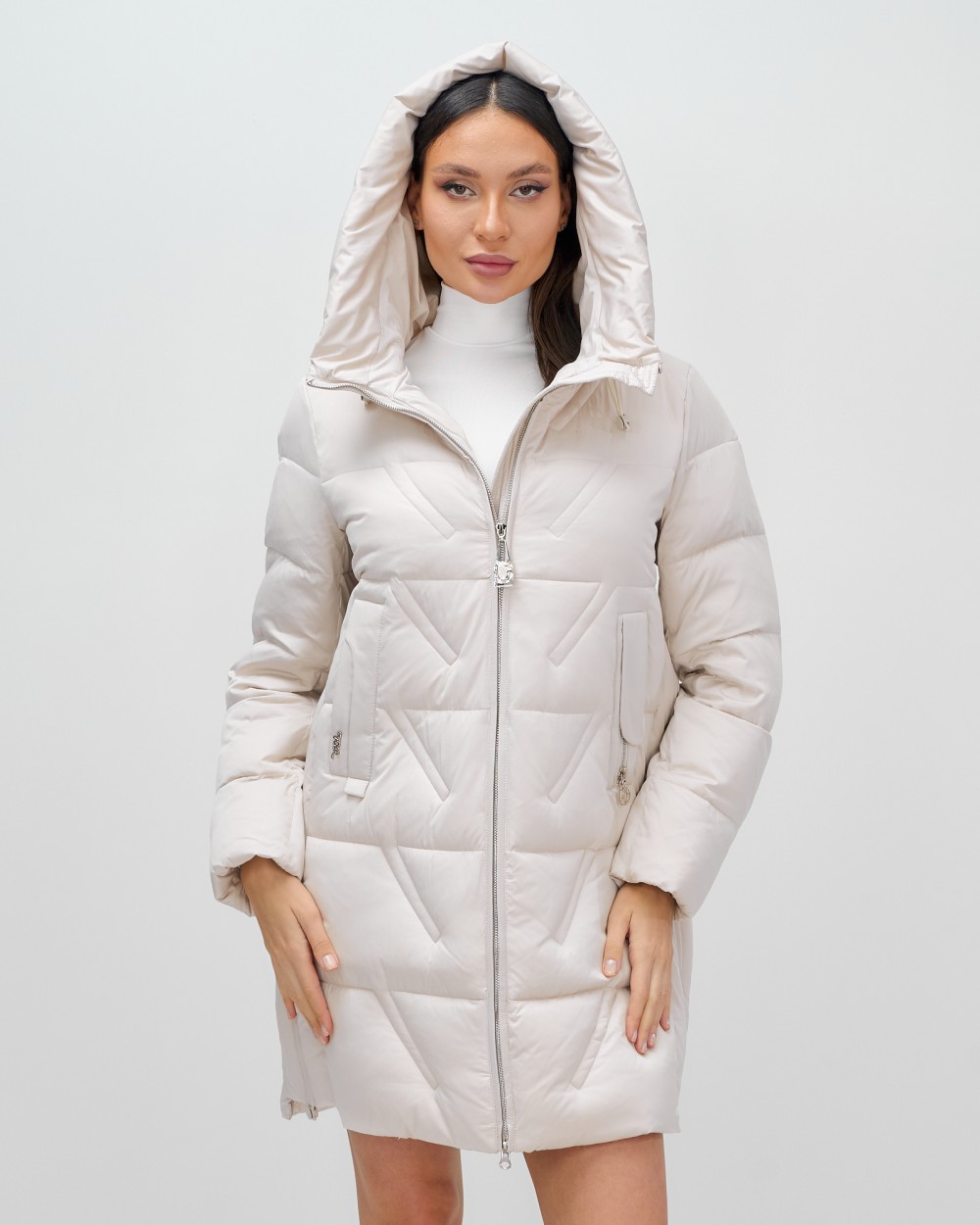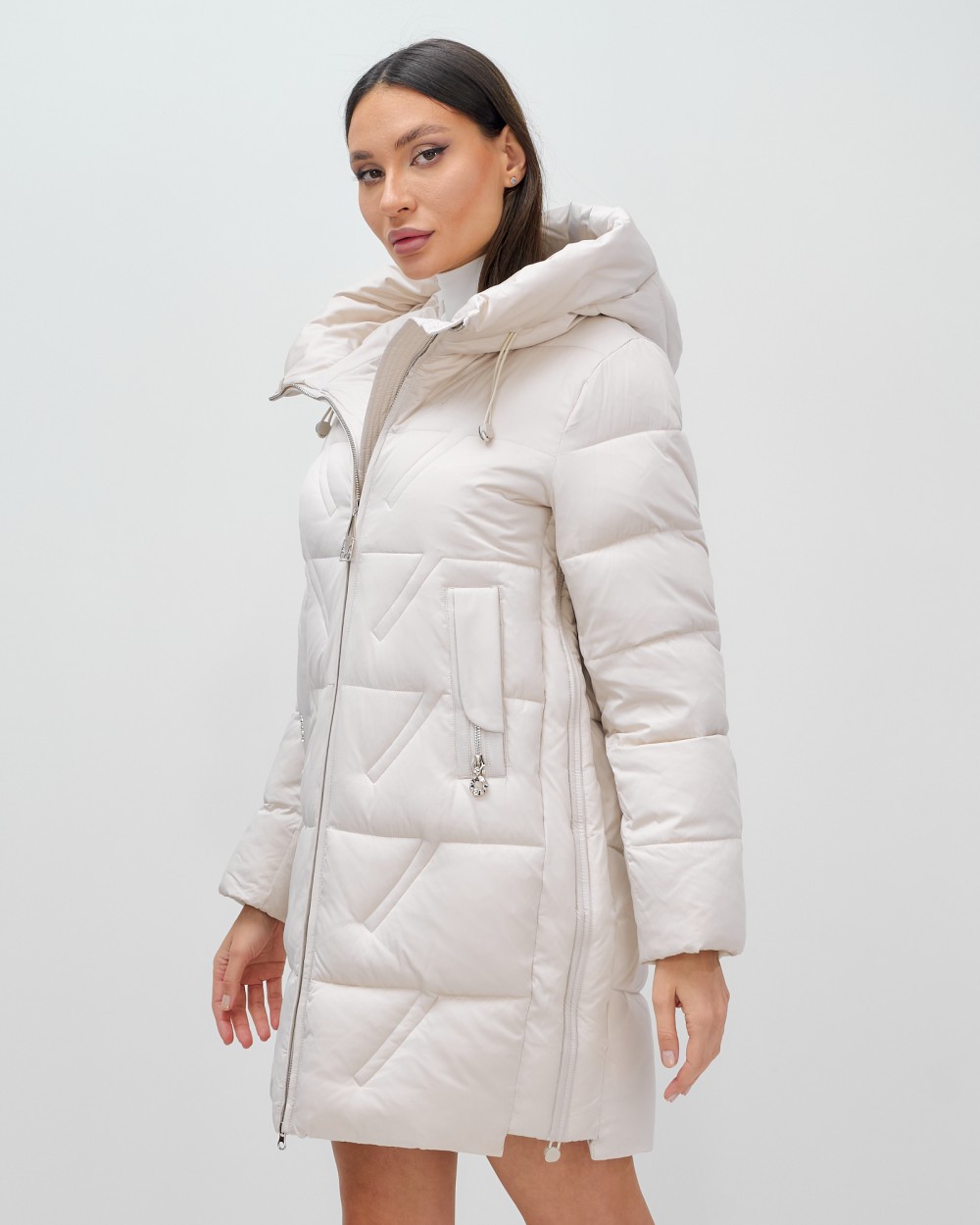 Куртка зимняя женская классическая с капюшоном бежевого цвета 7671B
