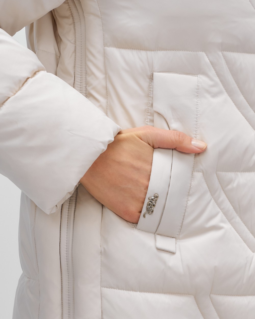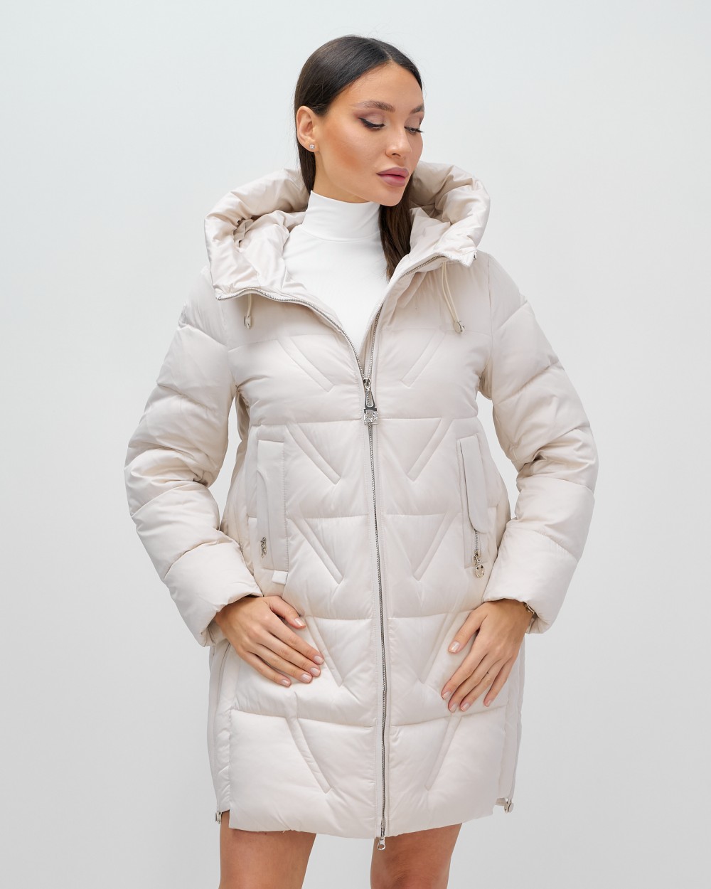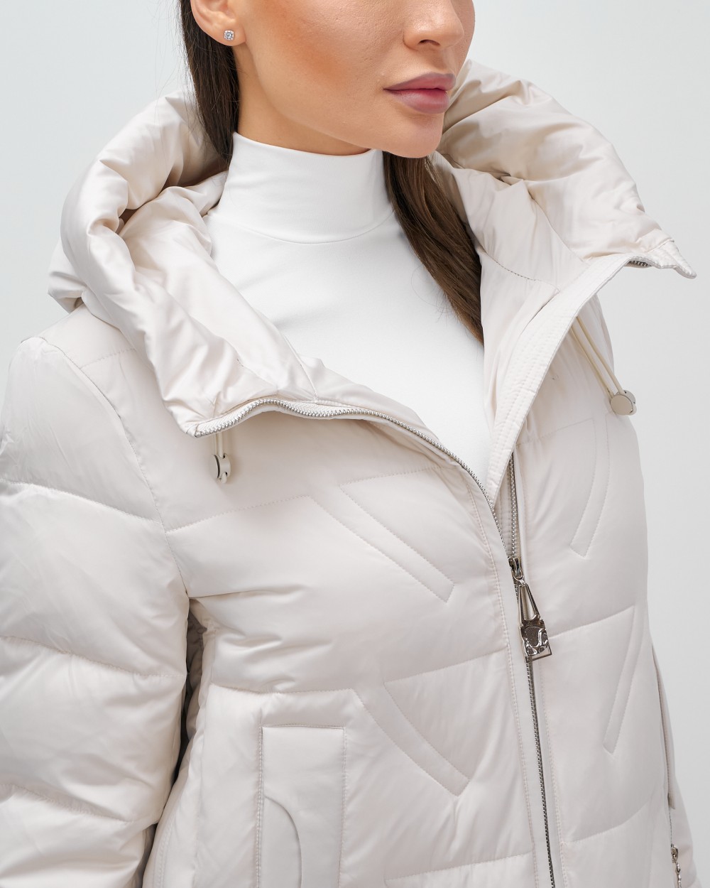 Куртка зимняя женская классическая с капюшоном бежевого цвета 7671B