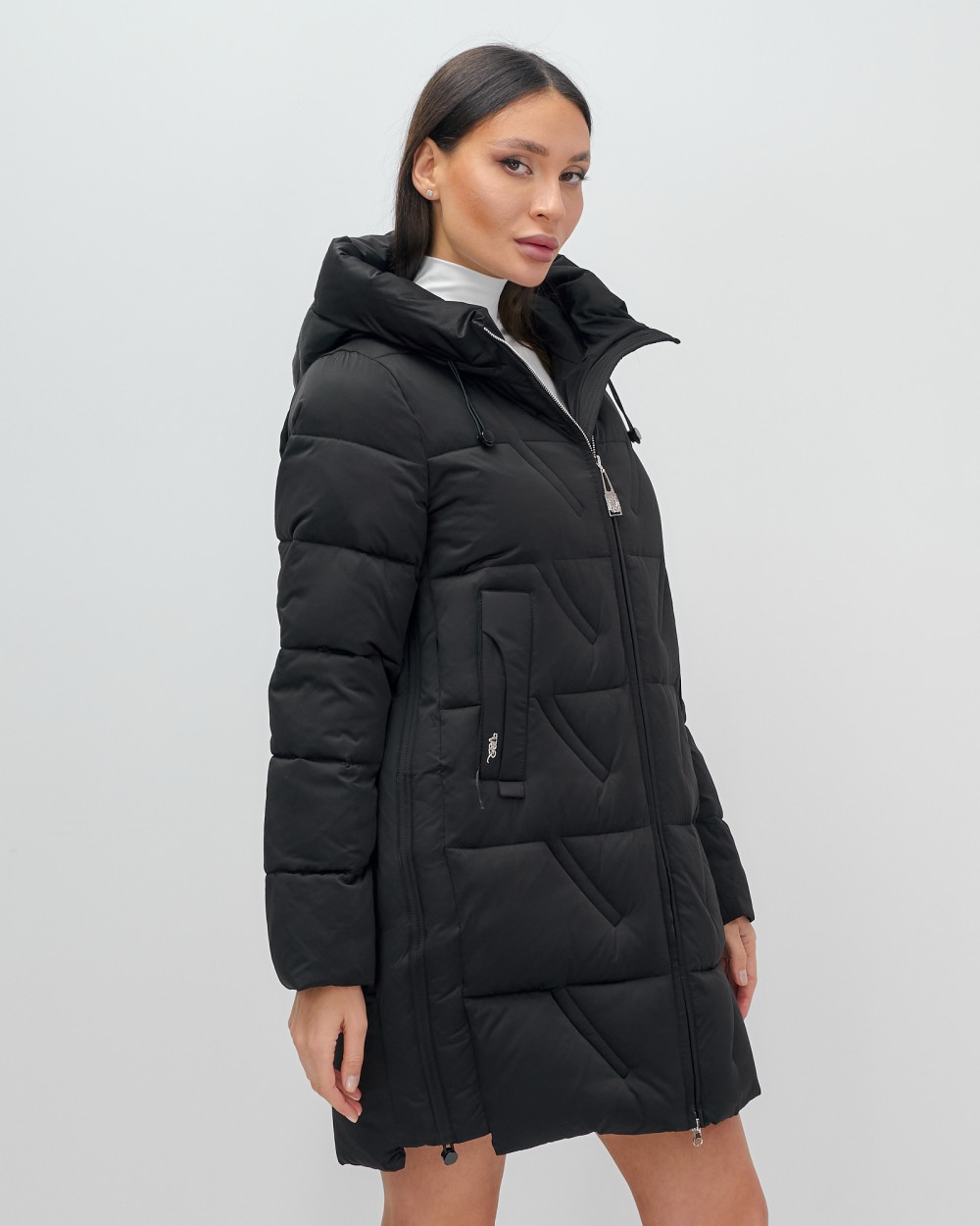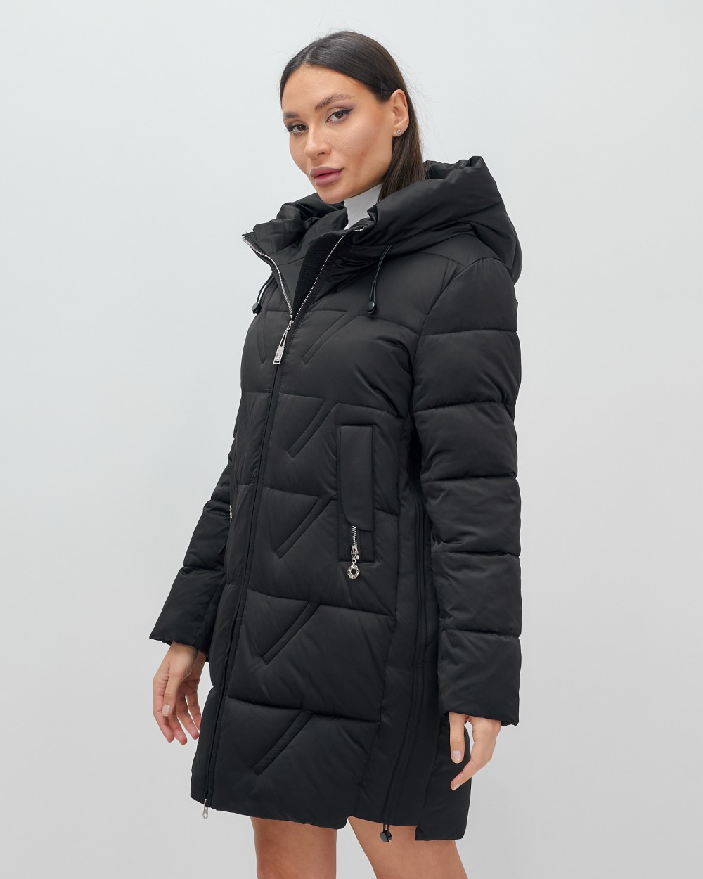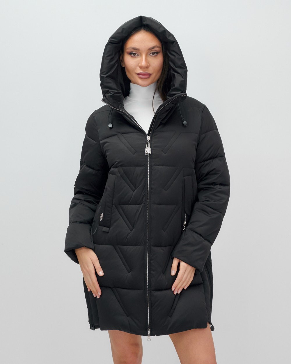 Куртка зимняя женская классическая с капюшоном черного цвета 7671Ch