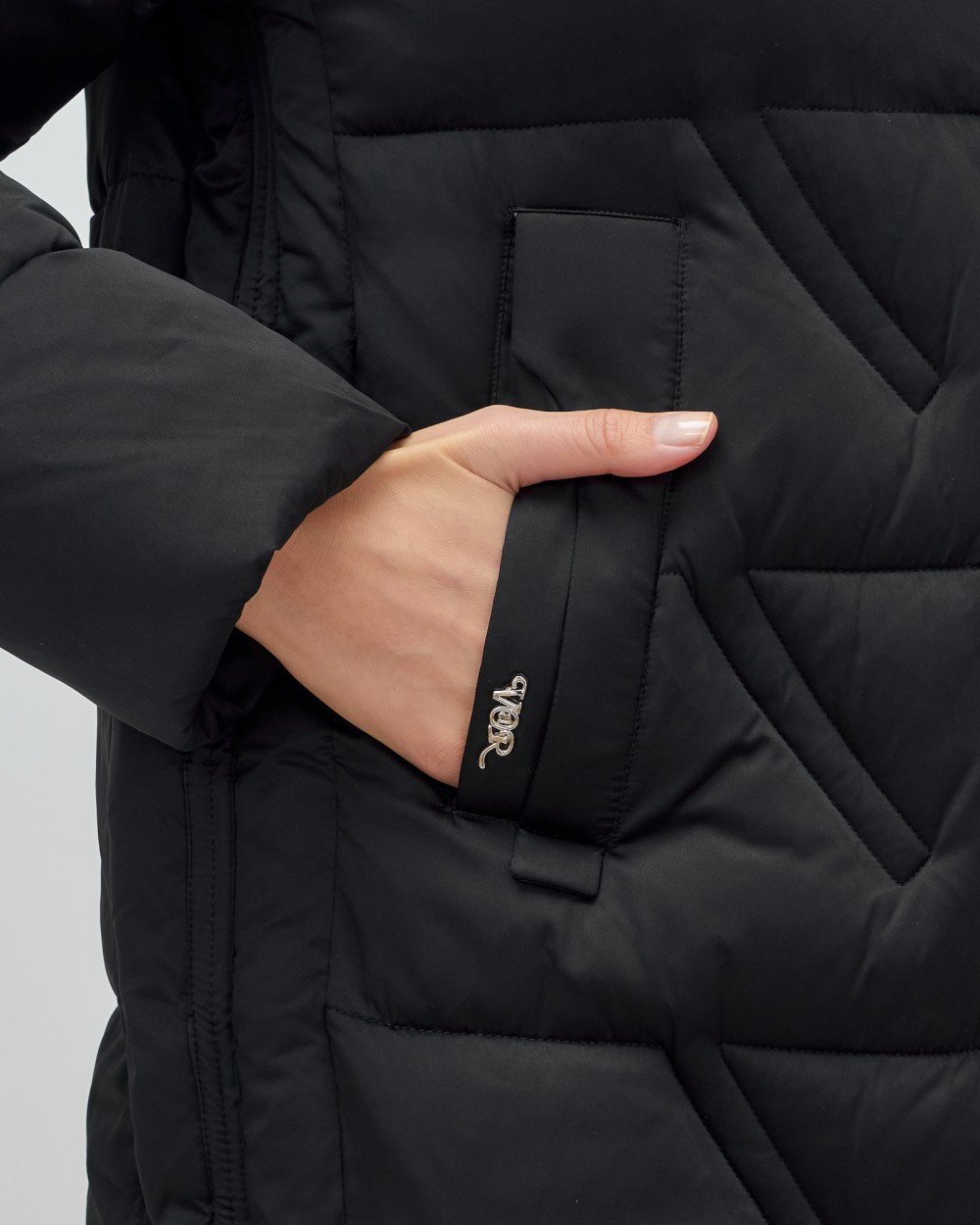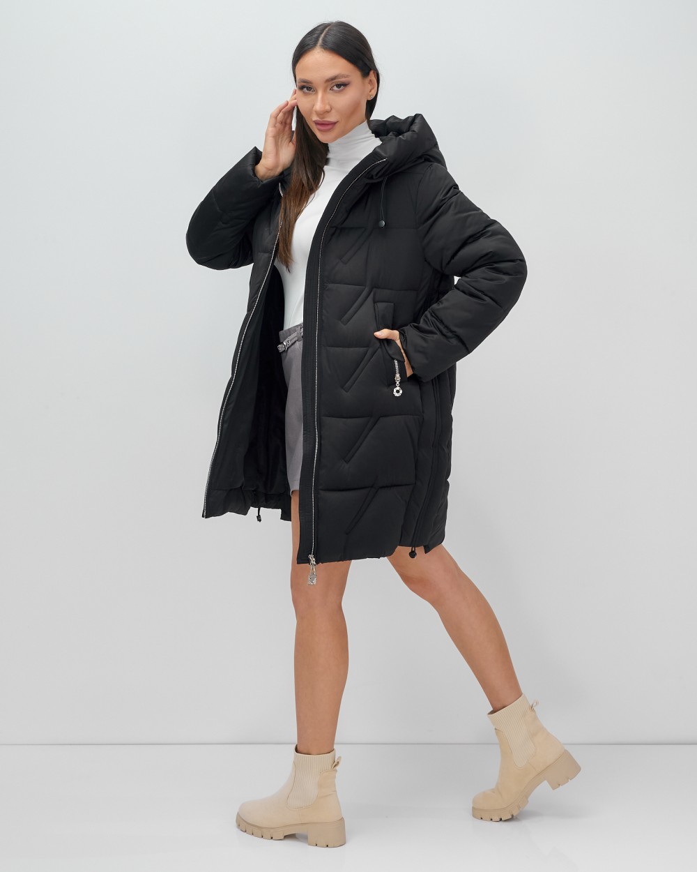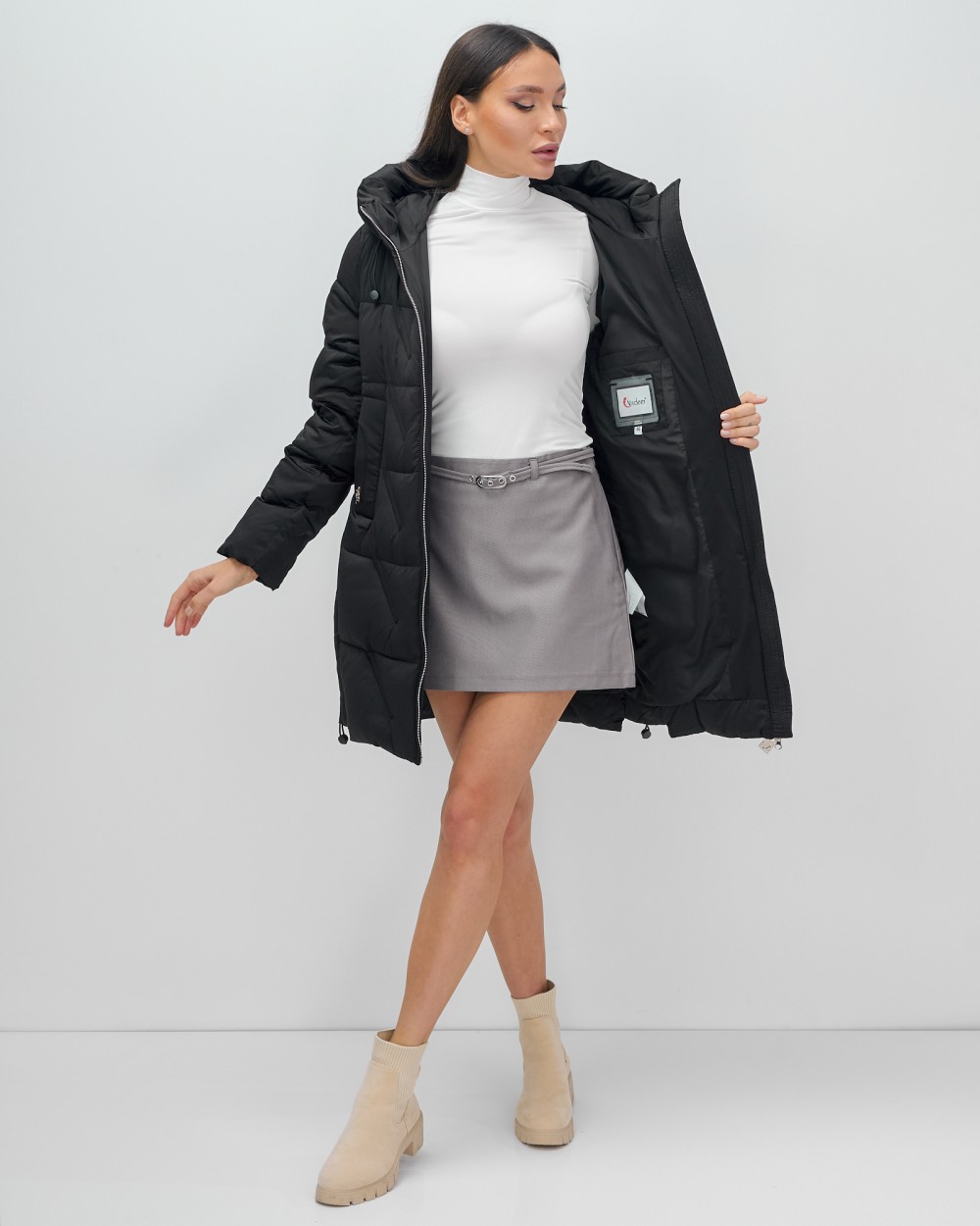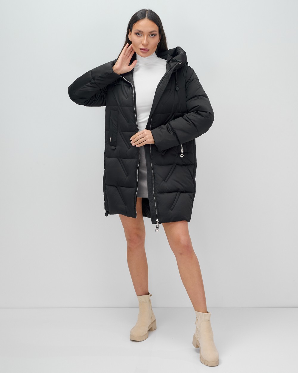 Куртка зимняя женская классическая с капюшоном черного цвета 7671Ch