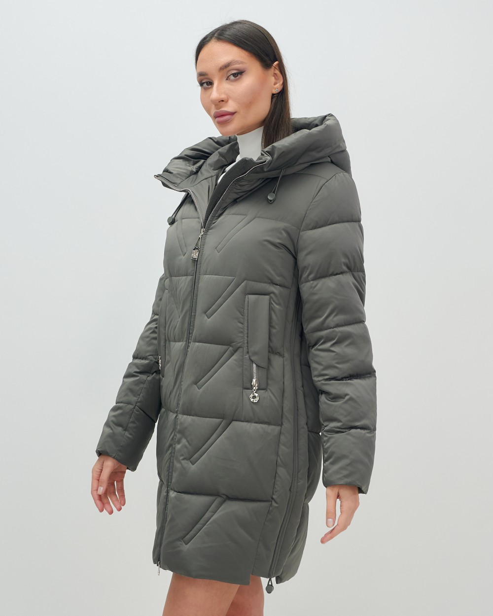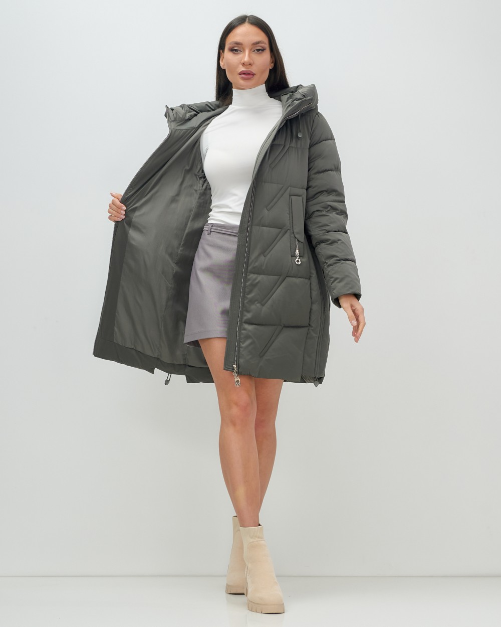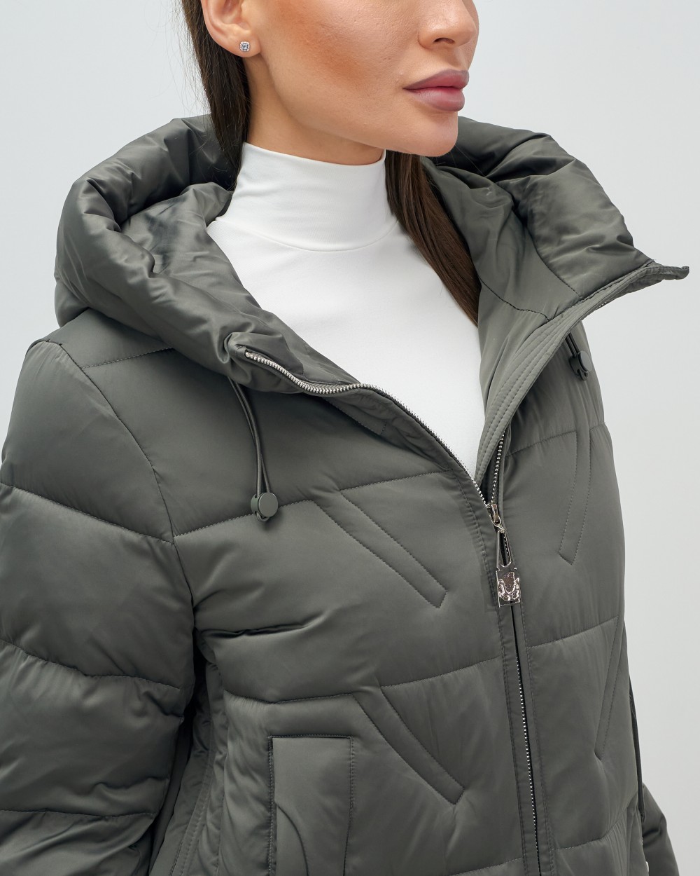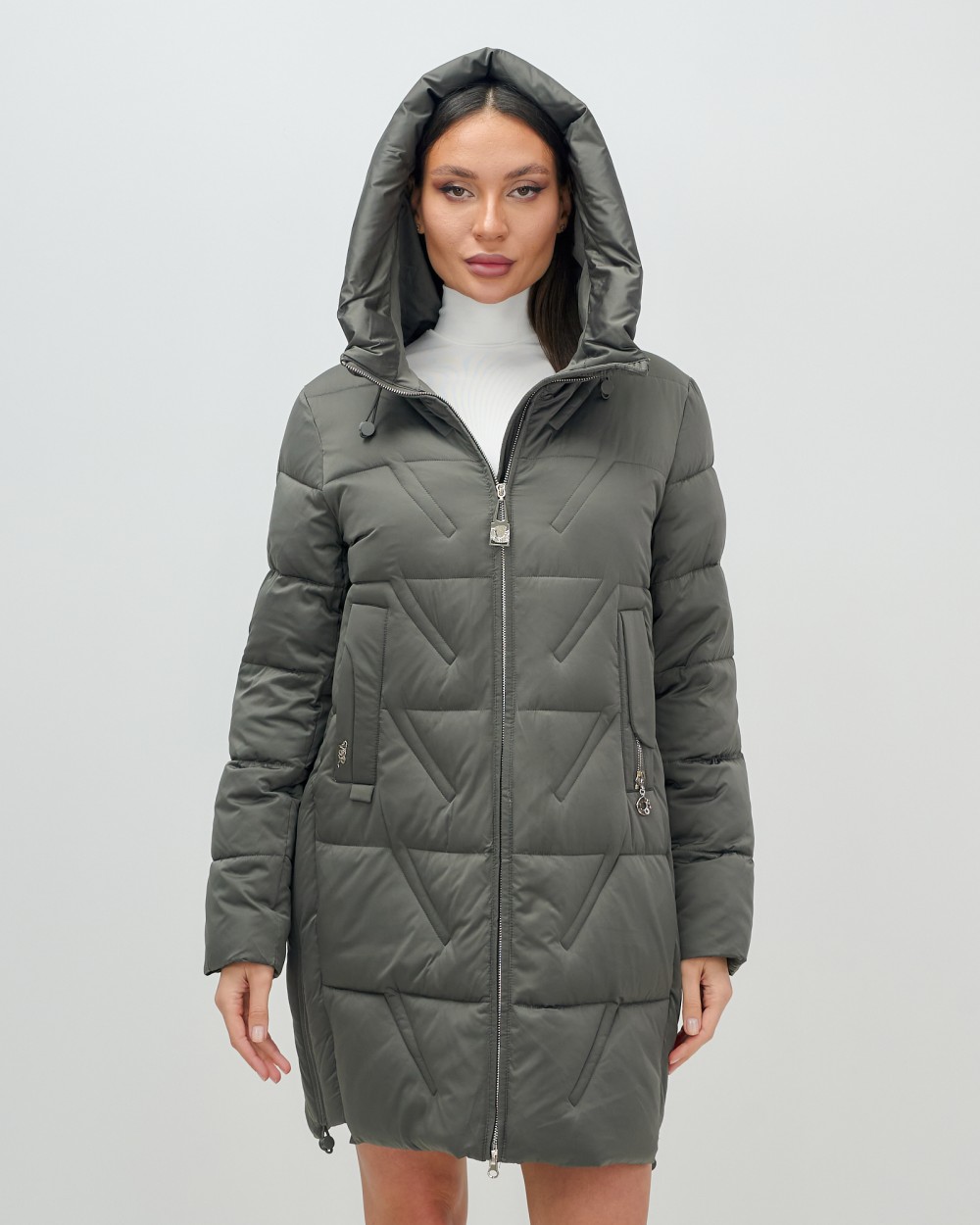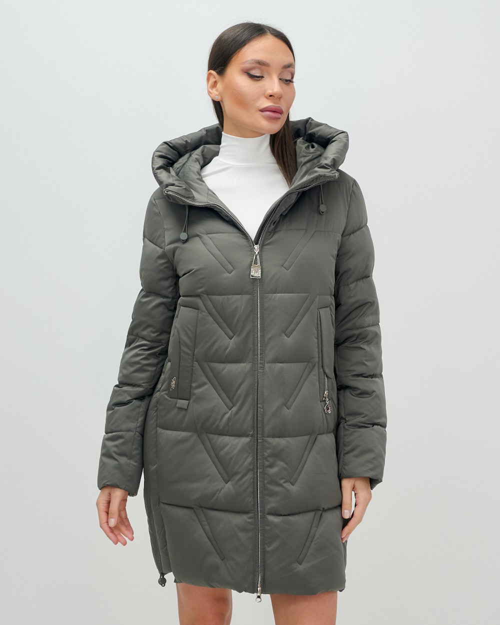 Куртка зимняя женская классическая с капюшоном темно-серого цвета 7671TC