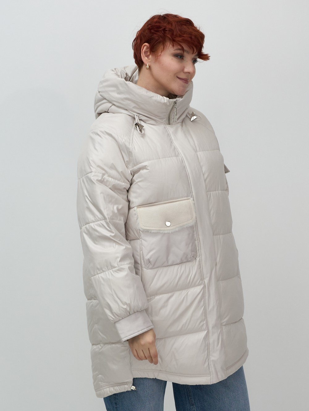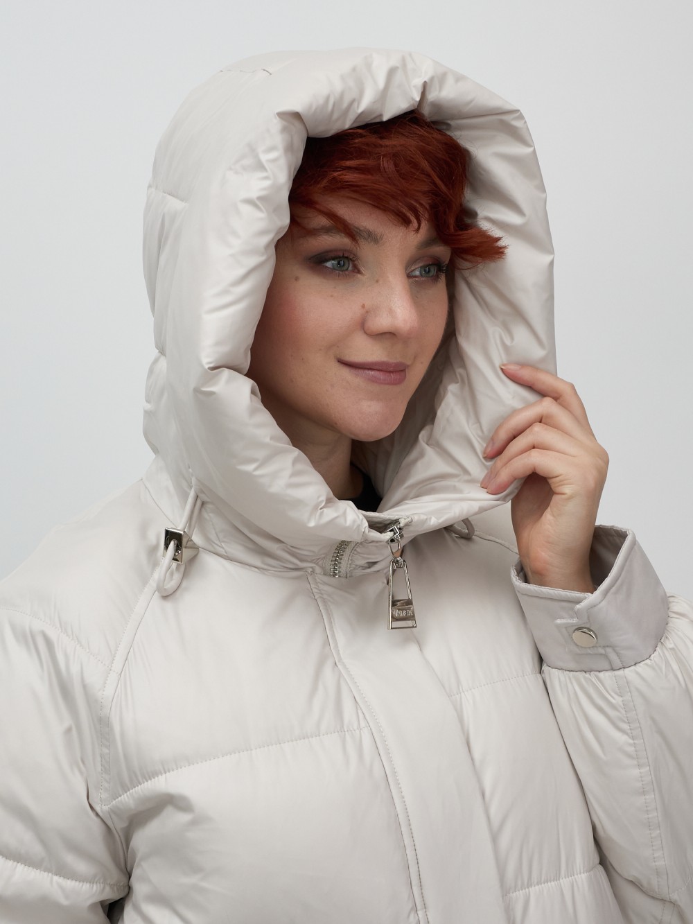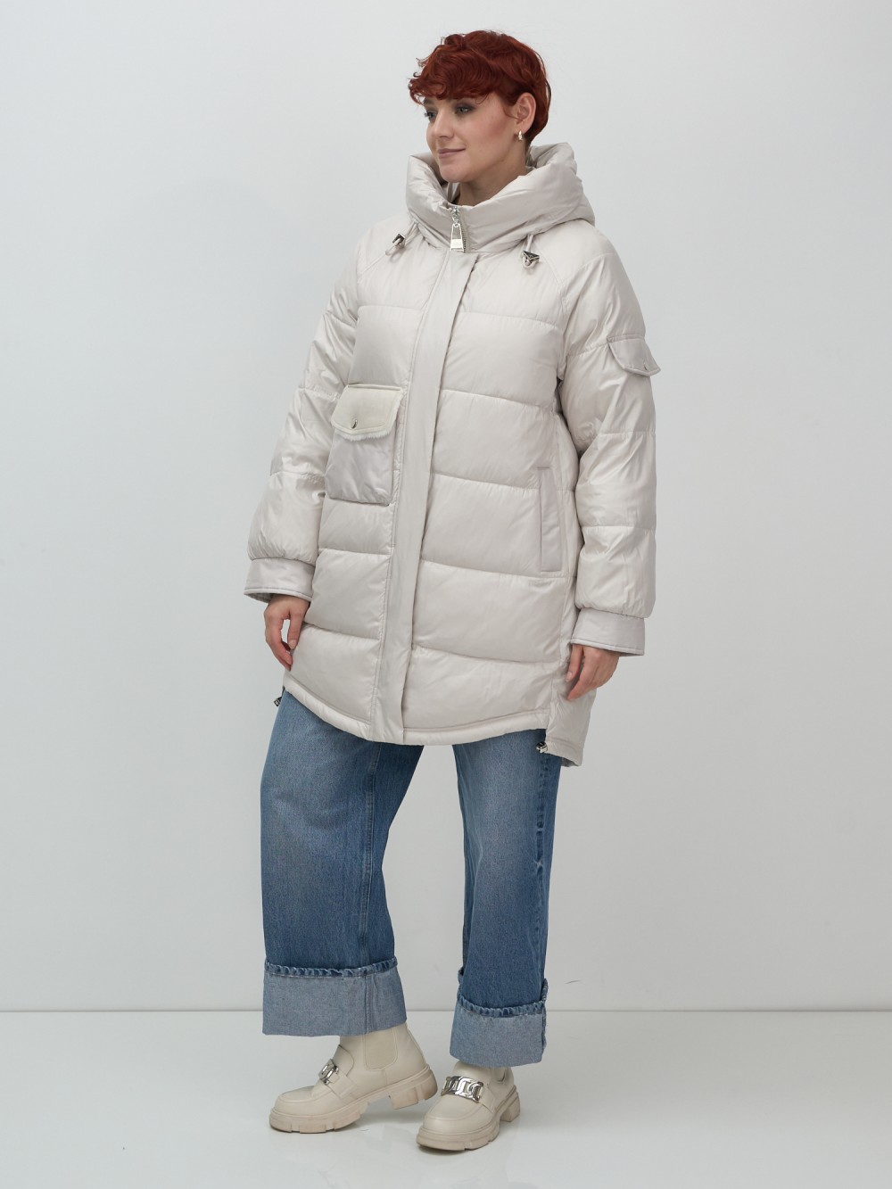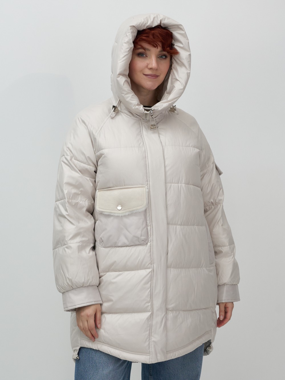 Куртка зимняя женская с капюшоном модная бежевого цвета 7341B