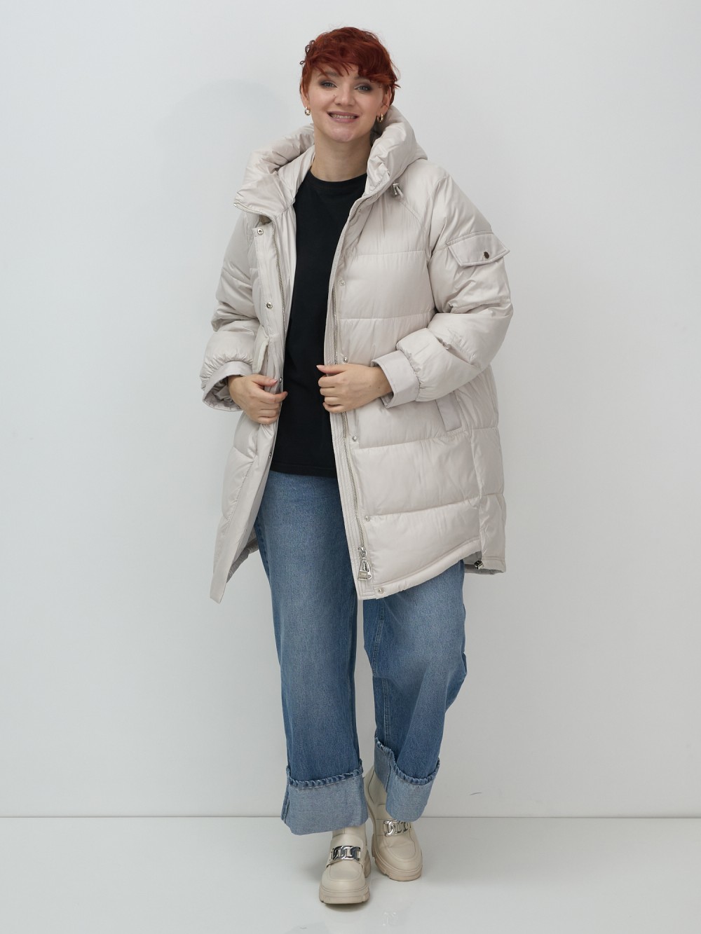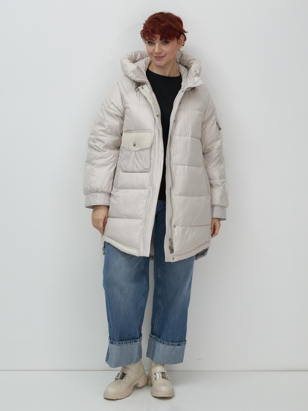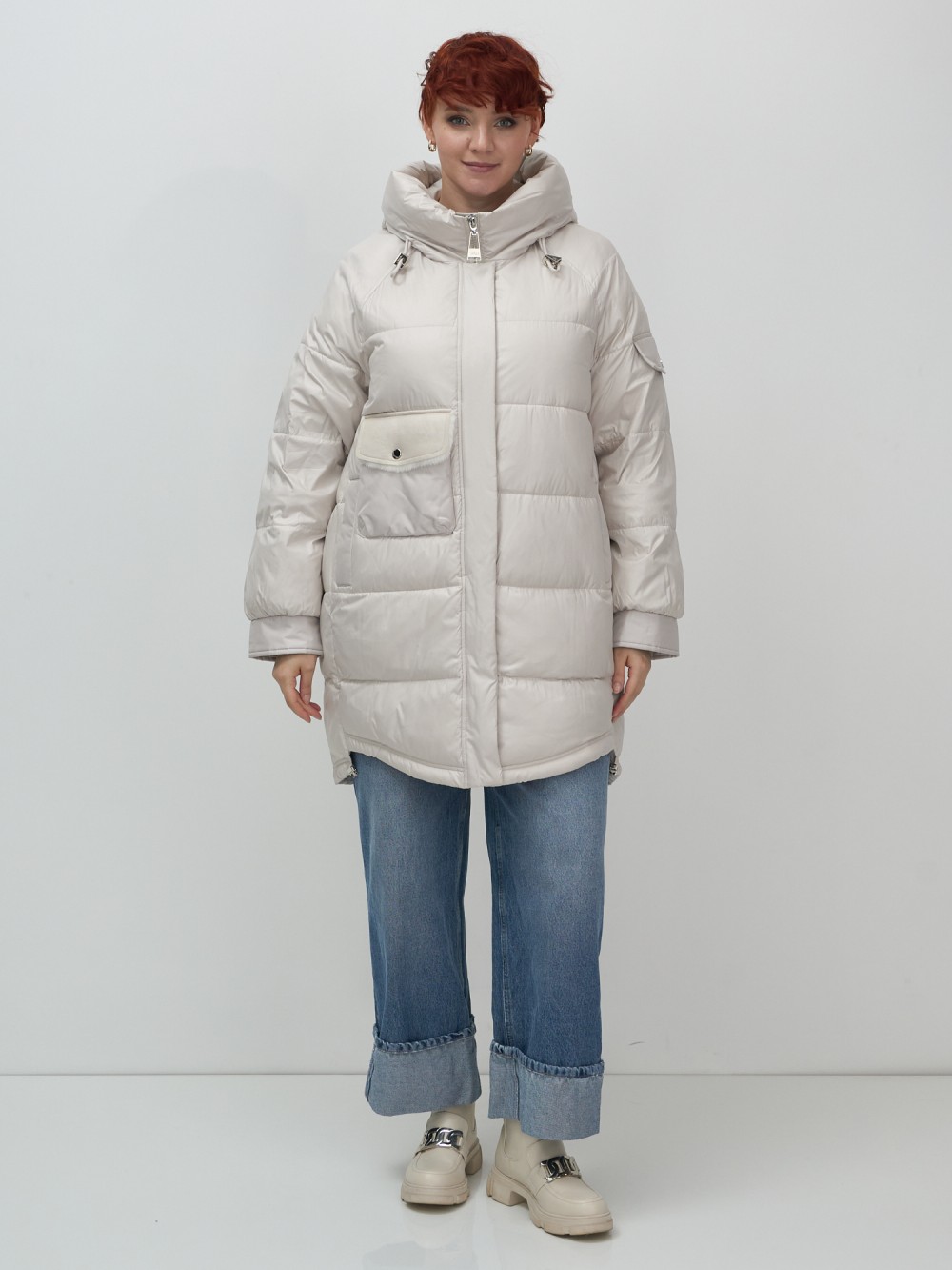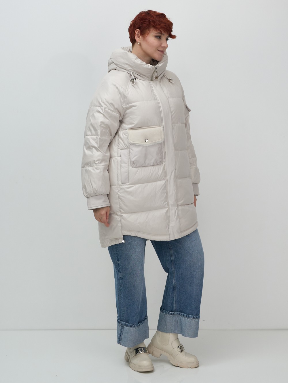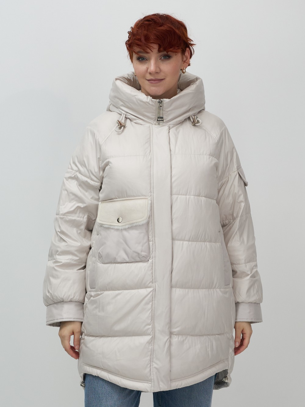 Куртка зимняя женская с капюшоном модная бежевого цвета 7341B