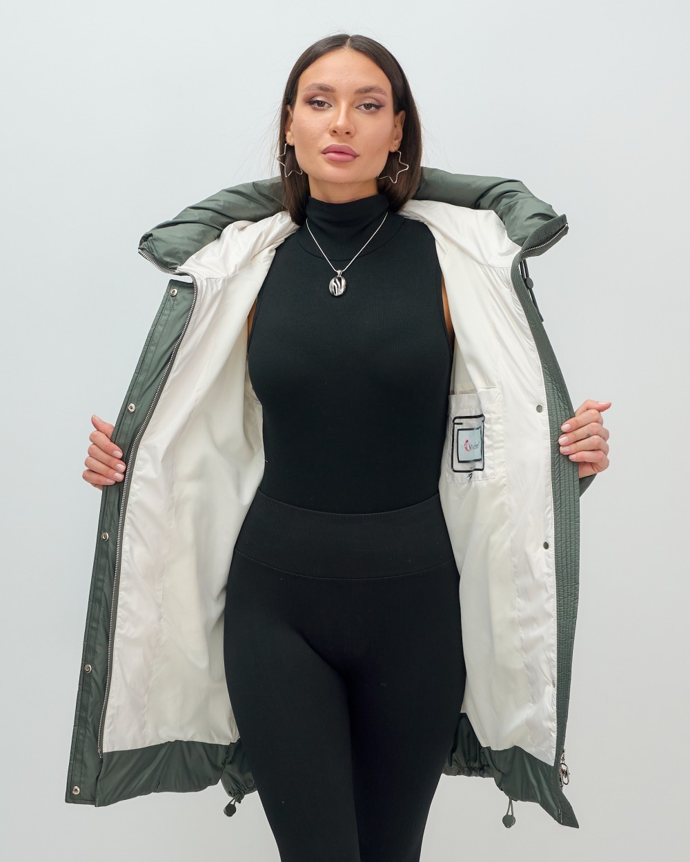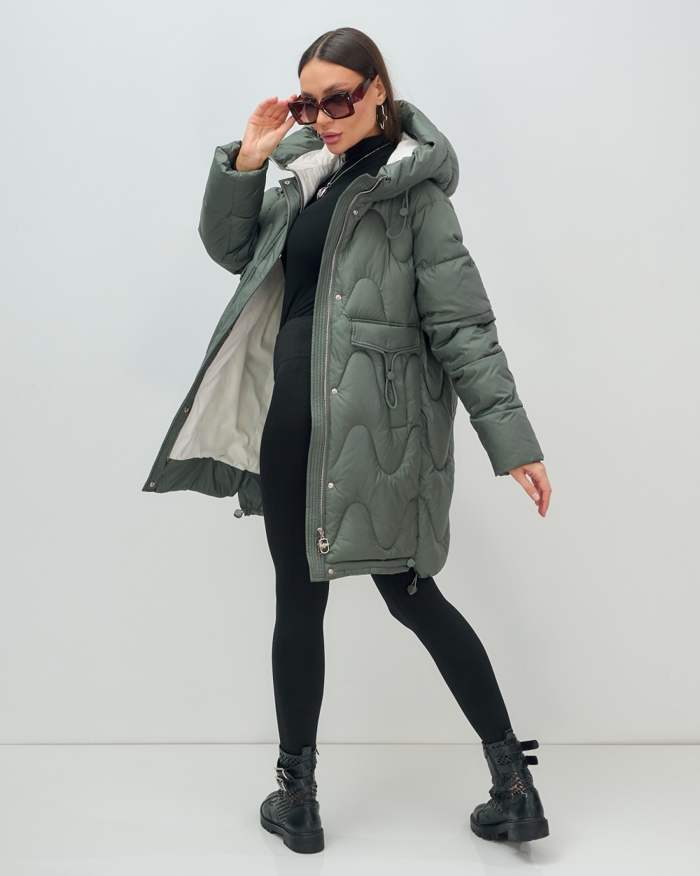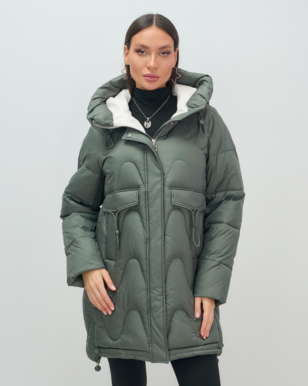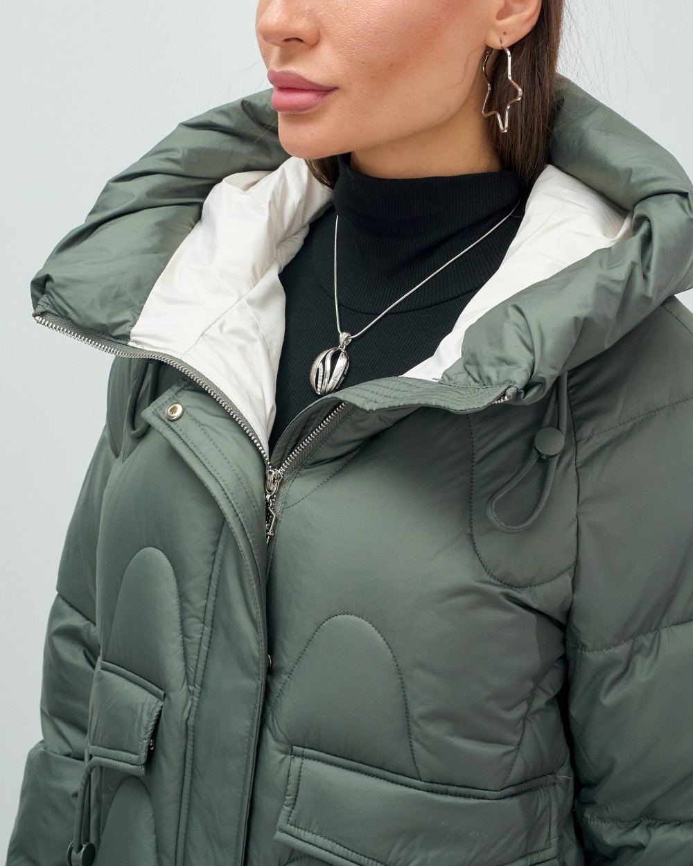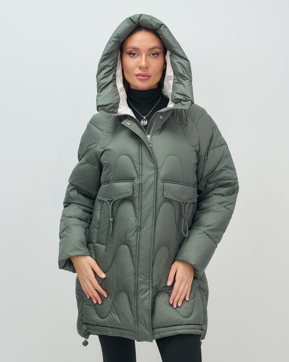 Куртка зимняя женская с капюшоном модная цвета хаки 7653Kh