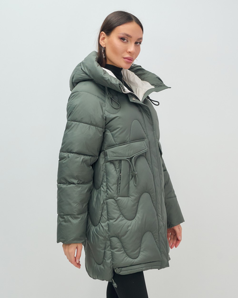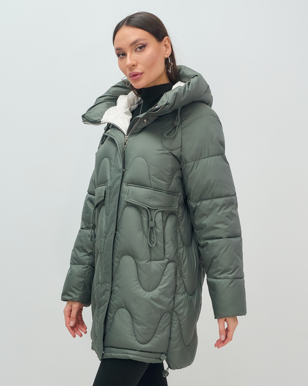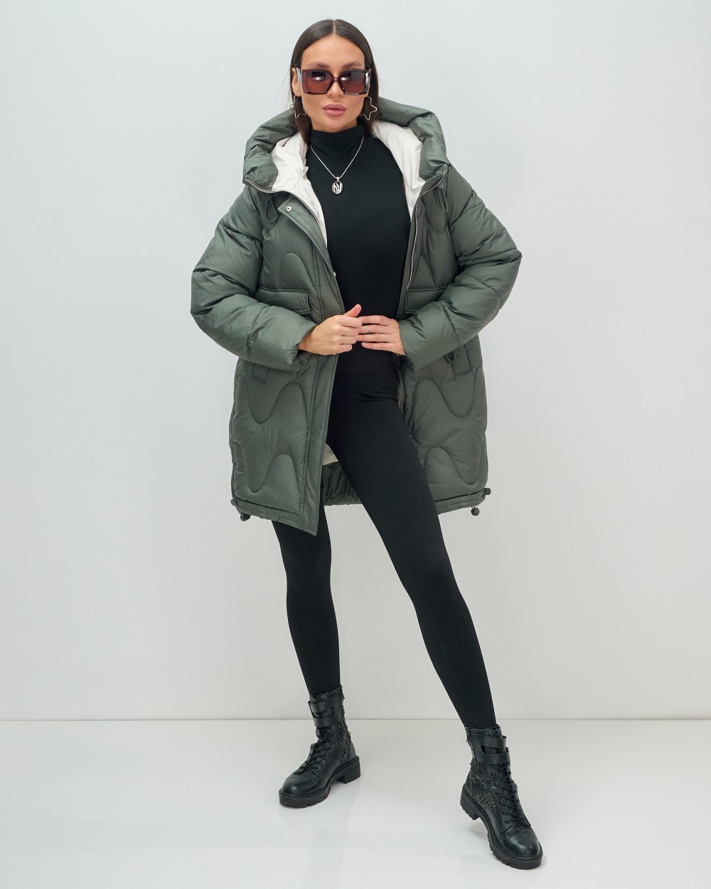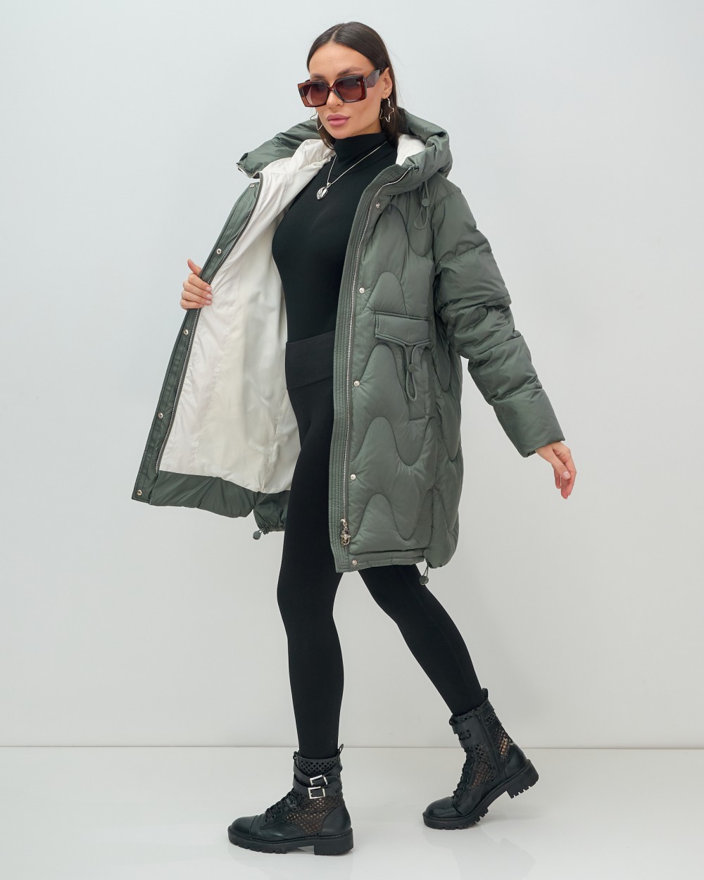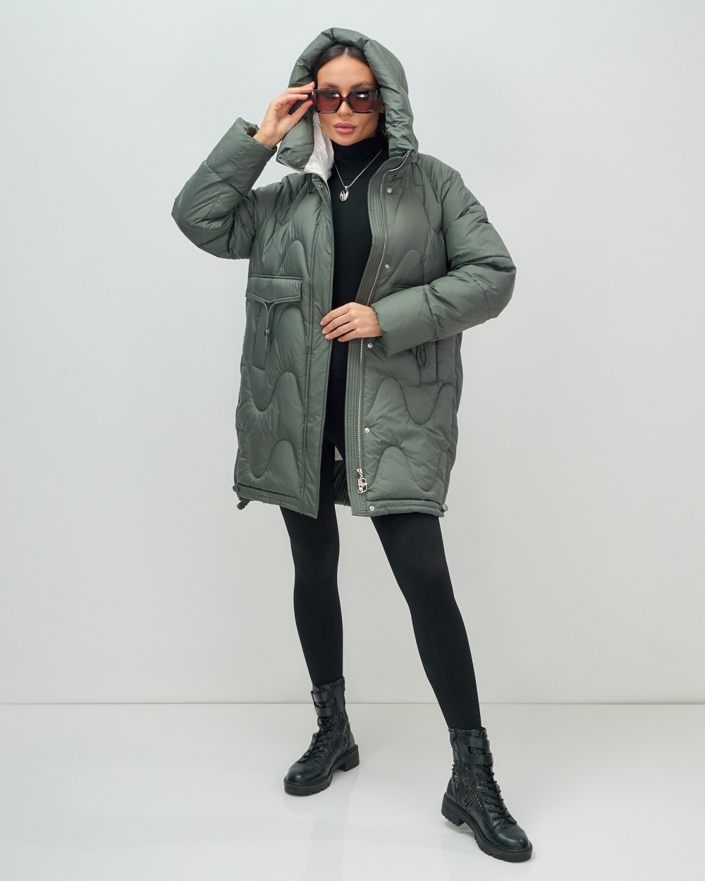 Куртка зимняя женская с капюшоном модная цвета хаки 7653Kh