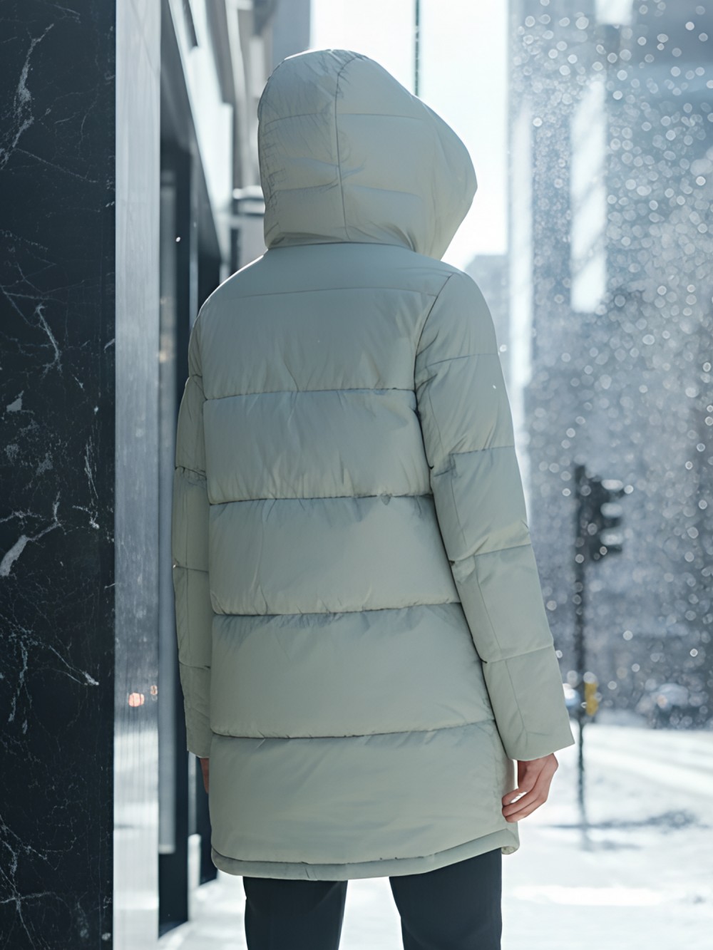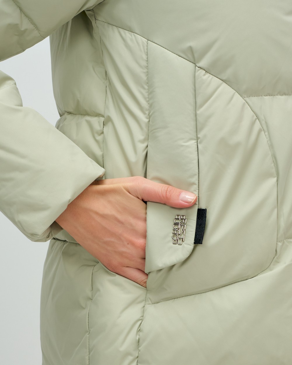 Куртка имеет прямой и свободный покрой, длину до колена и длинные рукава с манжетами, что обеспечивает комфорт и свободу движений. Съемный воротник/стойка и фиксатор на капюшоне добавляют элегантности и удобства, а внутренние карманы обеспечивают дополнительное место для мелочей.