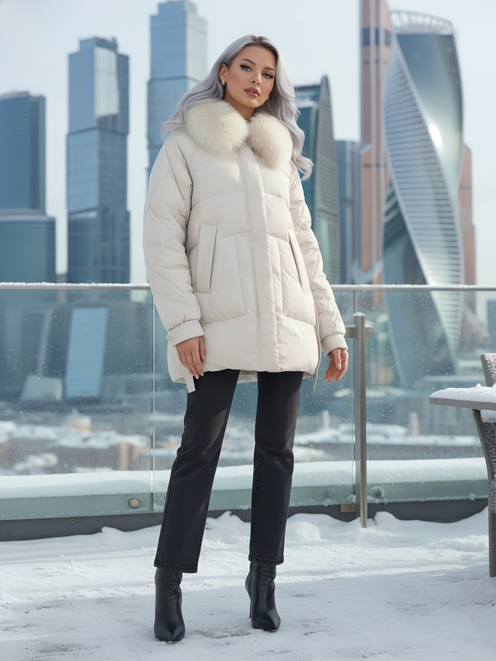 Четыре благородных оттенка – черный, бежевый, коричневый и светло-коричневый – идеально гармонируют с роскошным мехом песца, позволяя создавать элегантные образы для любого случая. Удлиненный силуэт до колена в сочетании с натуральным мехом песца делает фигуру более стройной и грациозной.