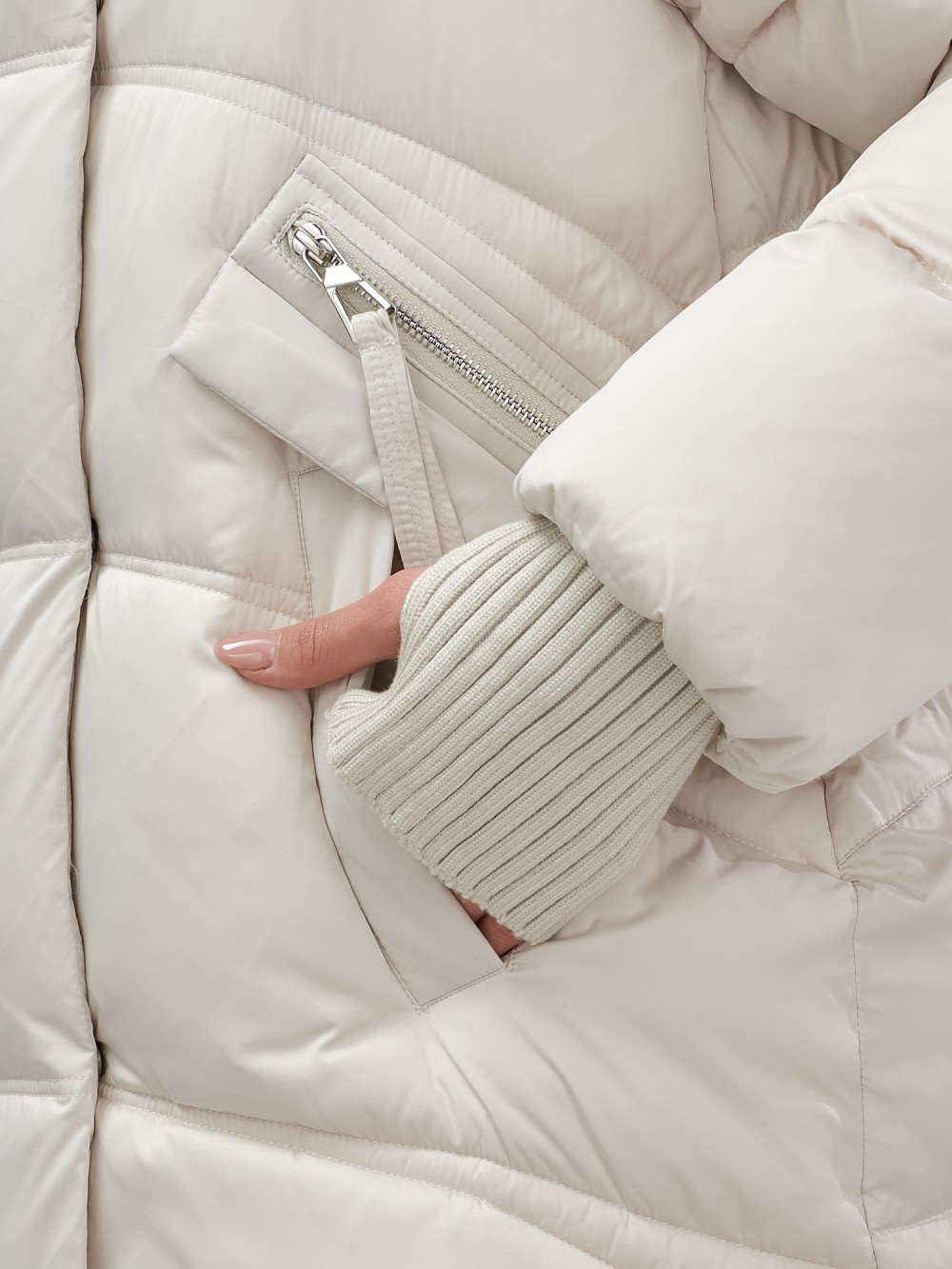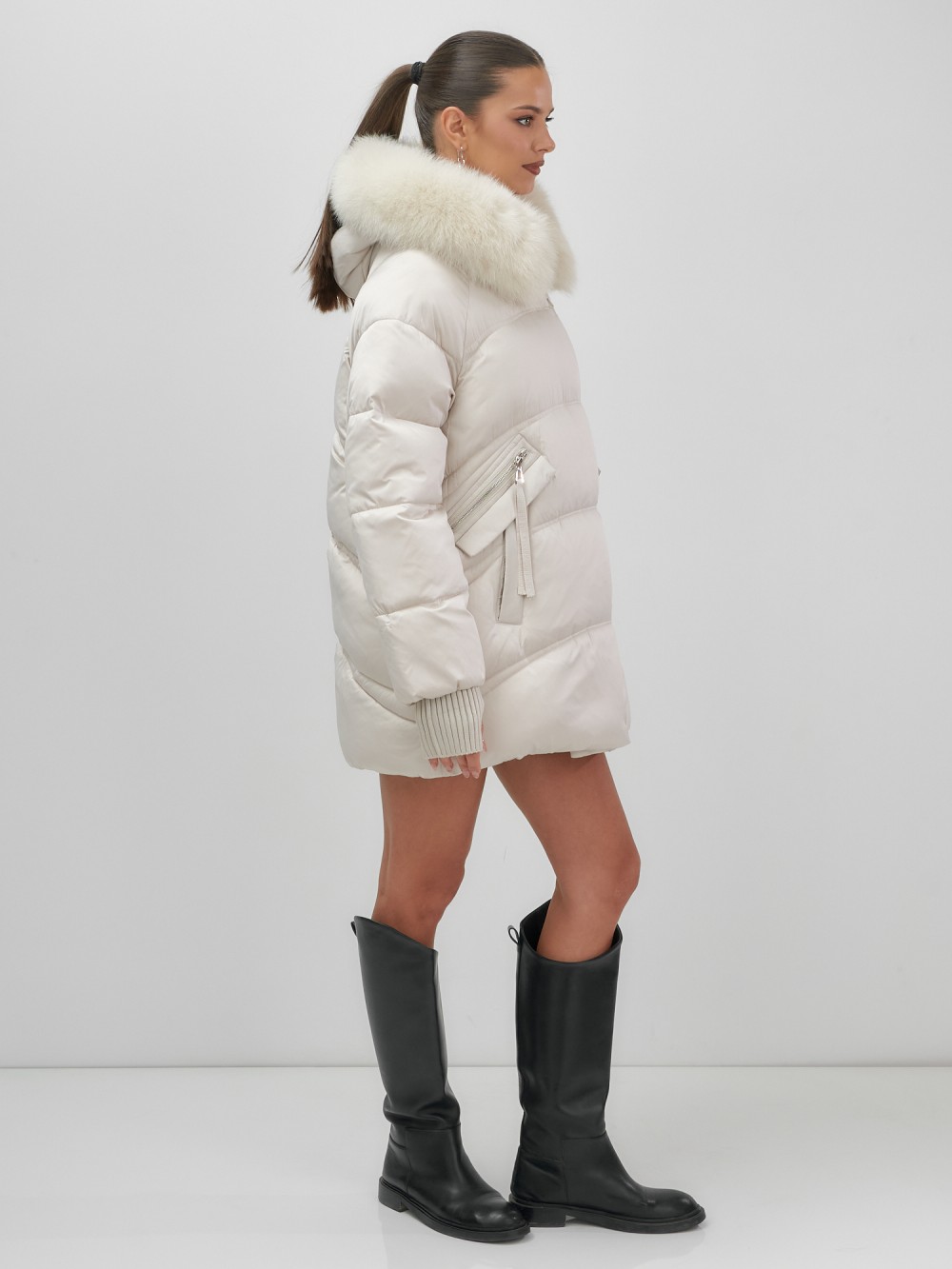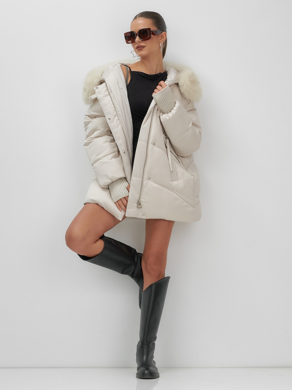 Куртка зимняя женская с мехом и капюшоном тренд бежевого цвета 7737B