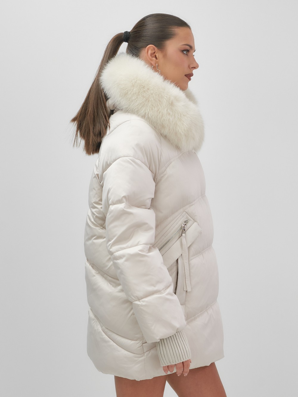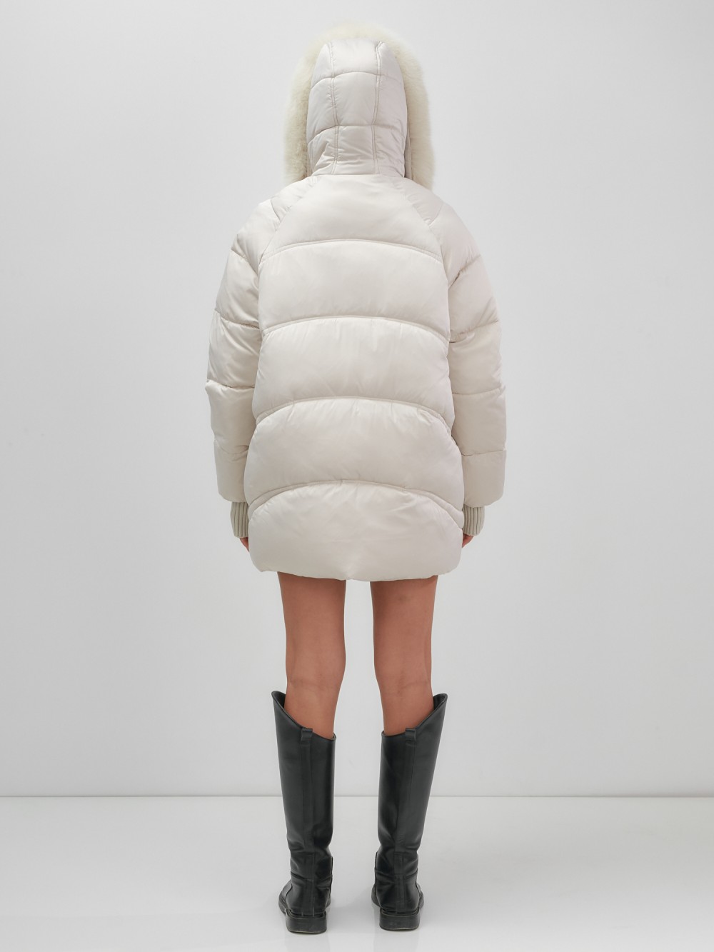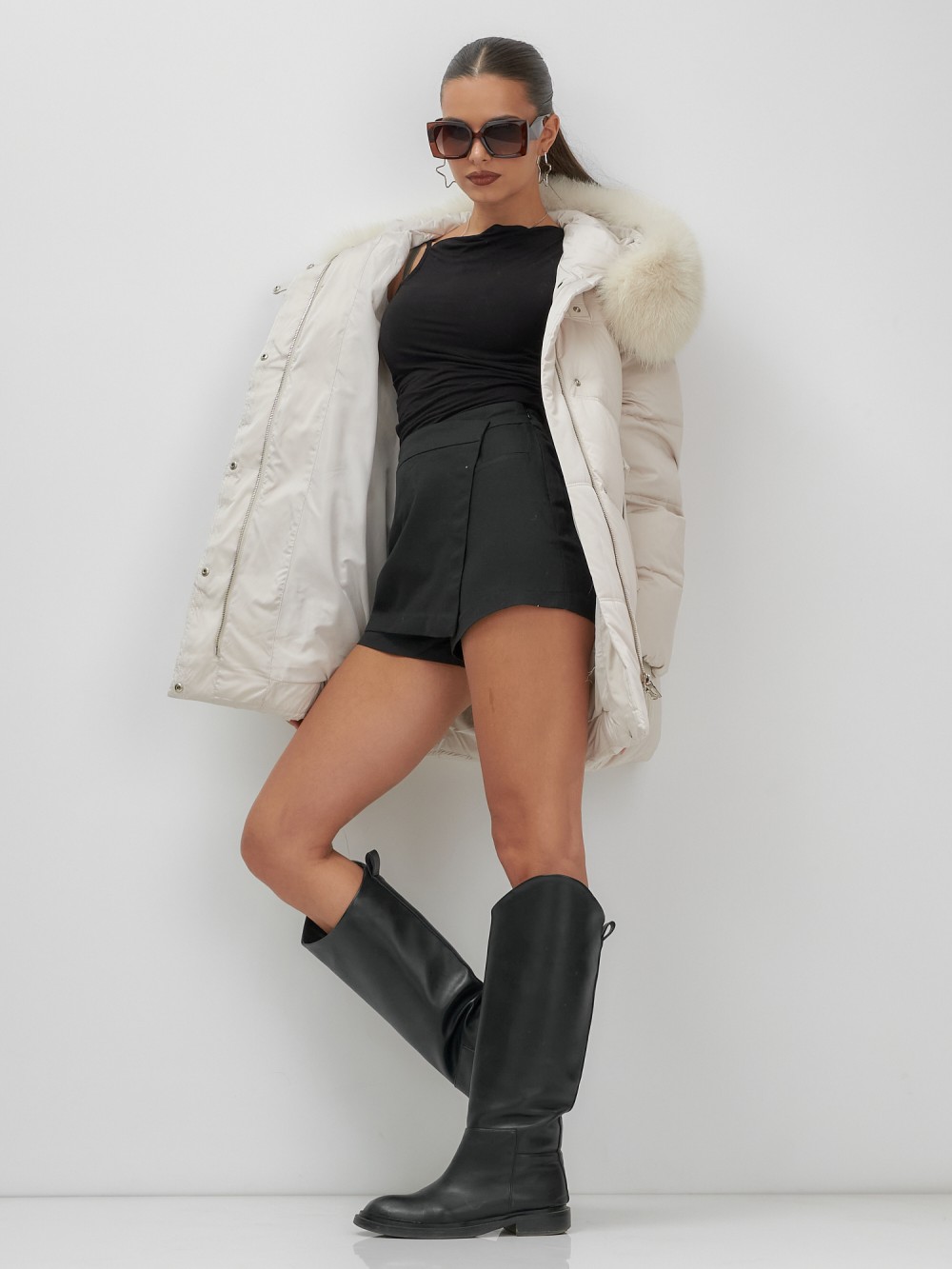 Куртка зимняя женская с мехом и капюшоном тренд бежевого цвета 7737B
