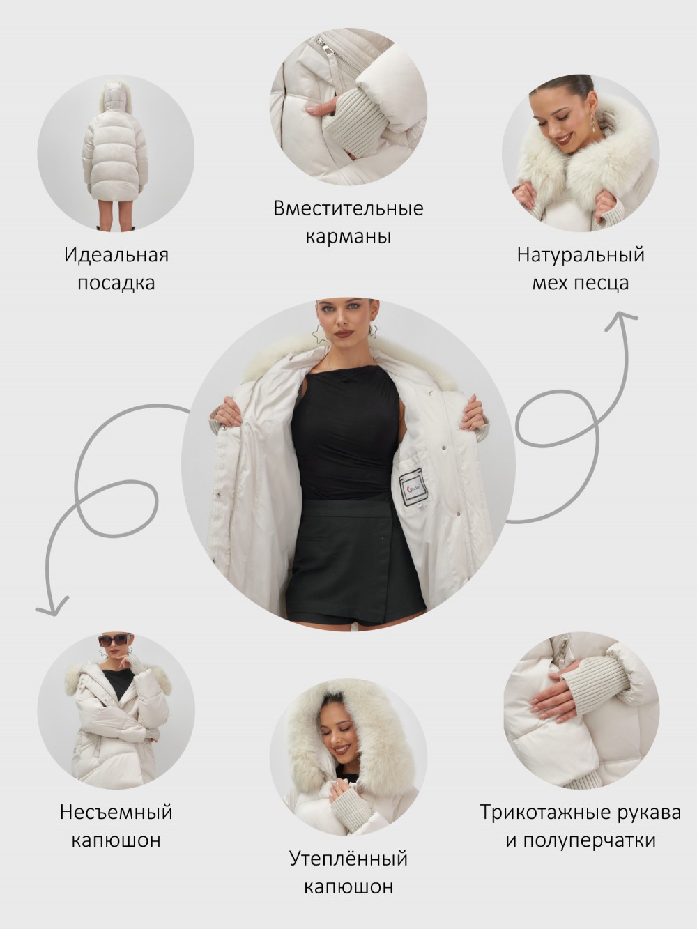 Пять трендовых оттенков сезона осень-зима 2025 – глубокий черный, благородный коричневый, нежный светло-коричневый, изысканный темно-зеленый и элегантный бежевый – идеально сочетаются с роскошным мехом песца. Удлиненный силуэт до колена и свободный крой создают идеальные пропорции для размеров 46-54.