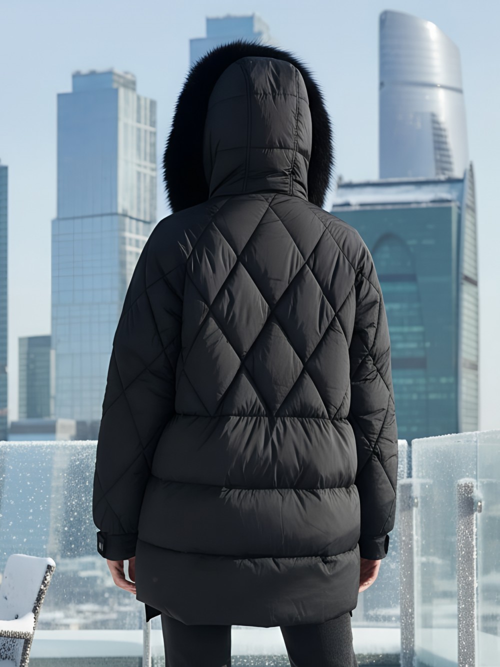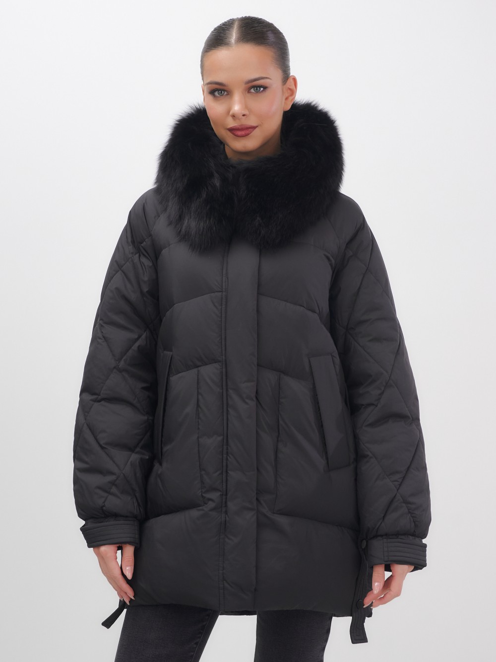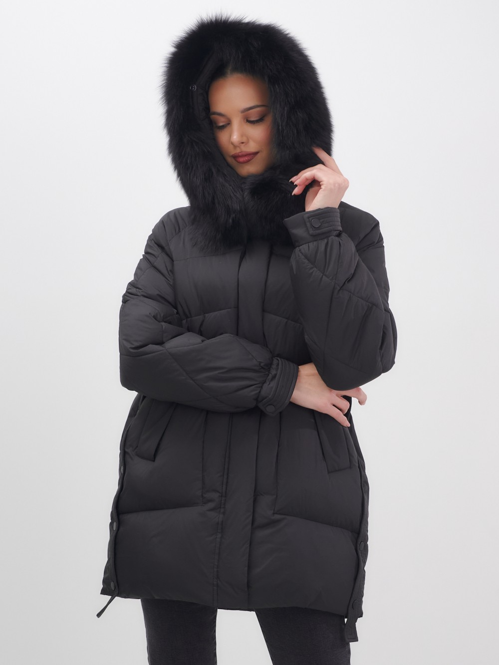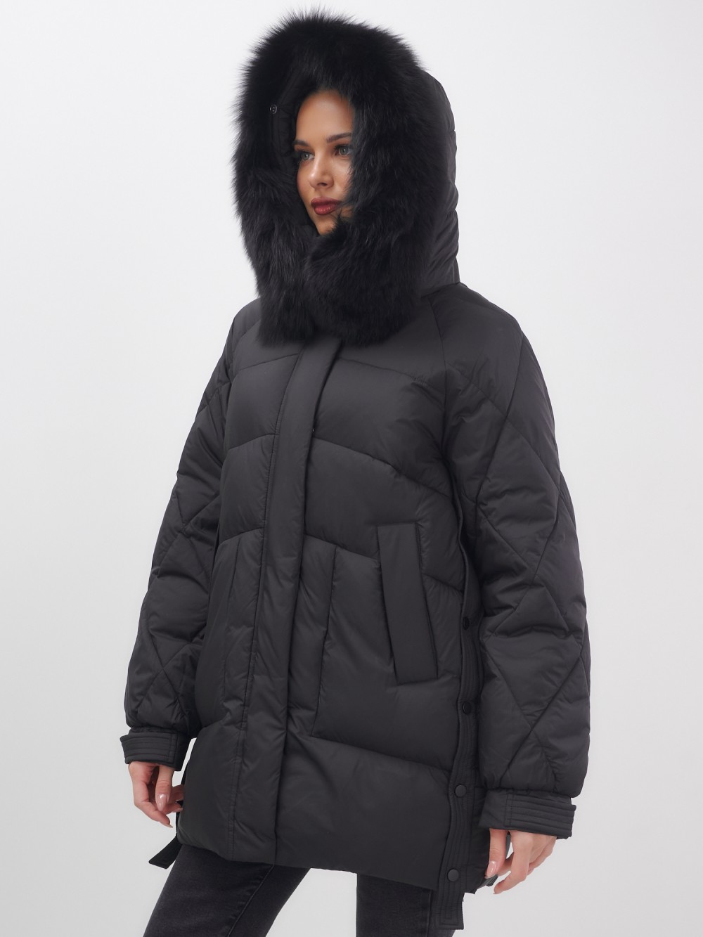 Куртка зимняя женская с мехом и капюшоном тренд черного цвета 7608Ch