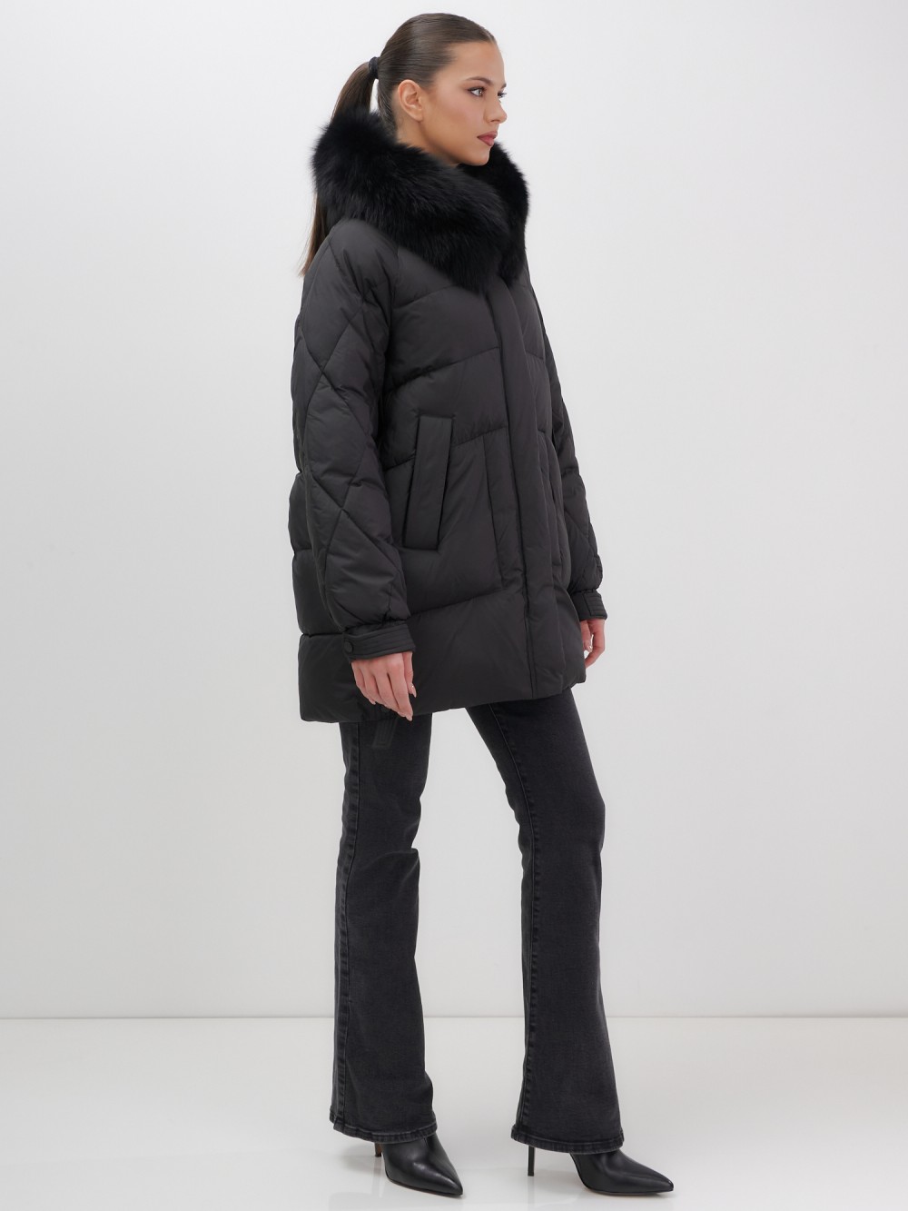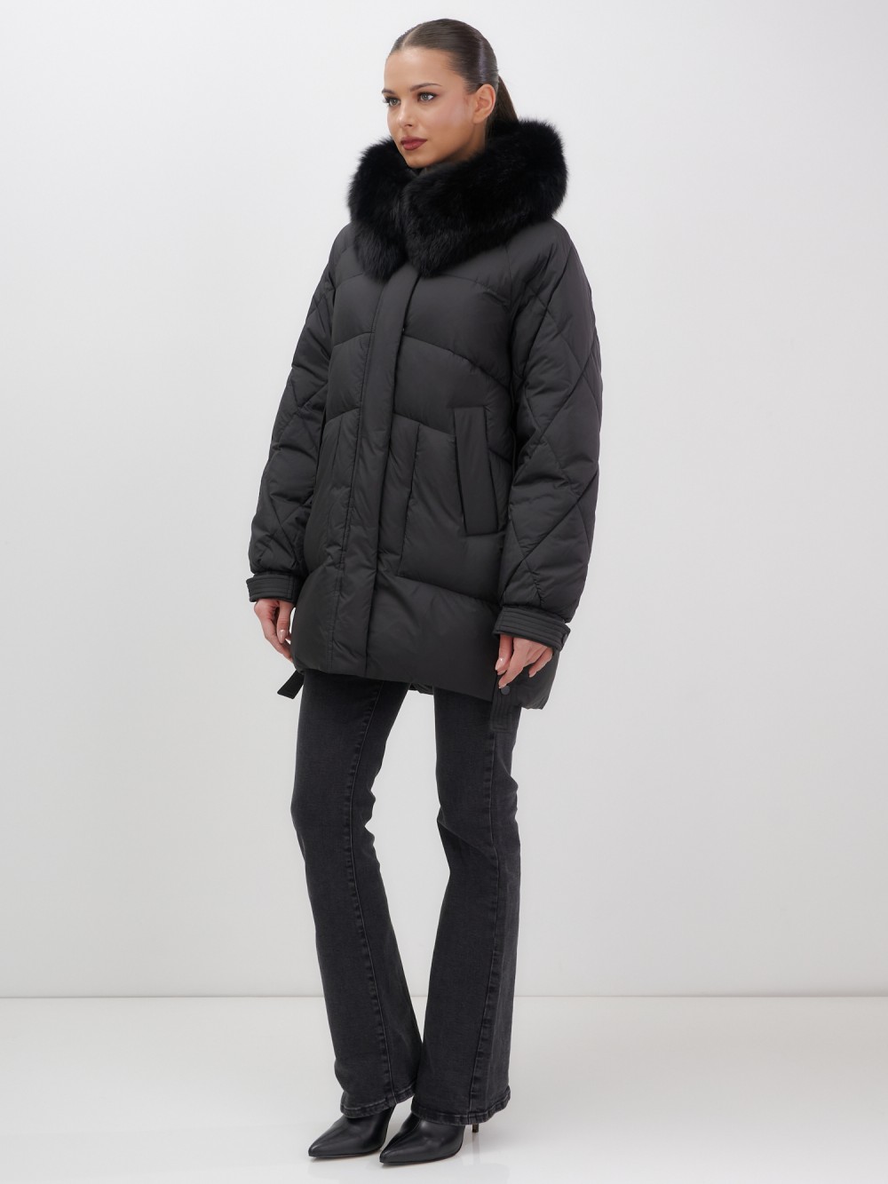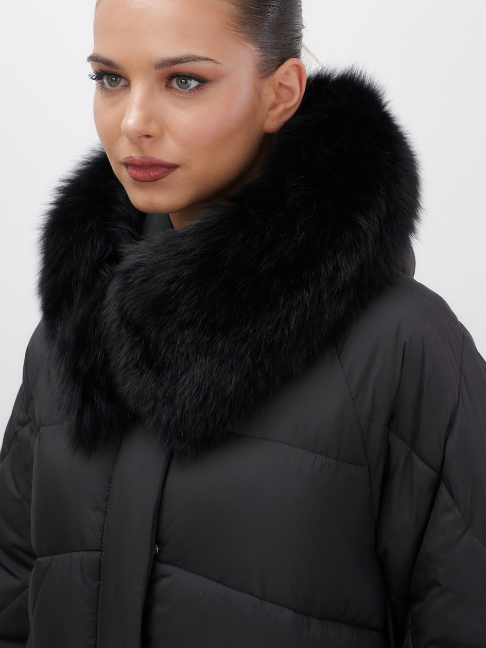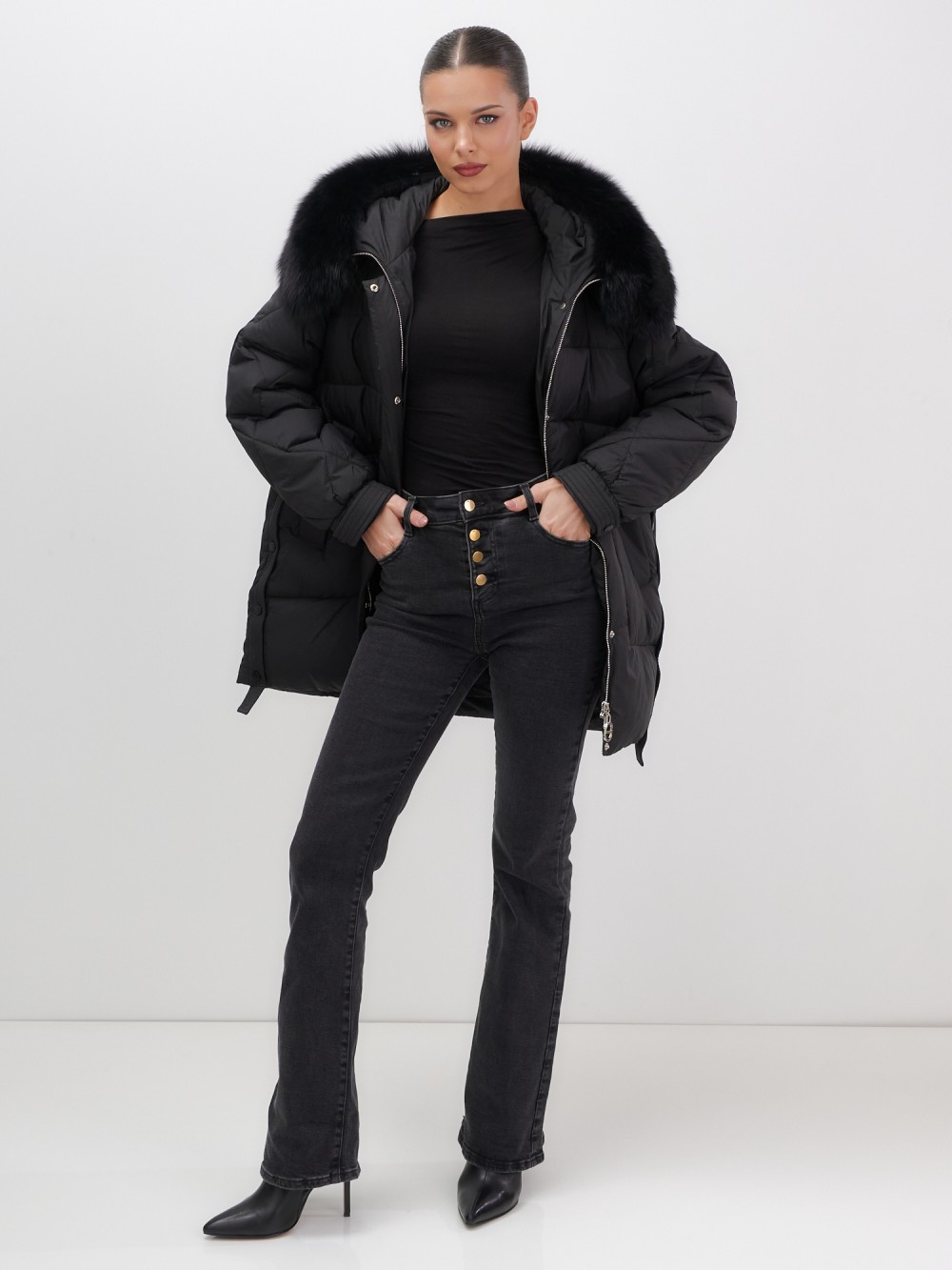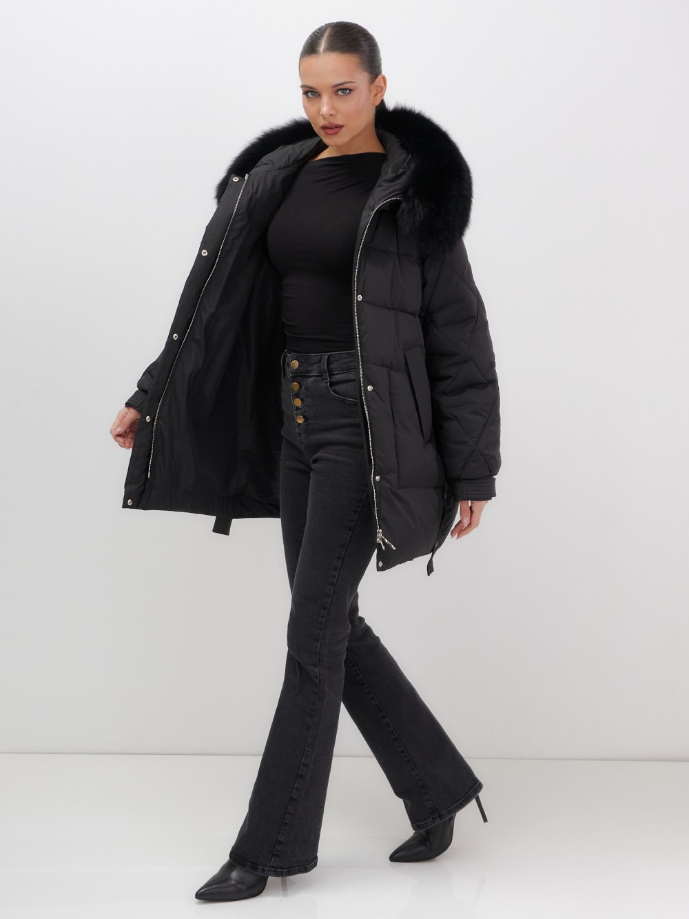 Четыре благородных оттенка – черный, бежевый, коричневый и светло-коричневый – идеально гармонируют с роскошным мехом песца, позволяя создавать элегантные образы для любого случая. Удлиненный силуэт до колена в сочетании с натуральным мехом песца делает фигуру более стройной и грациозной.