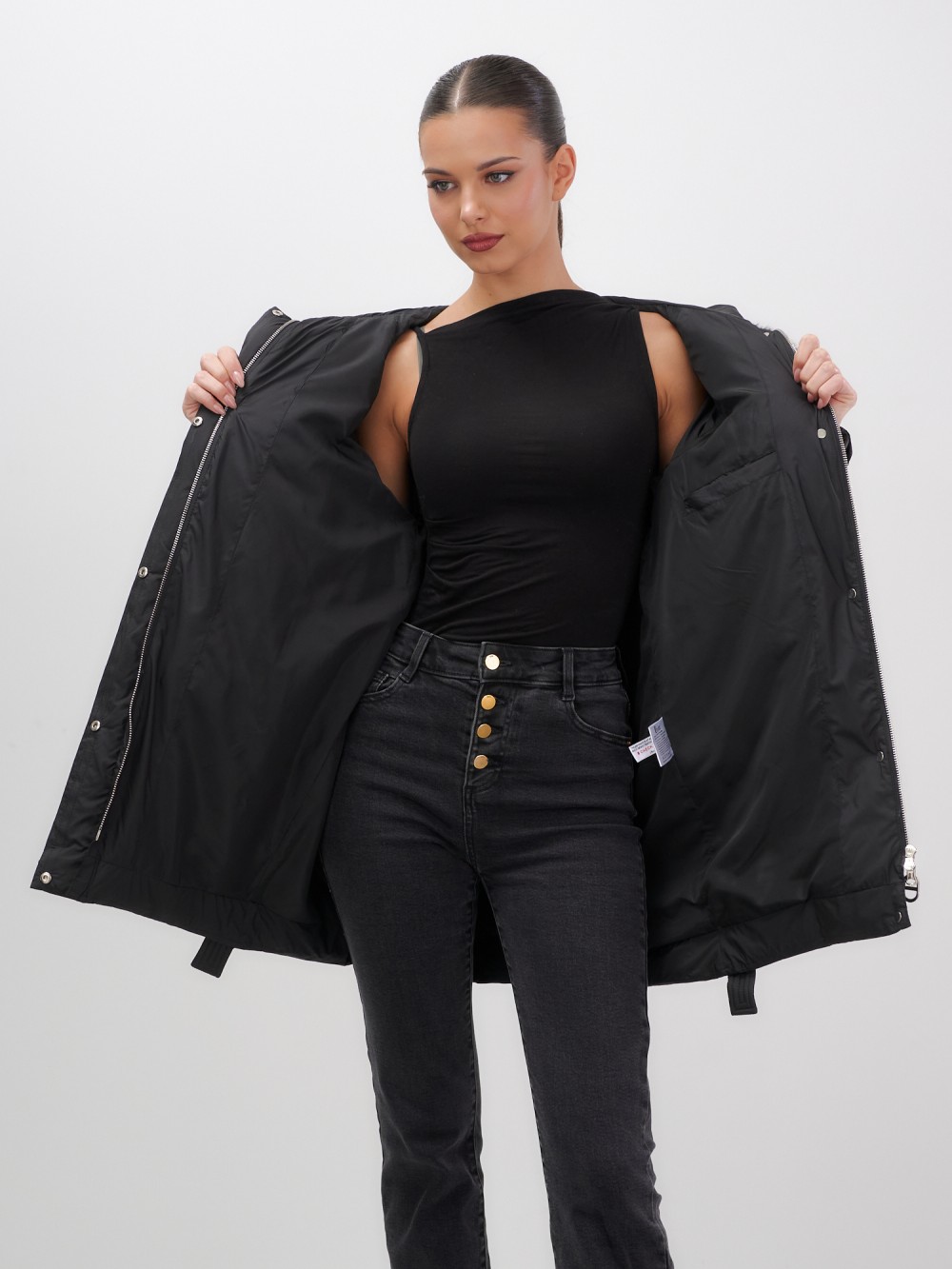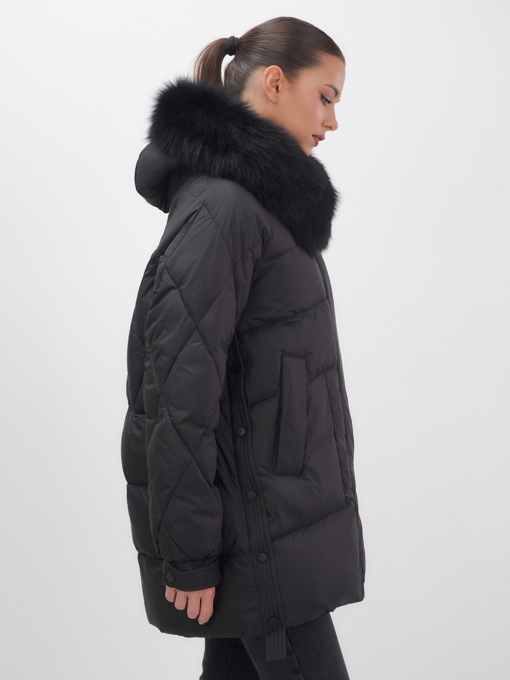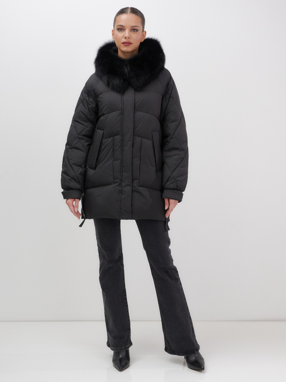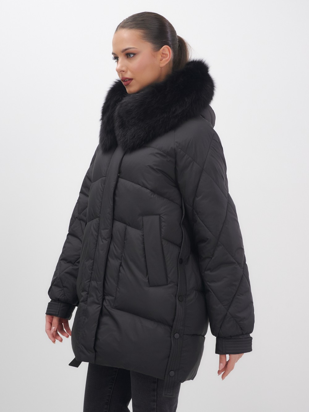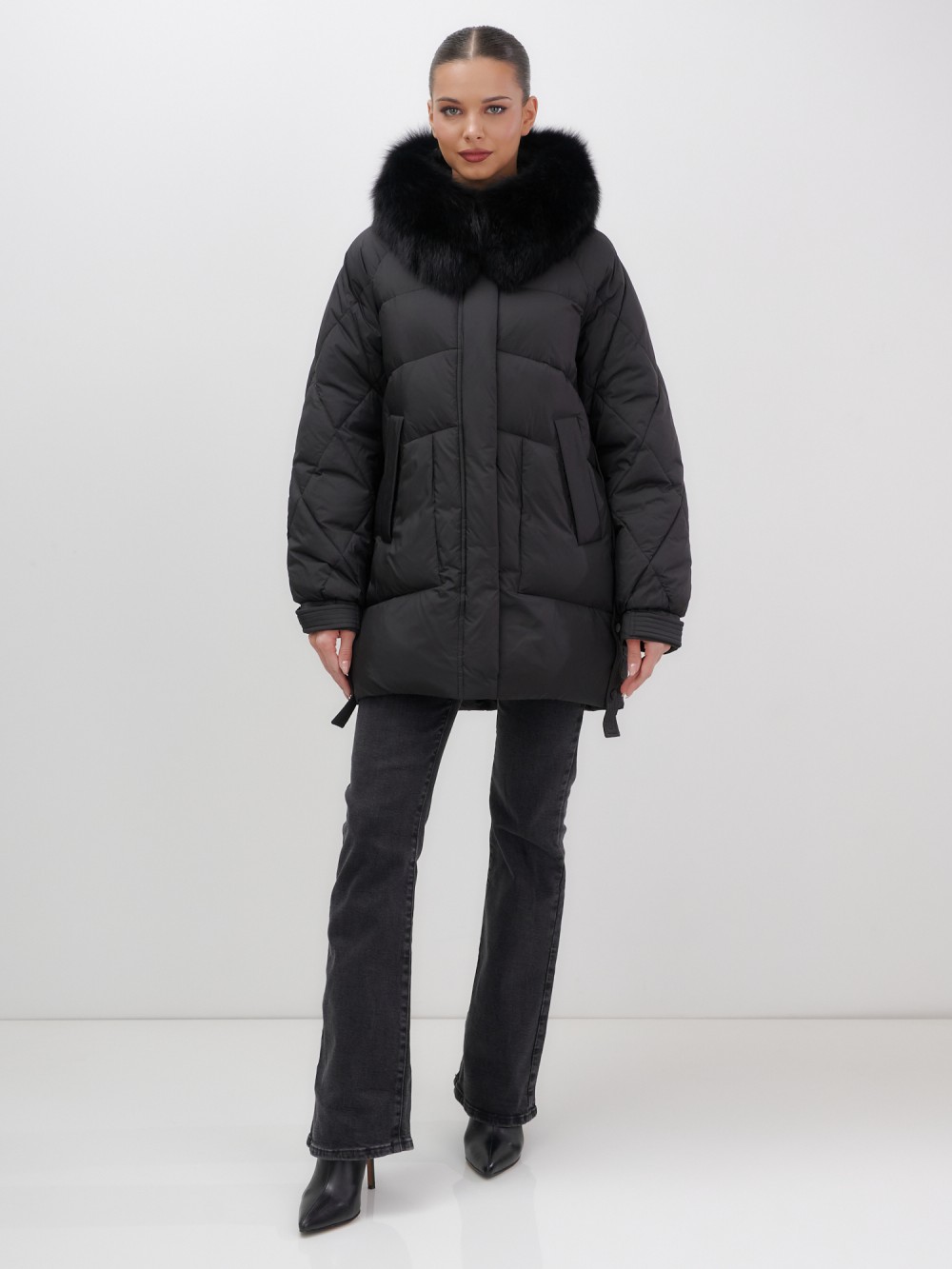 Четыре благородных оттенка – черный, бежевый, коричневый и светло-коричневый – идеально гармонируют с роскошным мехом песца, позволяя создавать элегантные образы для любого случая. Удлиненный силуэт до колена в сочетании с натуральным мехом песца делает фигуру более стройной и грациозной.