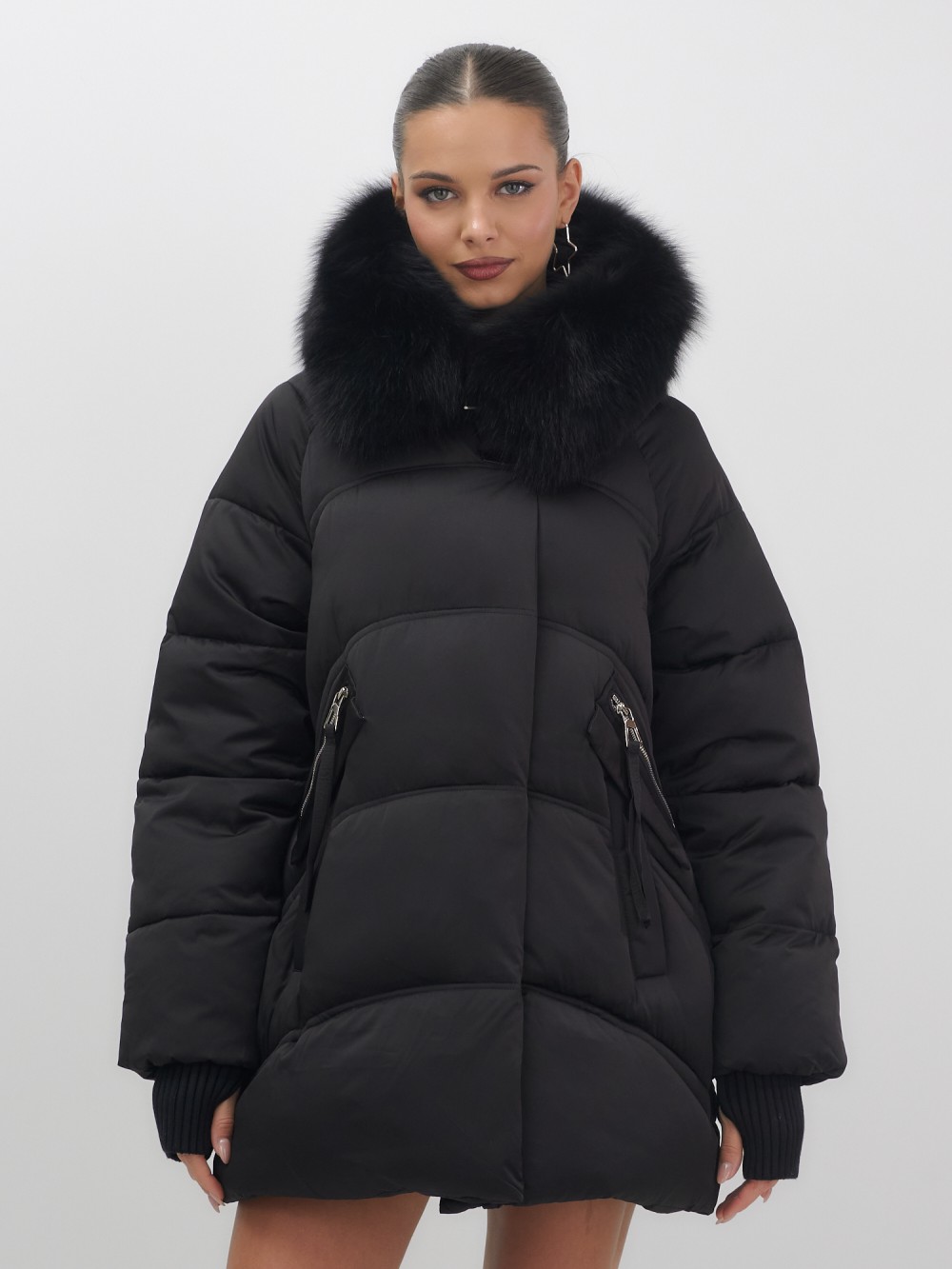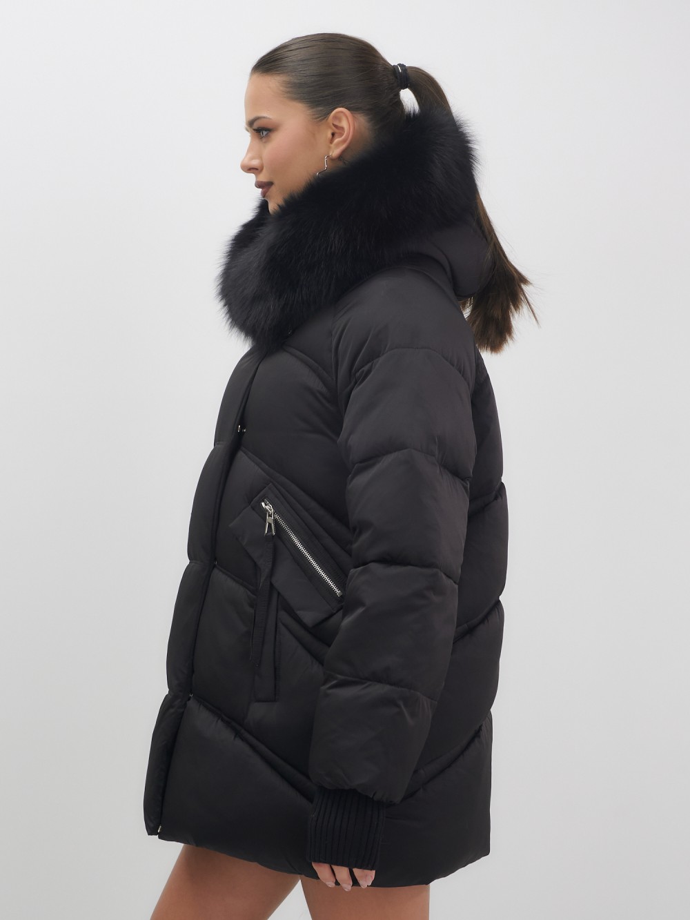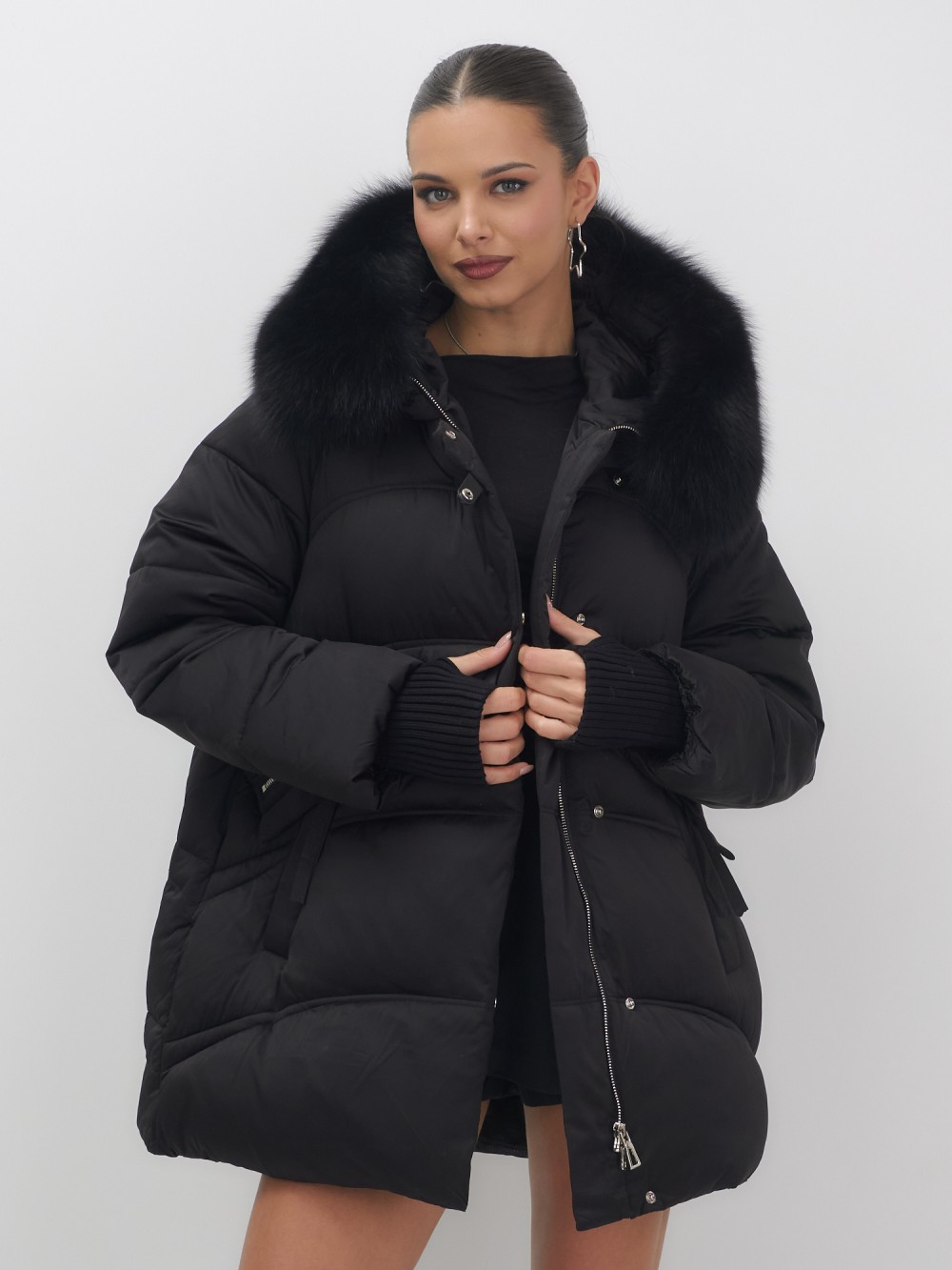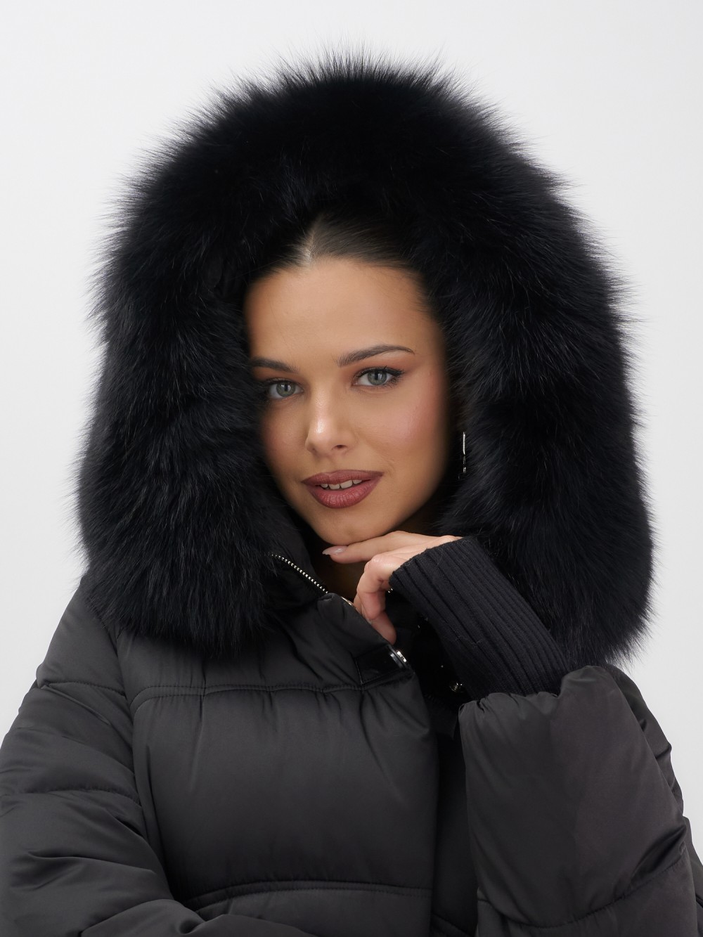Куртка зимняя женская с мехом и капюшоном тренд черного цвета 7737Ch