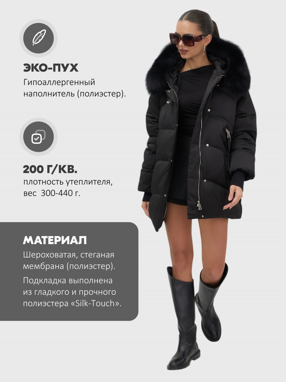 Пять трендовых оттенков сезона осень-зима 2025 – глубокий черный, благородный коричневый, нежный светло-коричневый, изысканный темно-зеленый и элегантный бежевый – идеально сочетаются с роскошным мехом песца. Удлиненный силуэт до колена и свободный крой создают идеальные пропорции для размеров 46-54.