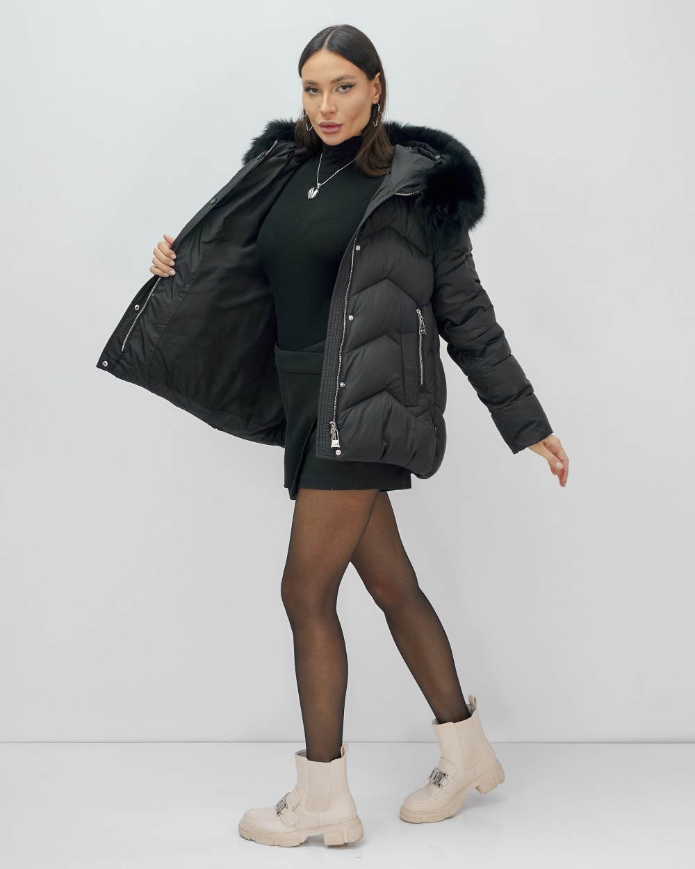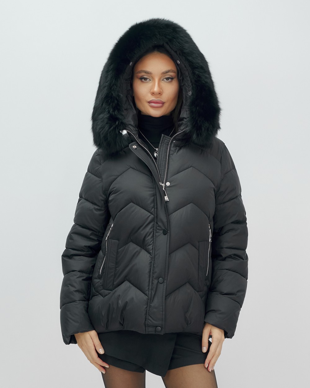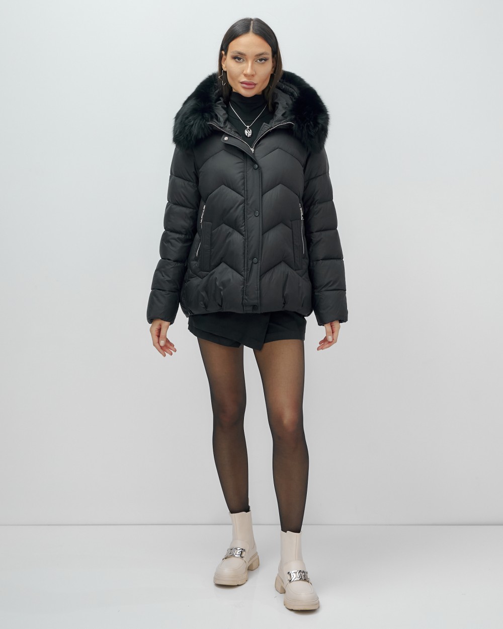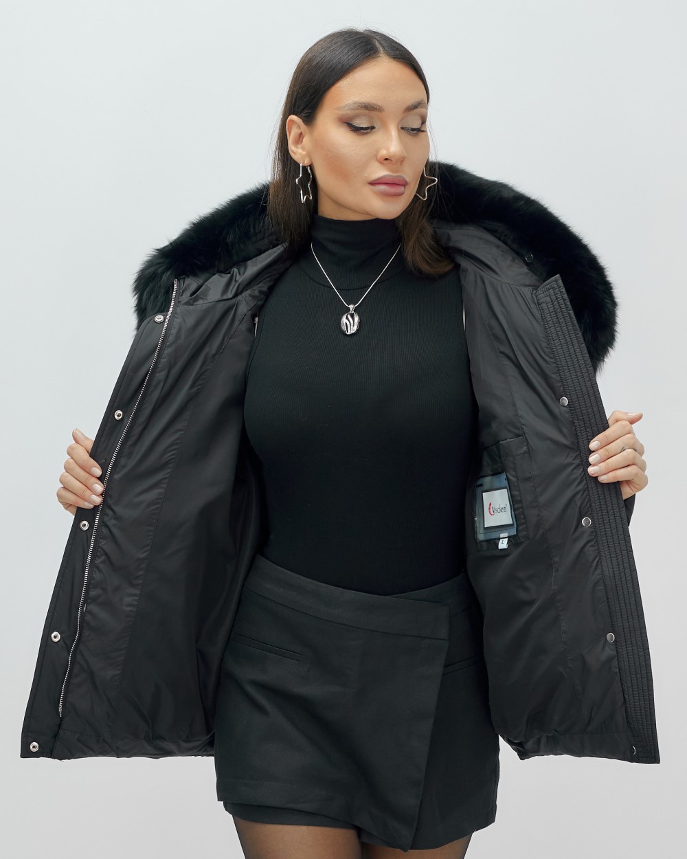 Куртка зимняя женская с мехом и капюшоном тренд черного цвета 7759Ch