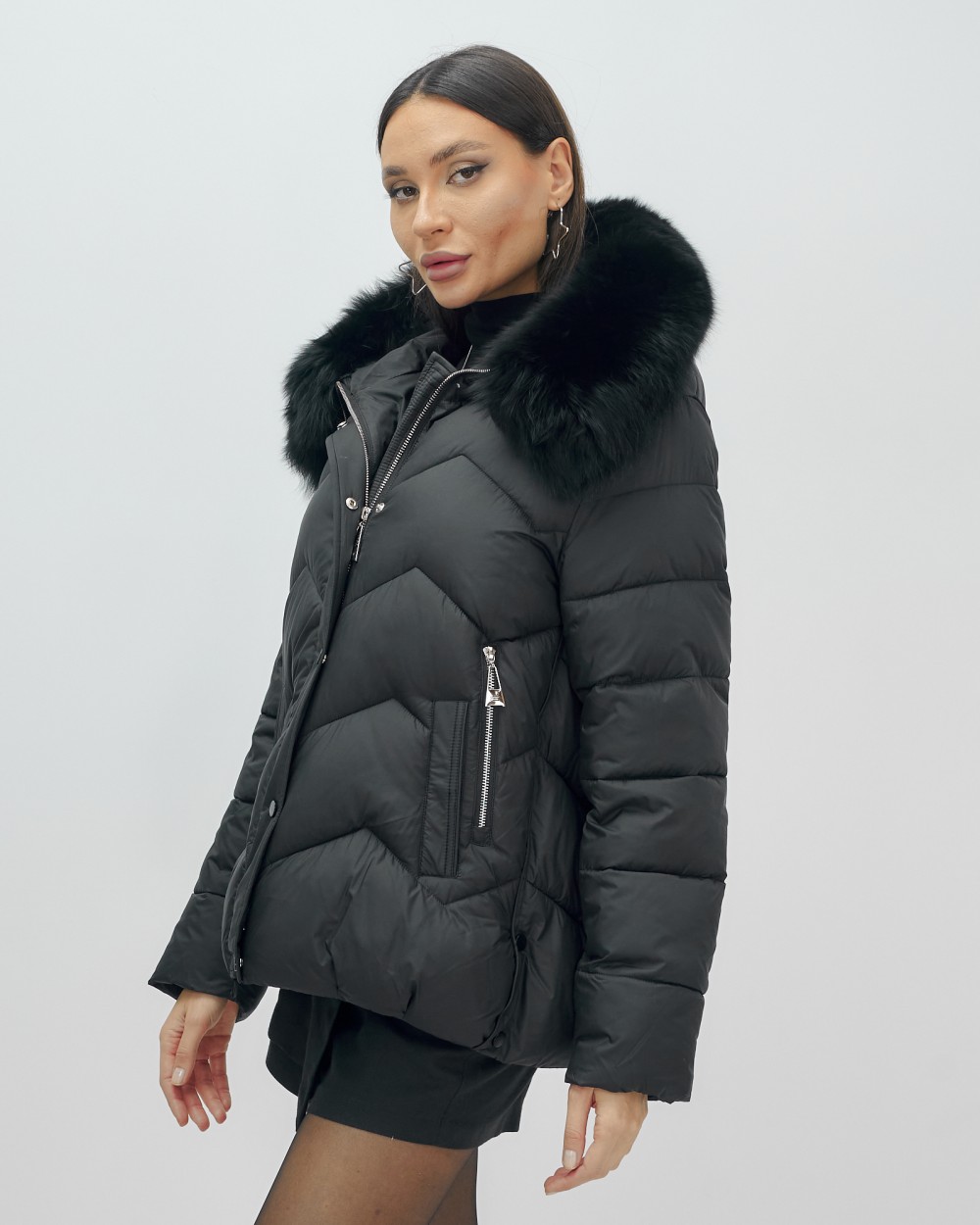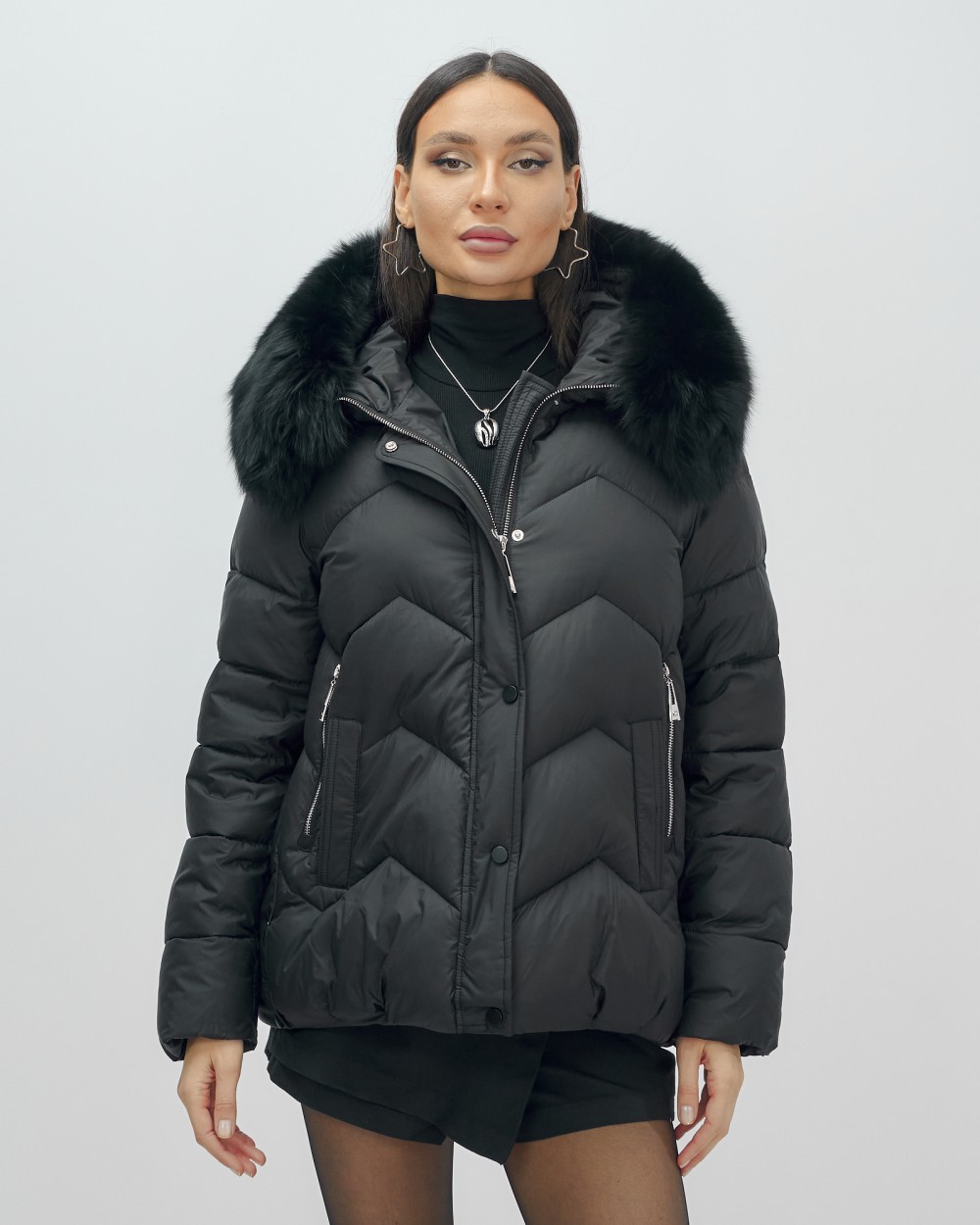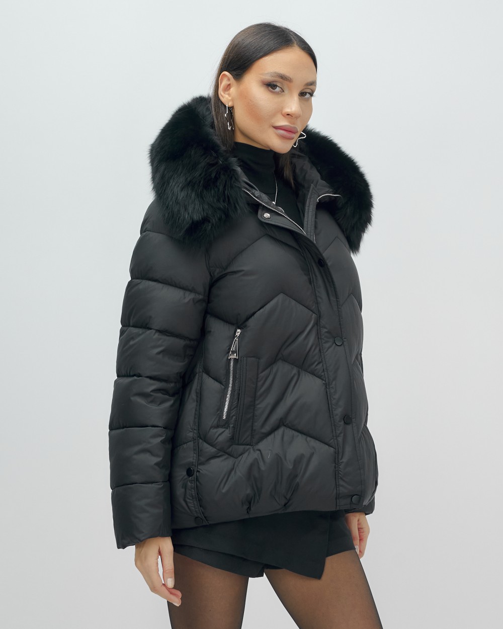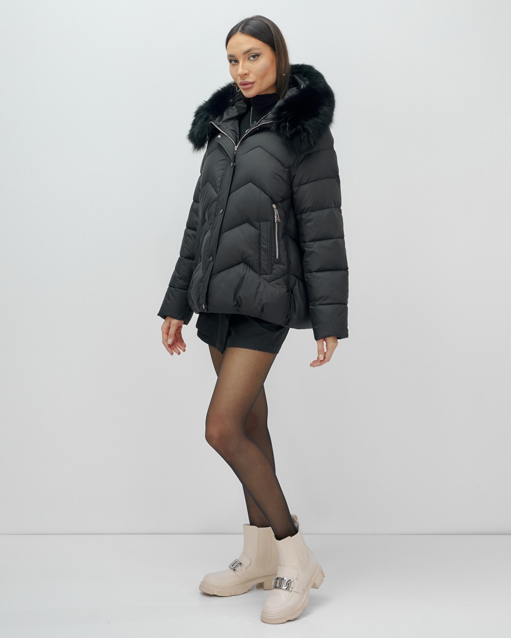 Куртка зимняя женская с мехом и капюшоном тренд черного цвета 7759Ch