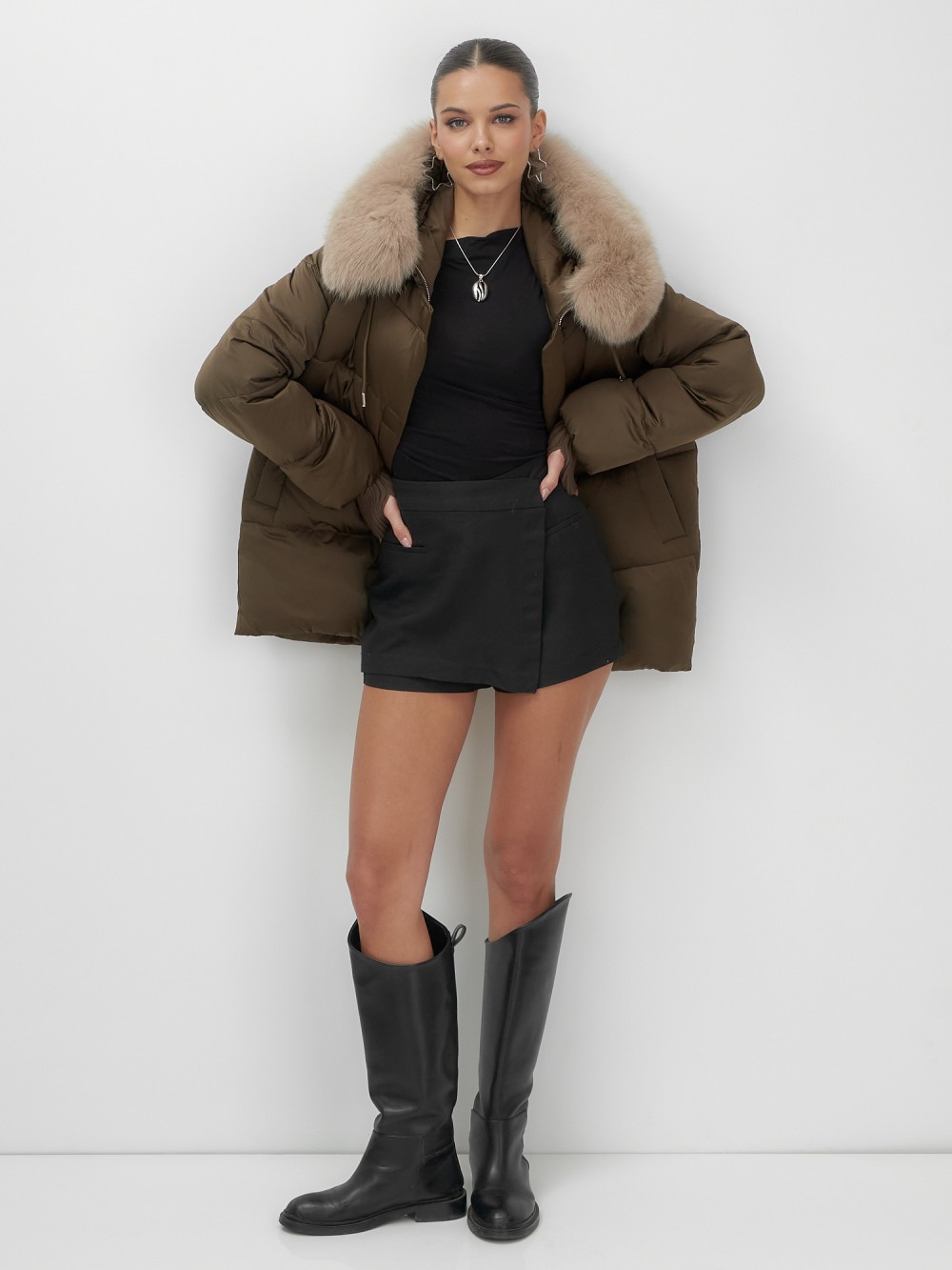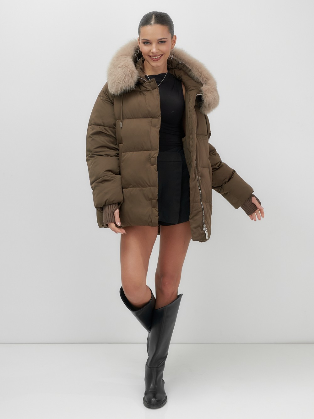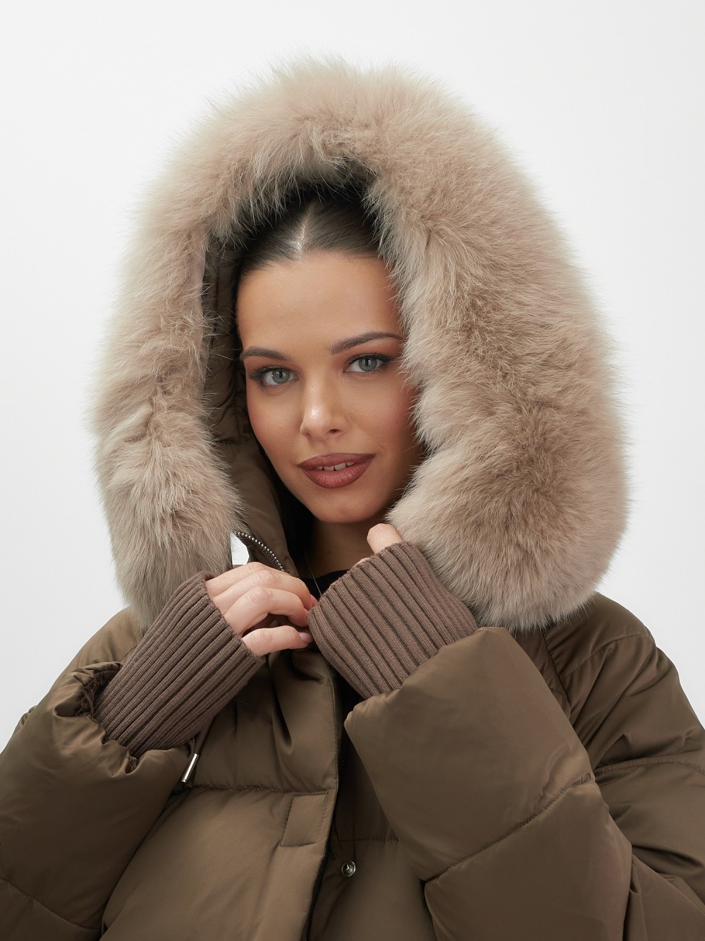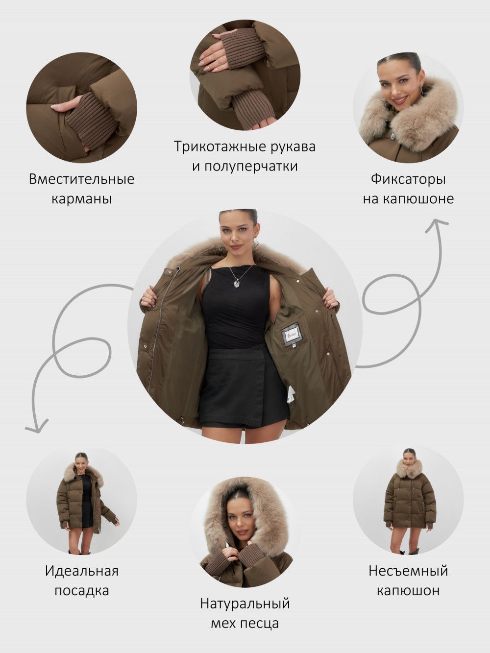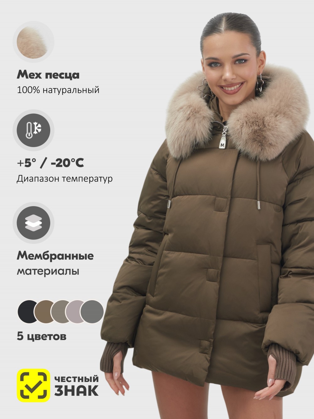 Четыре актуальных оттенка коллекции осень-зима 2025 – классический черный, роскошный коричневый, изысканный светло-коричневый и трендовый горчичный – великолепно гармонируют с натуральным мехом песца. Длина до бедра и свободный крой создают идеальные пропорции для размеров 44-52.