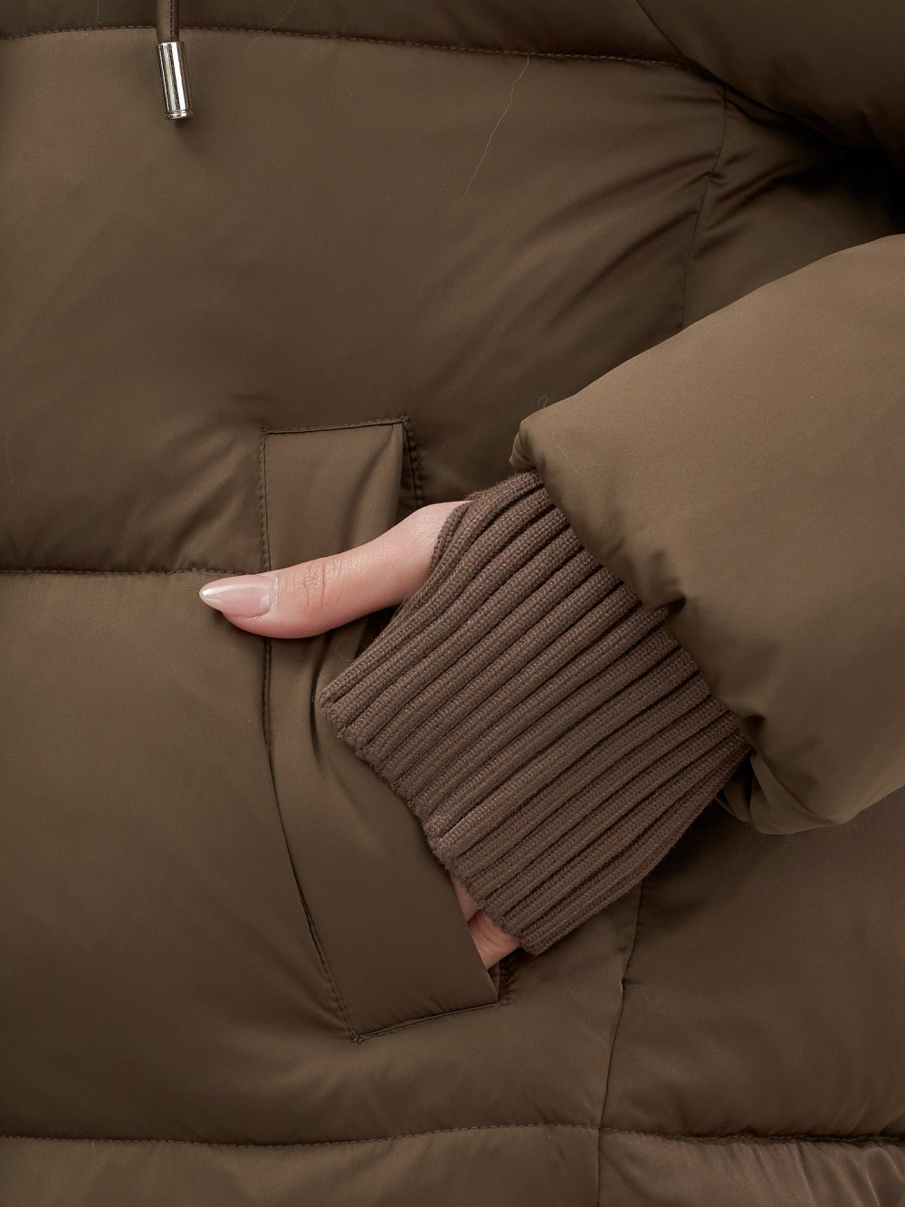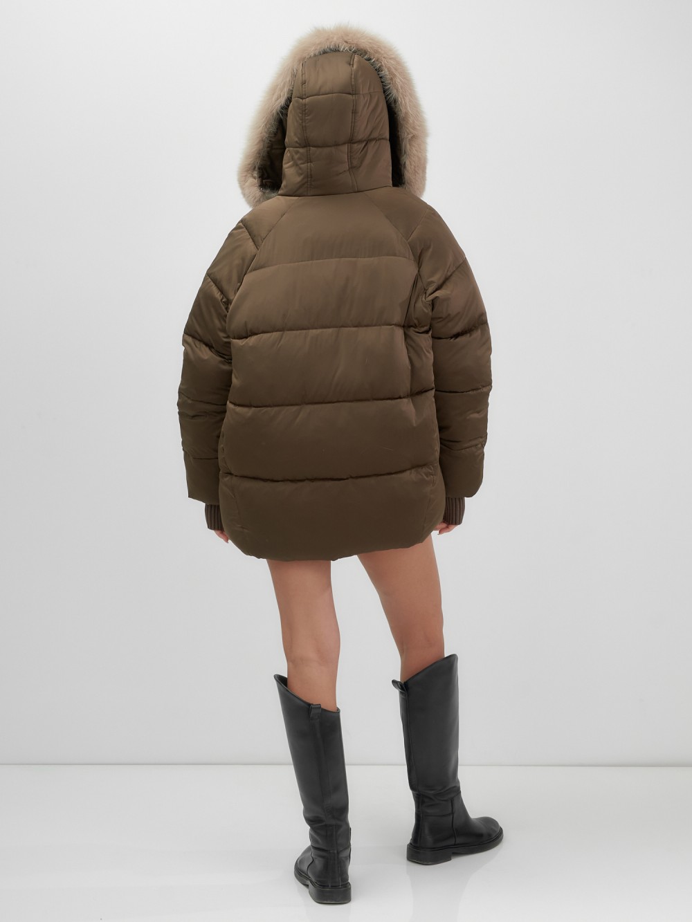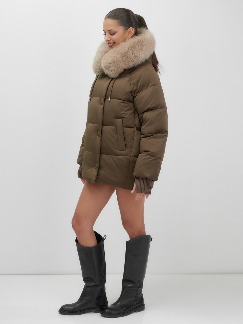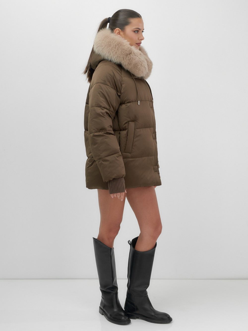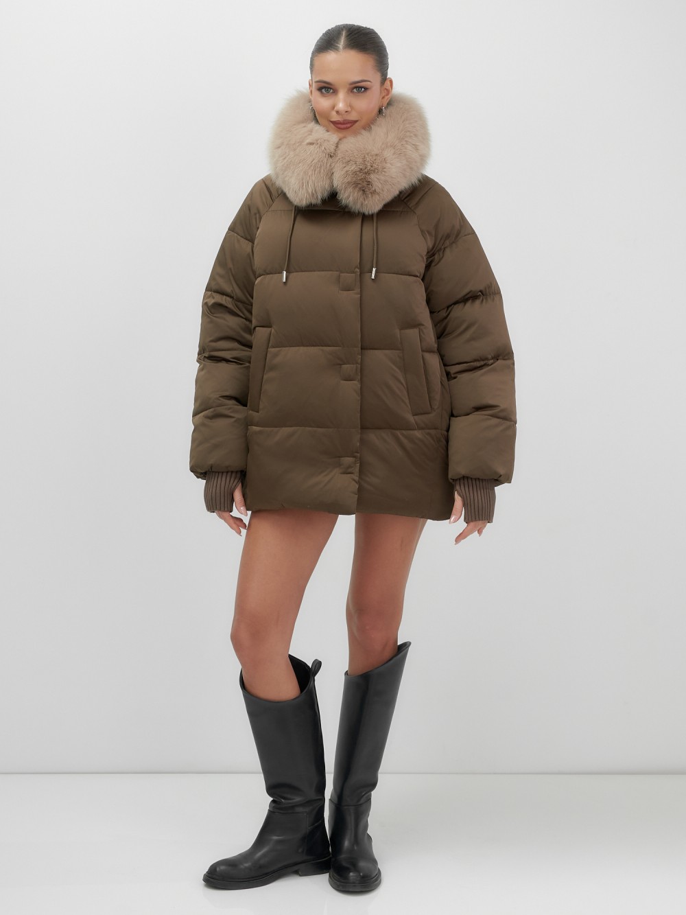 Четыре актуальных оттенка коллекции осень-зима 2025 – классический черный, роскошный коричневый, изысканный светло-коричневый и трендовый горчичный – великолепно гармонируют с натуральным мехом песца. Длина до бедра и свободный крой создают идеальные пропорции для размеров 44-52.