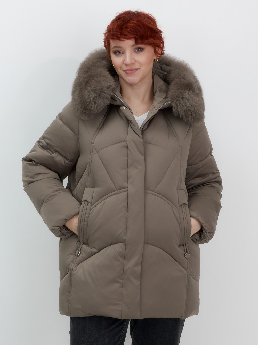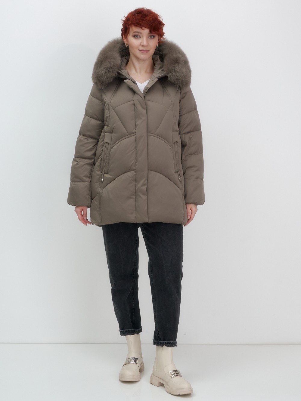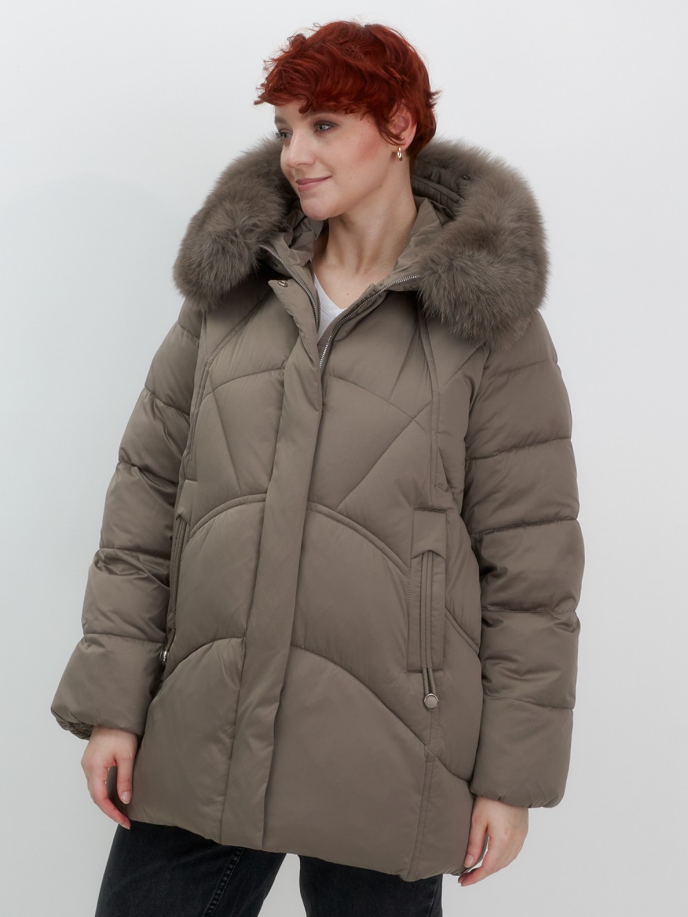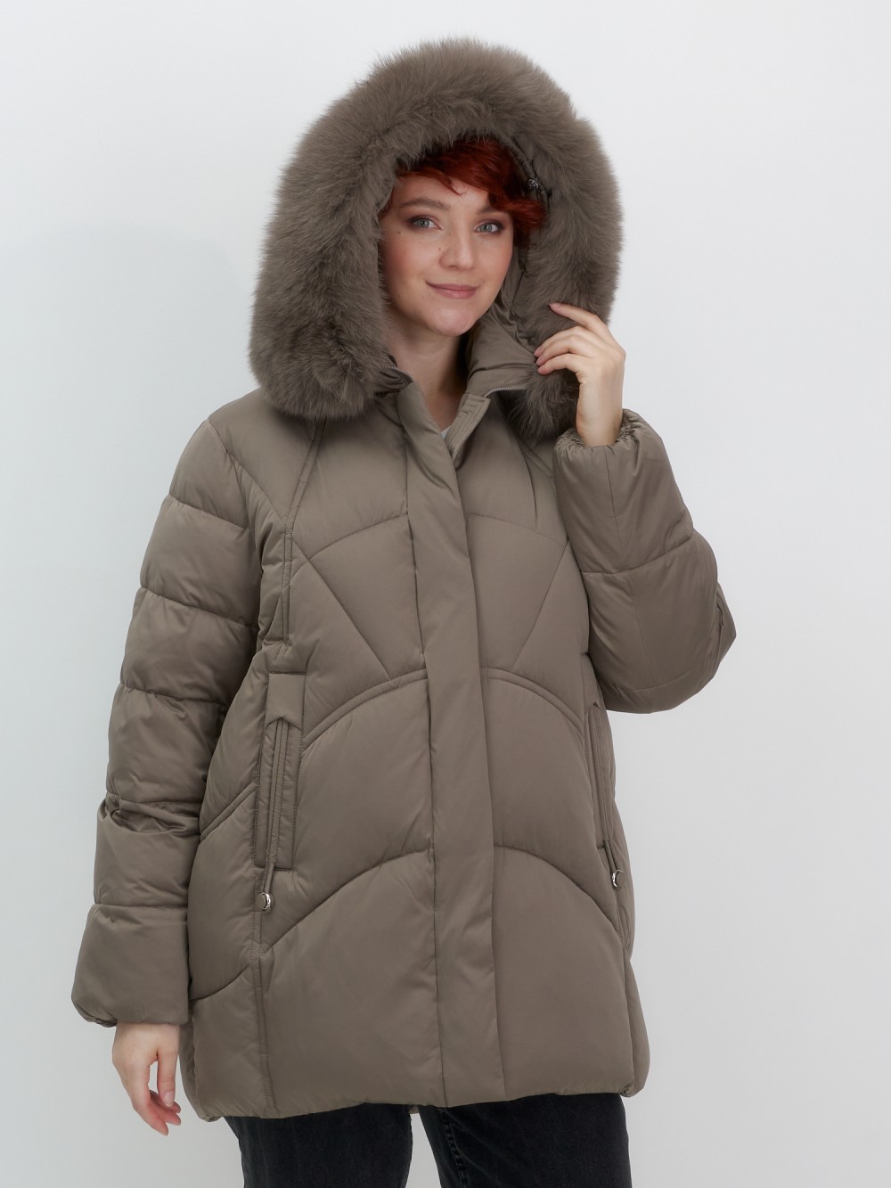 Куртка зимняя женская с мехом и капюшоном тренд коричневого цвета 7656K
