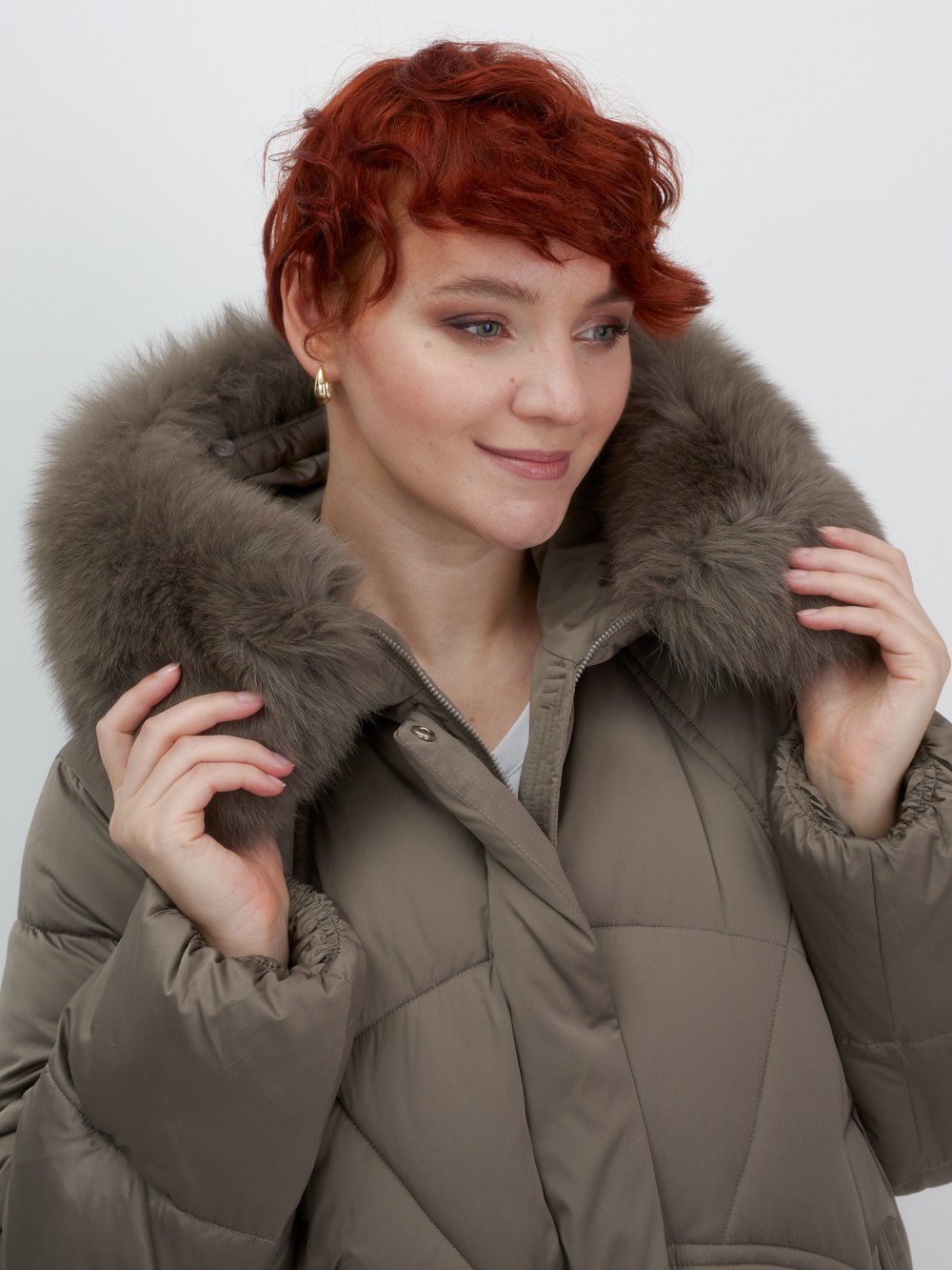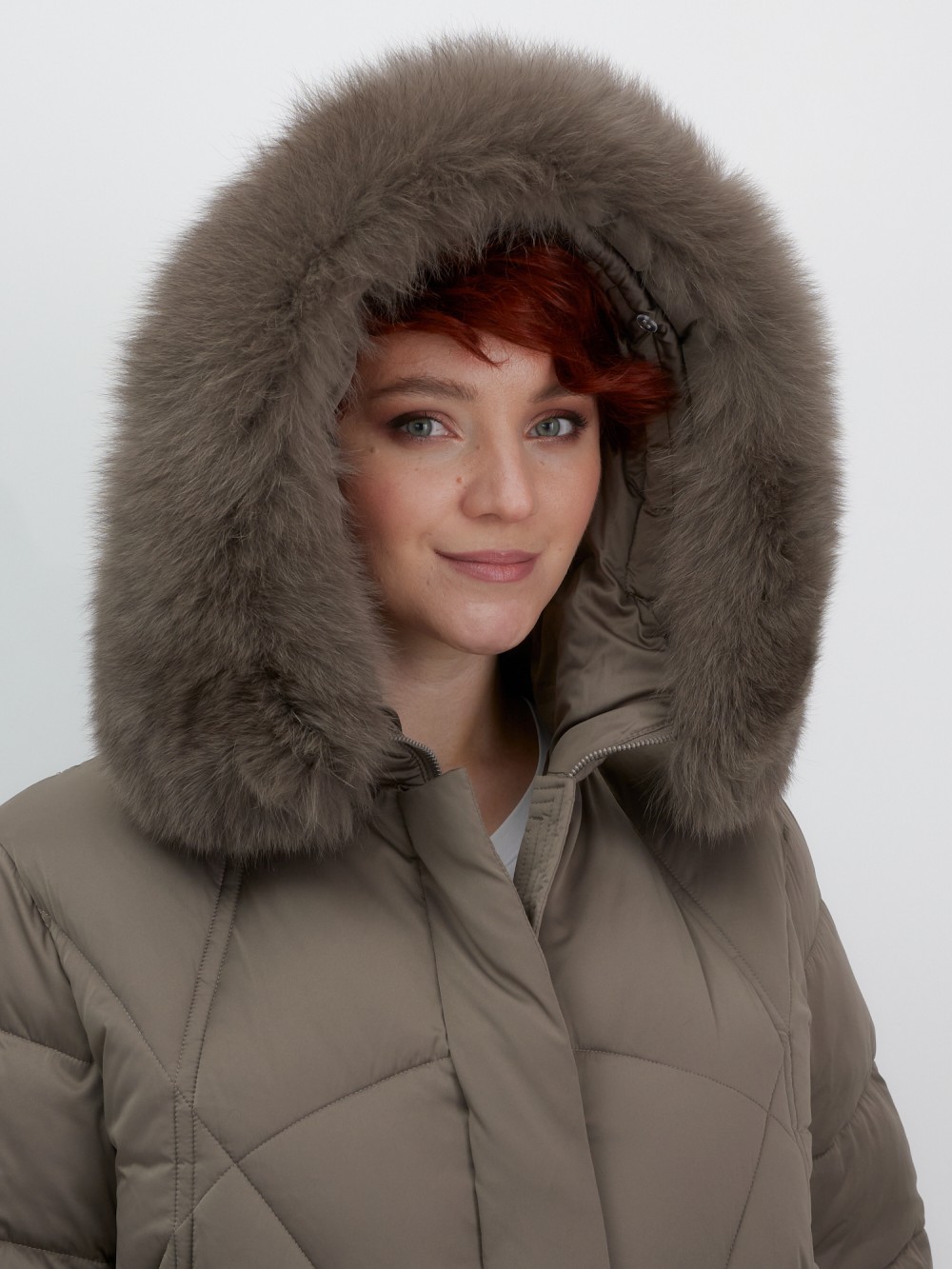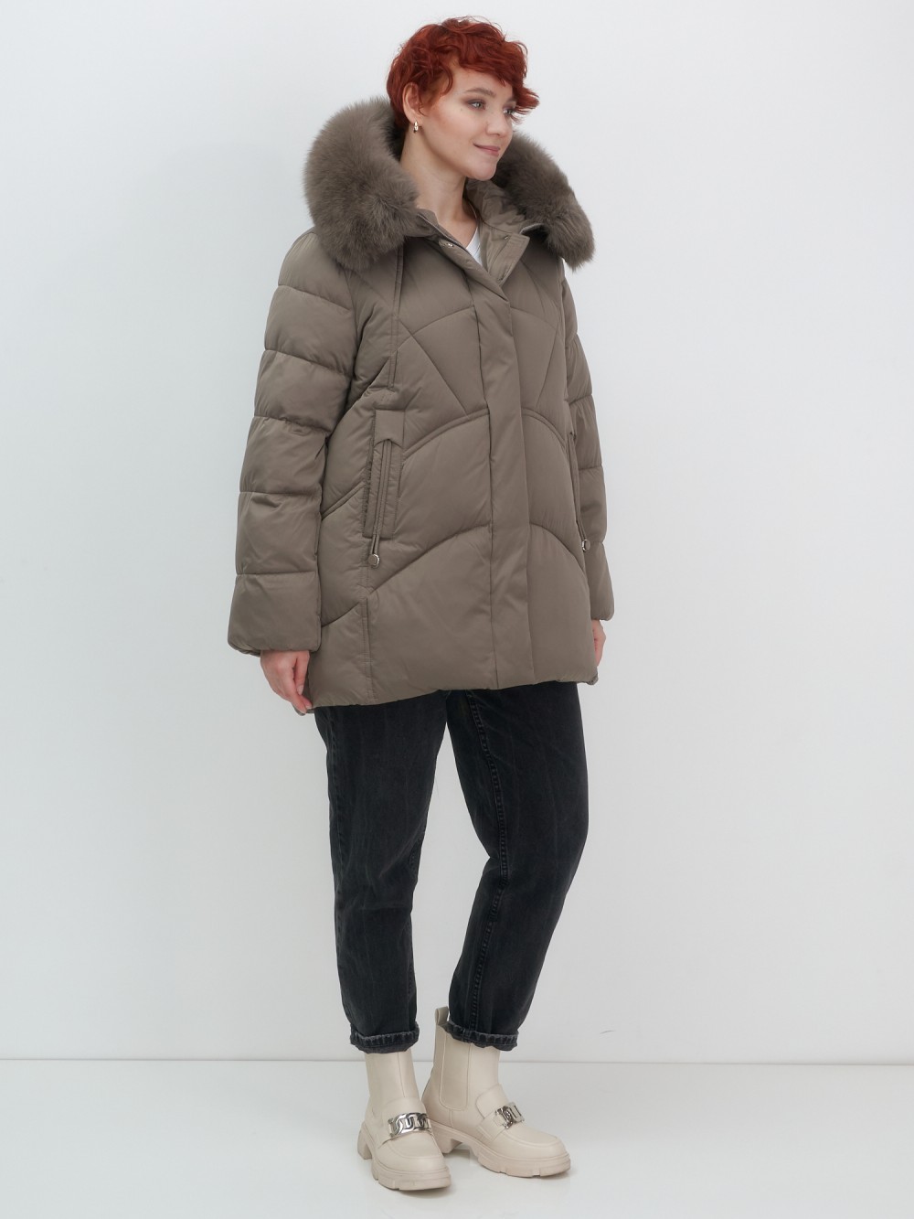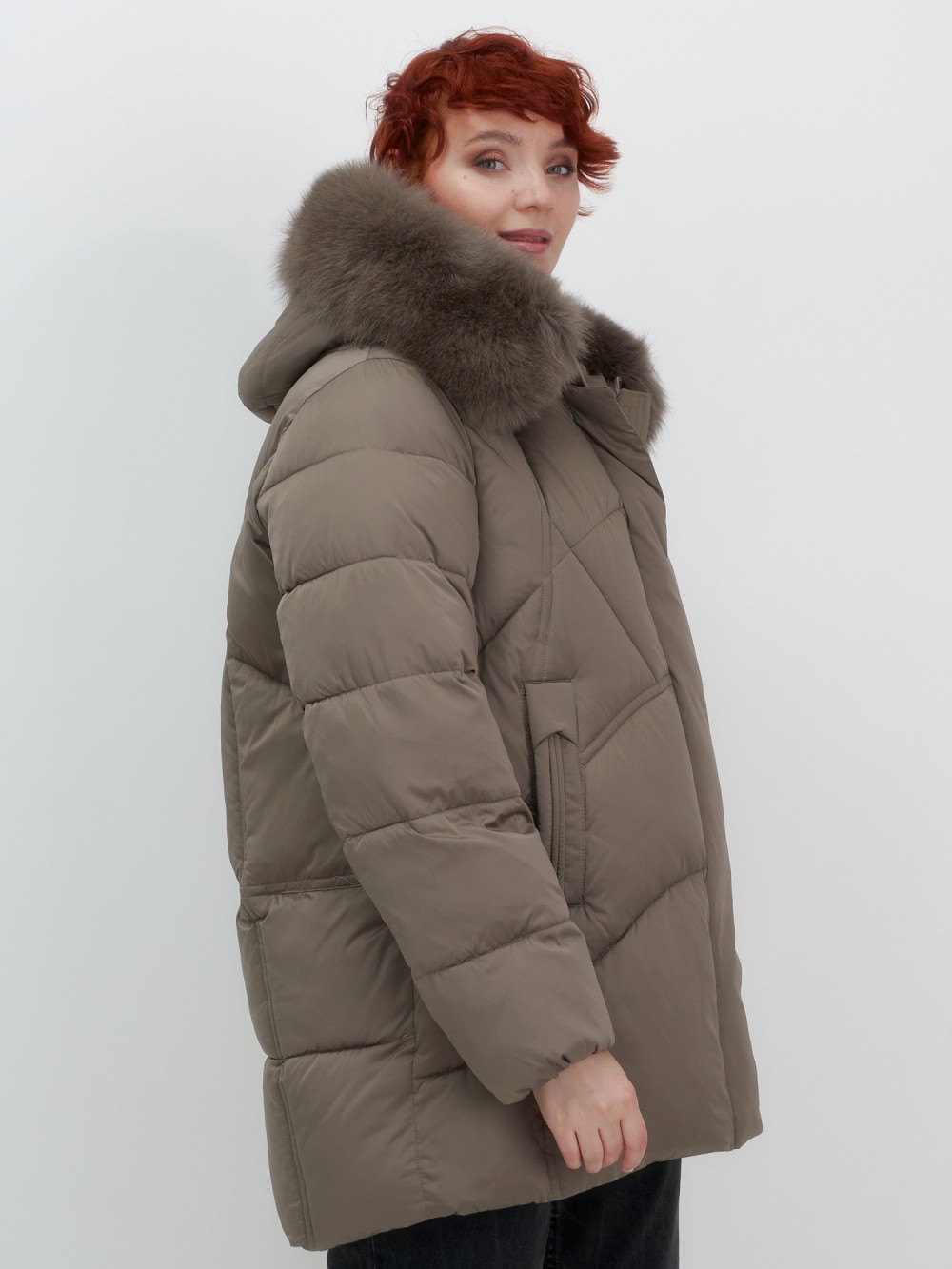 Куртка зимняя женская с мехом и капюшоном тренд коричневого цвета 7656K