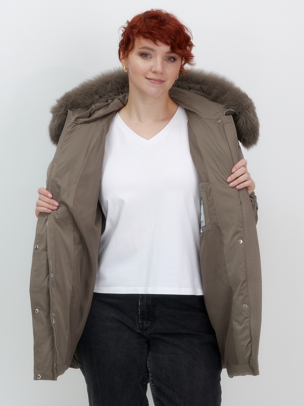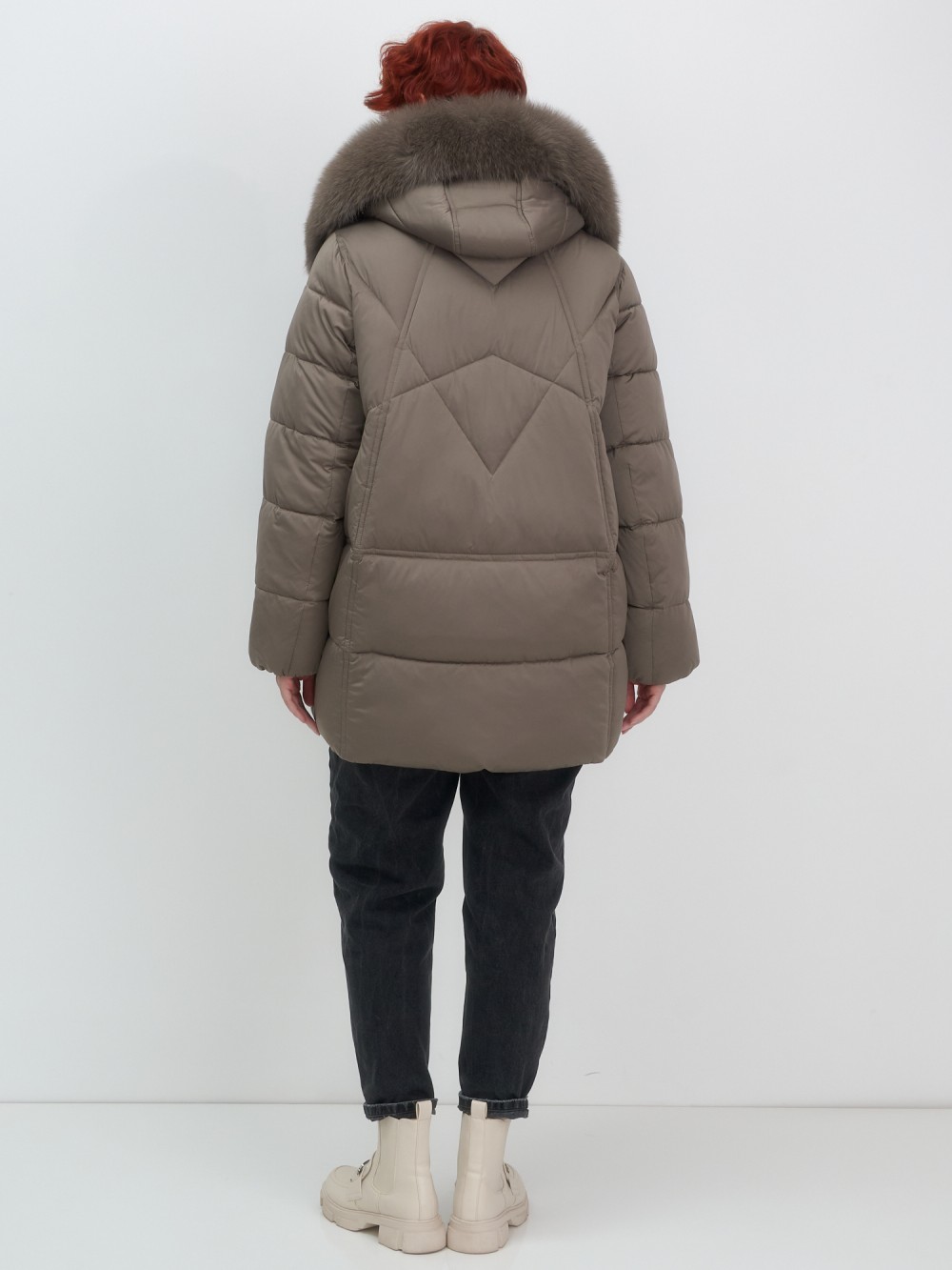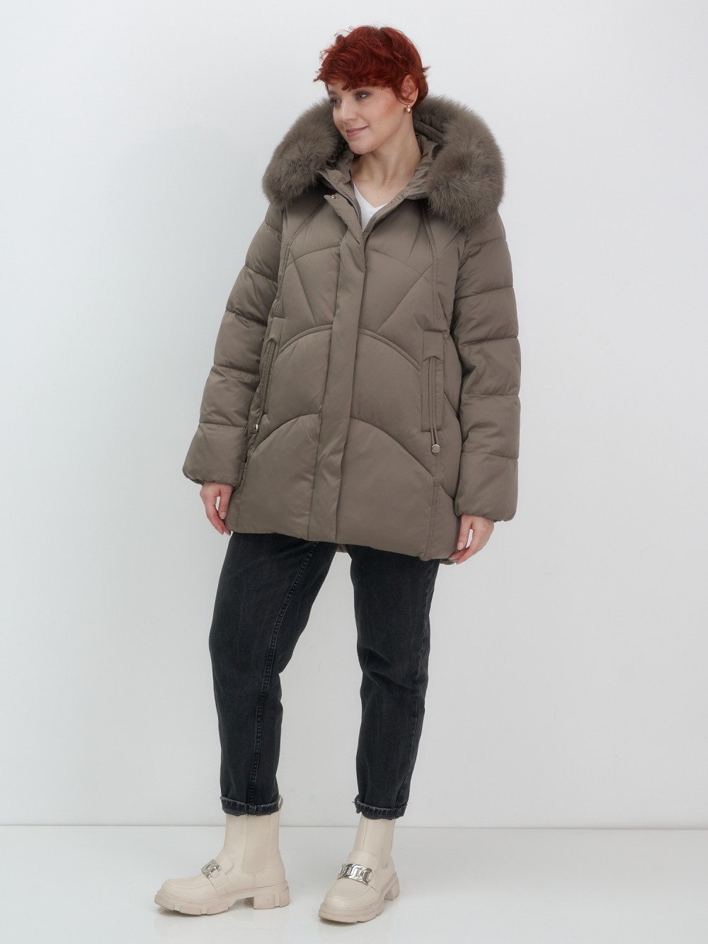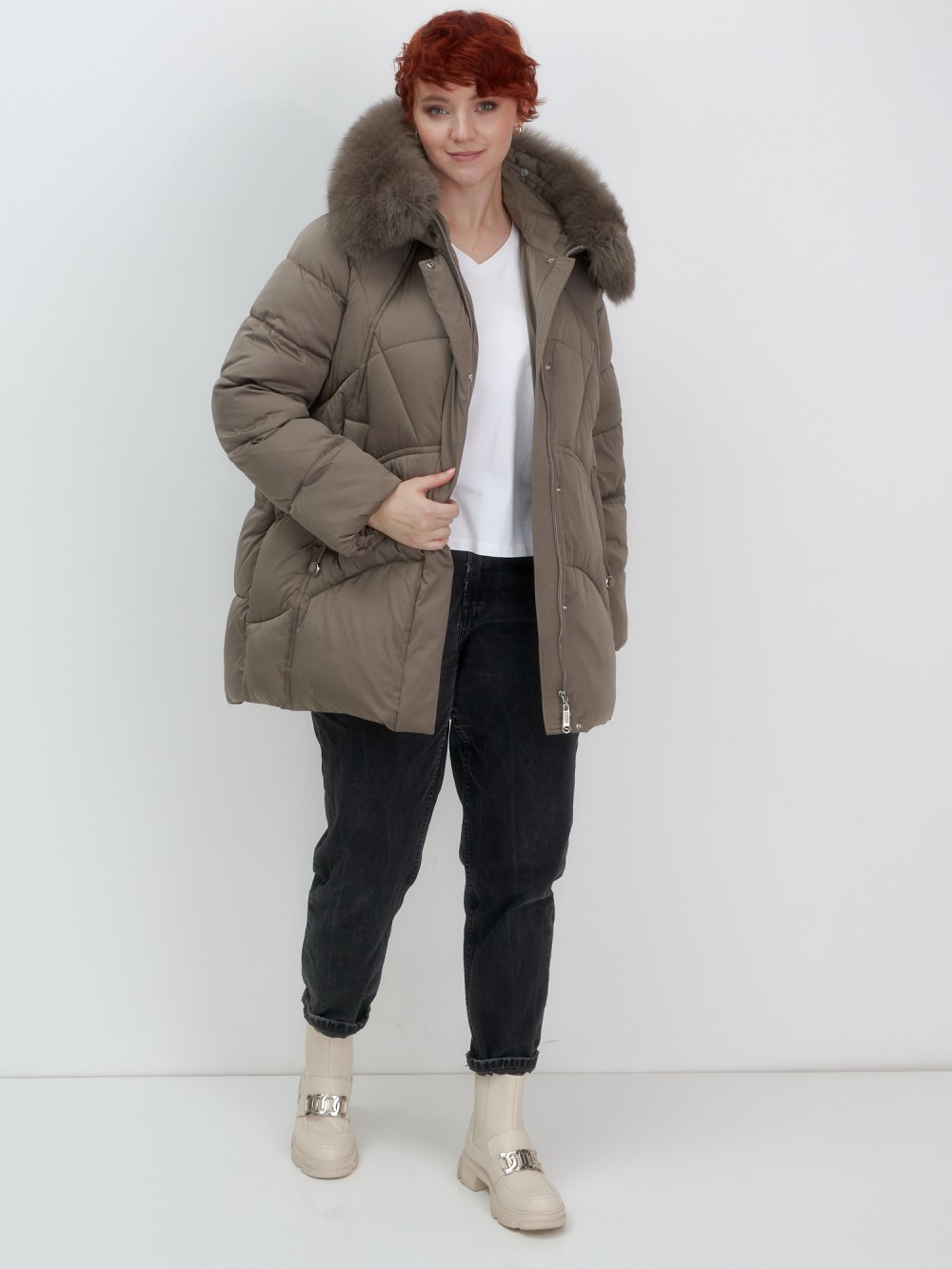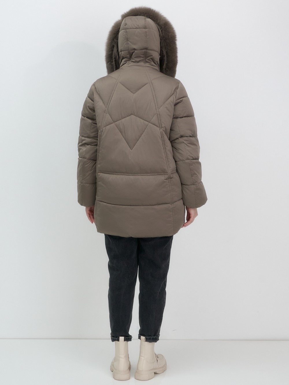 Изысканная палитра оттенков – глубокий черный, благородный темно-серый, насыщенный коричневый и утонченный светло-коричневый – прекрасно гармонирует с роскошным мехом песца. Удлиненный силуэт до колена в сочетании с натуральным мехом создает безупречные пропорции, делая фигуру более стройной и грациозной.