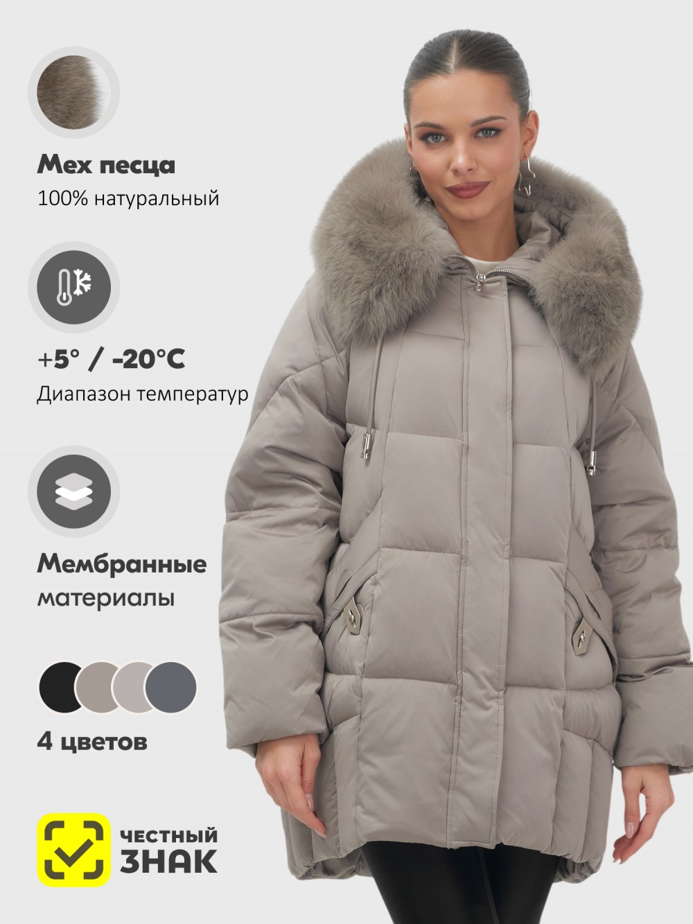 Изысканная цветовая палитра включает благородный черный, глубокий коричневый, утонченный светло-коричневый и аристократичный темно-серый. Каждый оттенок идеально подчеркивает природную красоту натурального меха песца. Удлиненный силуэт до колена в сочетании с продуманным кроем создает безупречные пропорции.