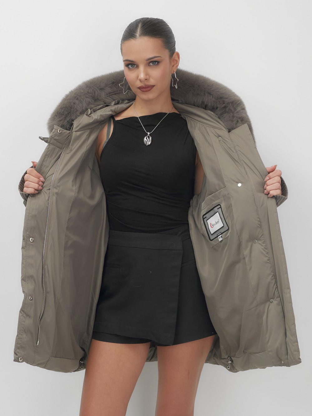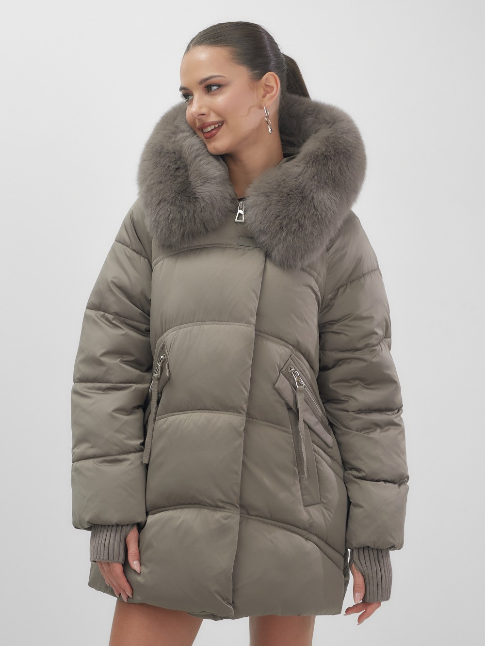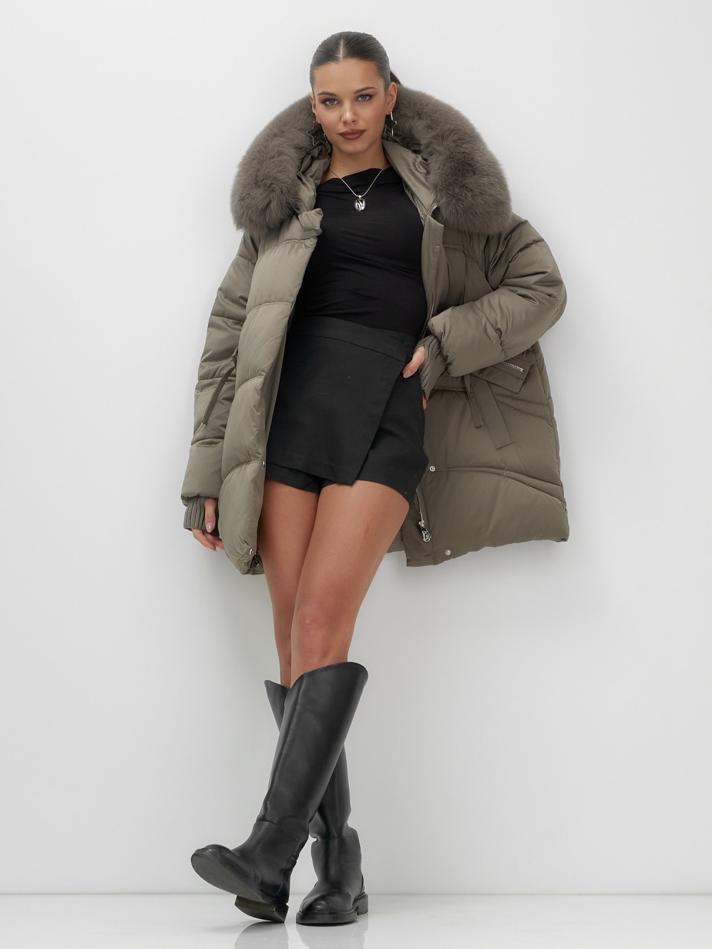 Пять трендовых оттенков сезона осень-зима 2025 – глубокий черный, благородный коричневый, нежный светло-коричневый, изысканный темно-зеленый и элегантный бежевый – идеально сочетаются с роскошным мехом песца. Удлиненный силуэт до колена и свободный крой создают идеальные пропорции для размеров 46-54.