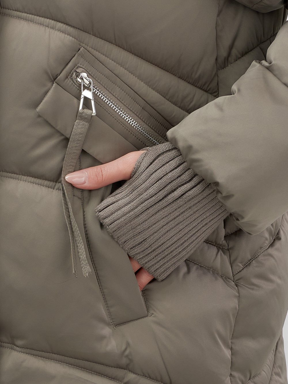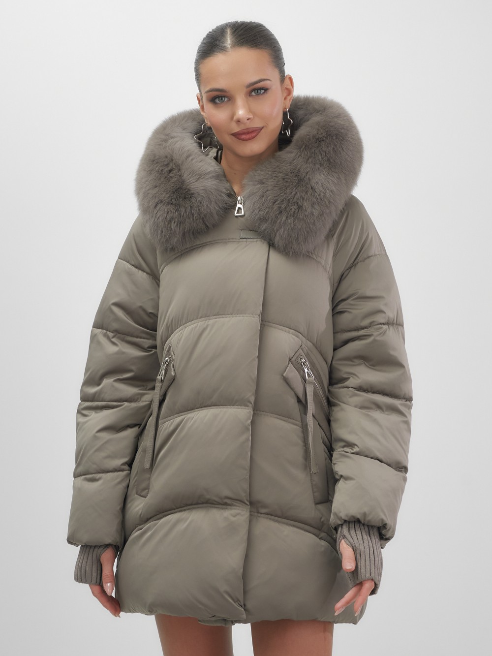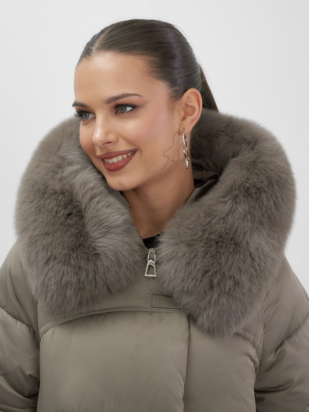 Пять трендовых оттенков сезона осень-зима 2025 – глубокий черный, благородный коричневый, нежный светло-коричневый, изысканный темно-зеленый и элегантный бежевый – идеально сочетаются с роскошным мехом песца. Удлиненный силуэт до колена и свободный крой создают идеальные пропорции для размеров 46-54.