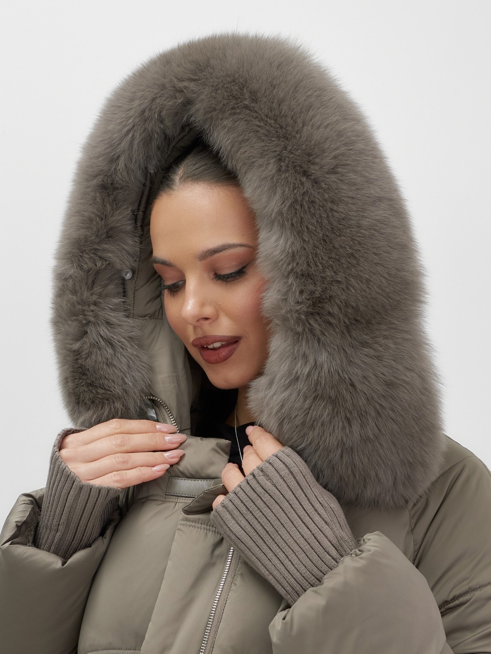 Куртка зимняя женская с мехом и капюшоном тренд коричневого цвета 7737K