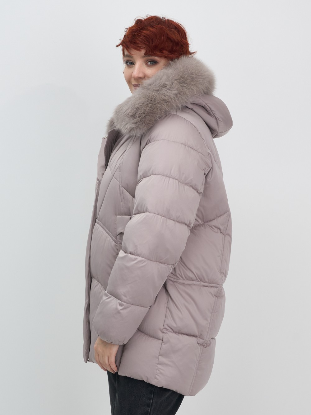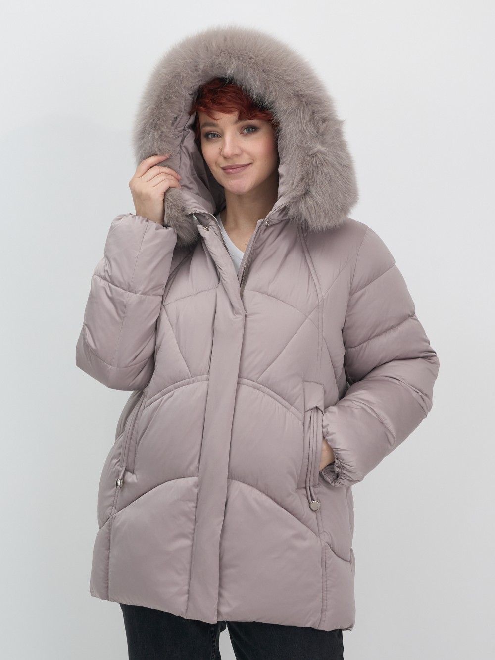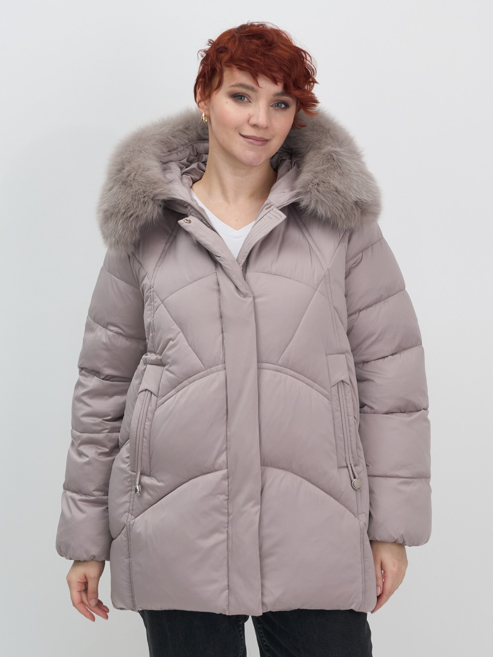Куртка зимняя женская с мехом и капюшоном тренд светло-коричневого цвета 7656SK