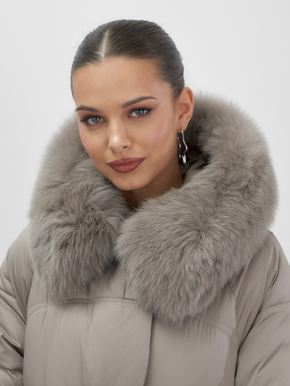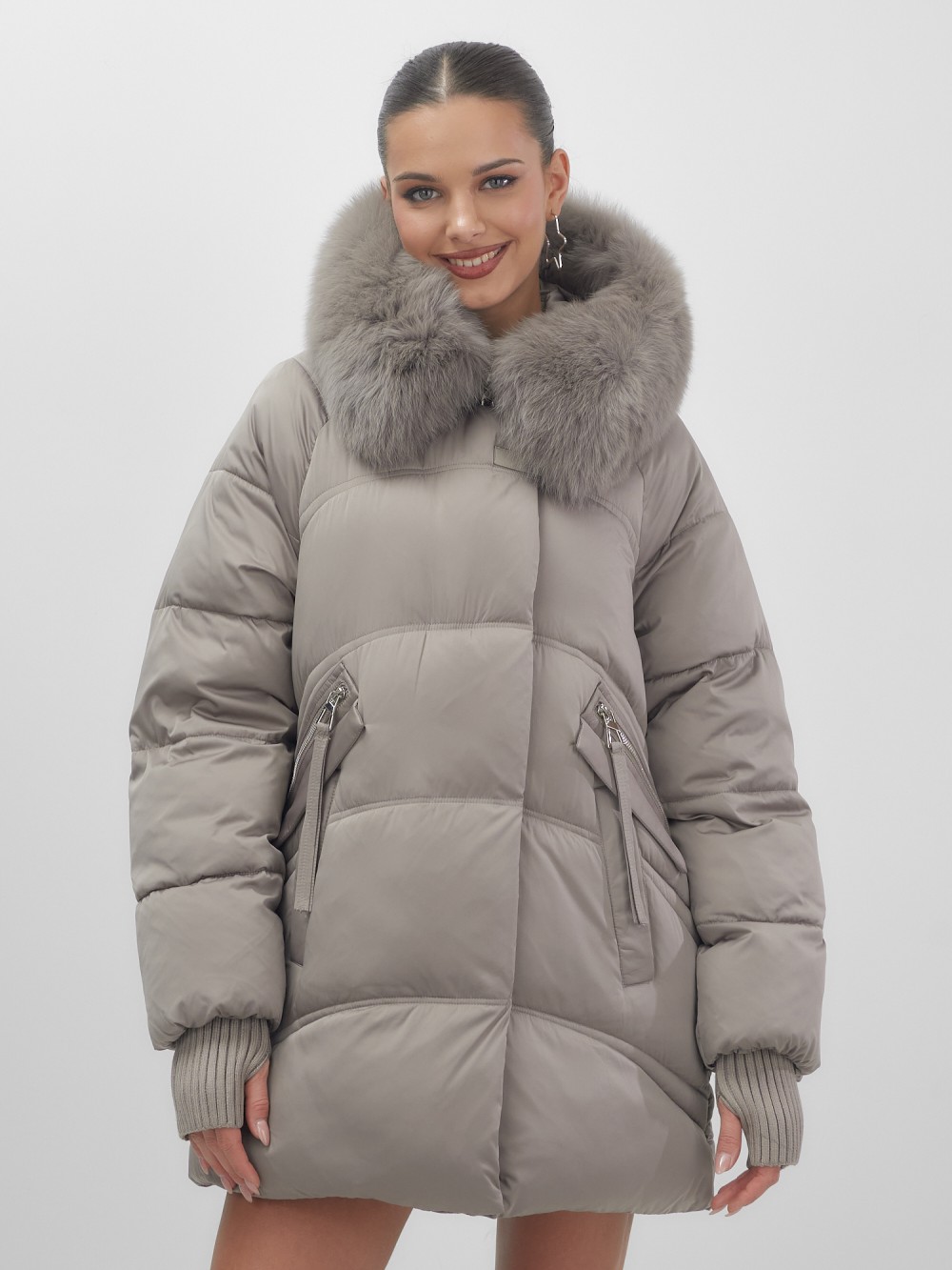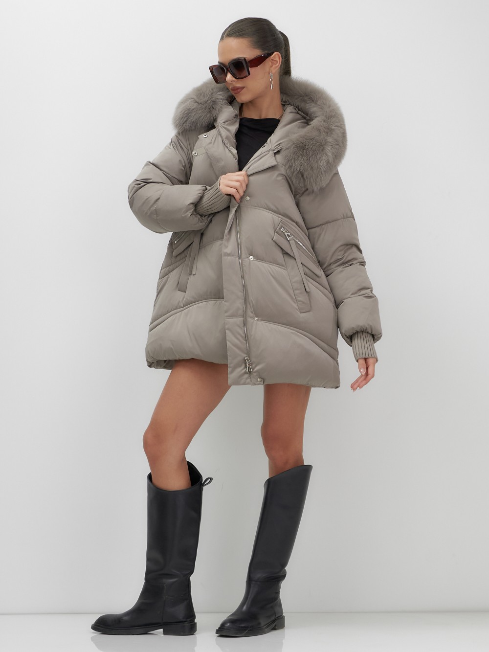 Пять трендовых оттенков сезона осень-зима 2025 – глубокий черный, благородный коричневый, нежный светло-коричневый, изысканный темно-зеленый и элегантный бежевый – идеально сочетаются с роскошным мехом песца. Удлиненный силуэт до колена и свободный крой создают идеальные пропорции для размеров 46-54.
