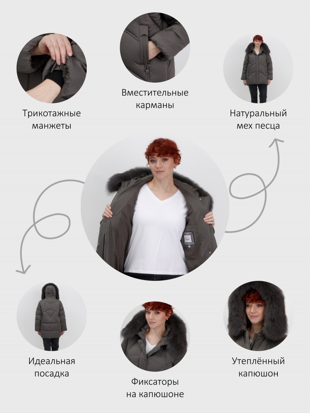 Изысканная палитра оттенков – глубокий черный, благородный темно-серый, насыщенный коричневый и утонченный светло-коричневый – прекрасно гармонирует с роскошным мехом песца. Удлиненный силуэт до колена в сочетании с натуральным мехом создает безупречные пропорции, делая фигуру более стройной и грациозной.