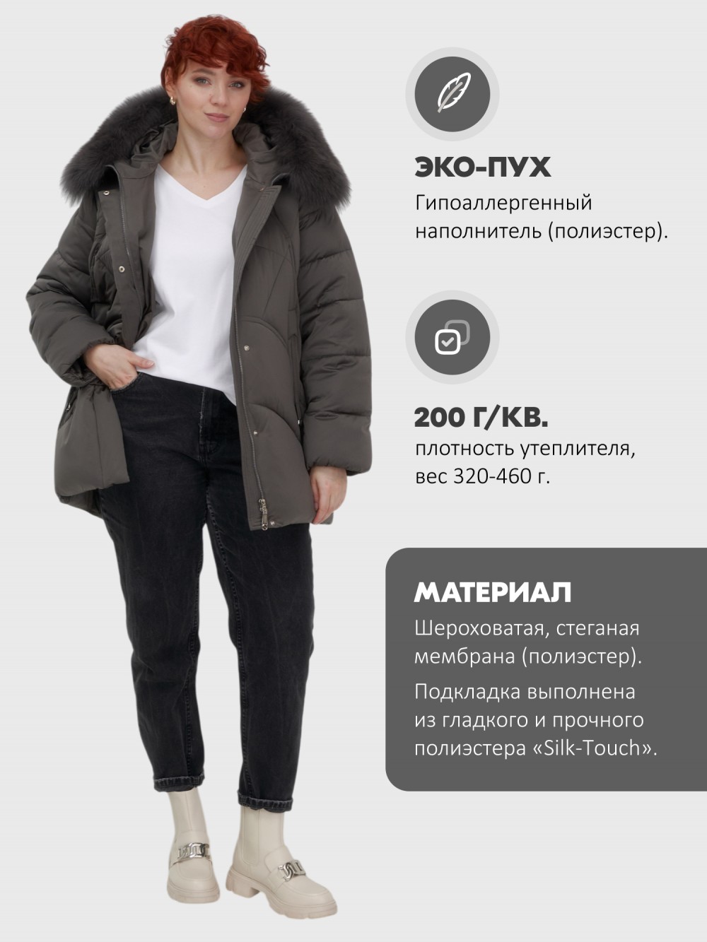 Куртка зимняя женская с мехом и капюшоном тренд темно-серого цвета 7656TC