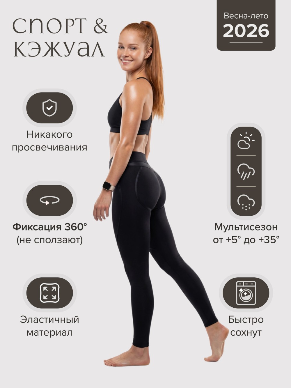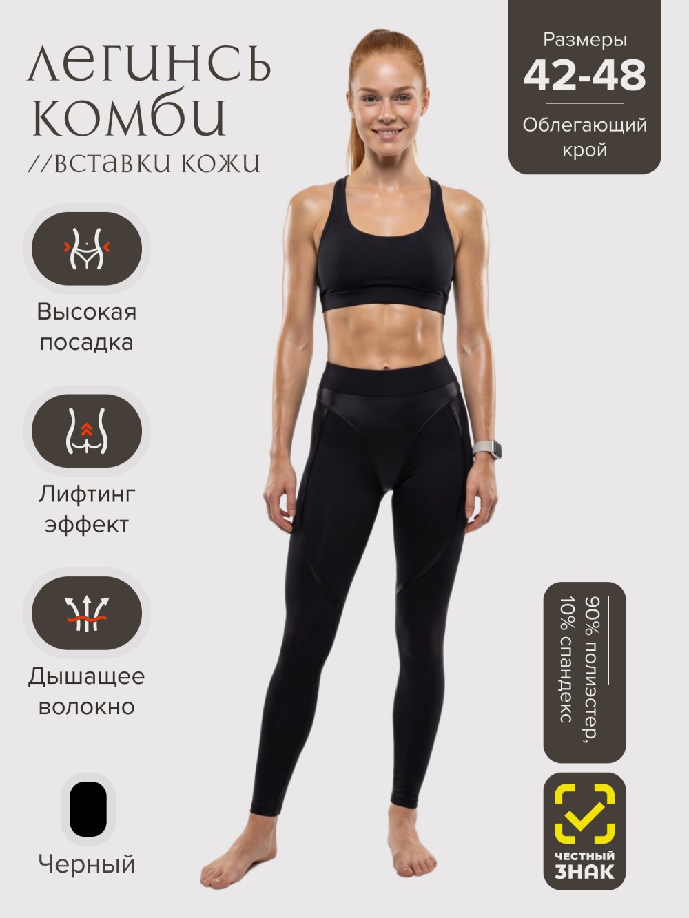 Высокая посадка фиксирует талию и подчеркивает силуэт, обеспечивая уверенность в любой активности — от фитнеса и йоги до прогулок и динамичного городского ритма.