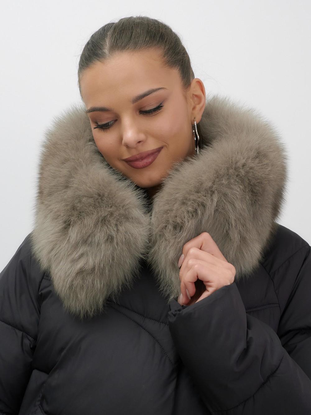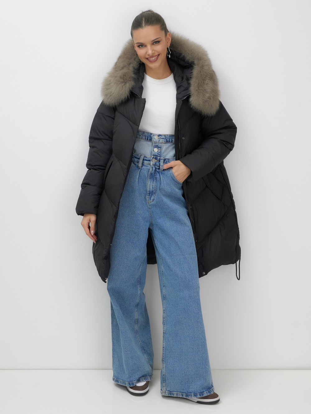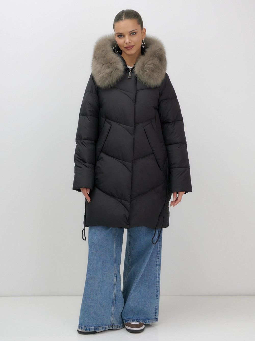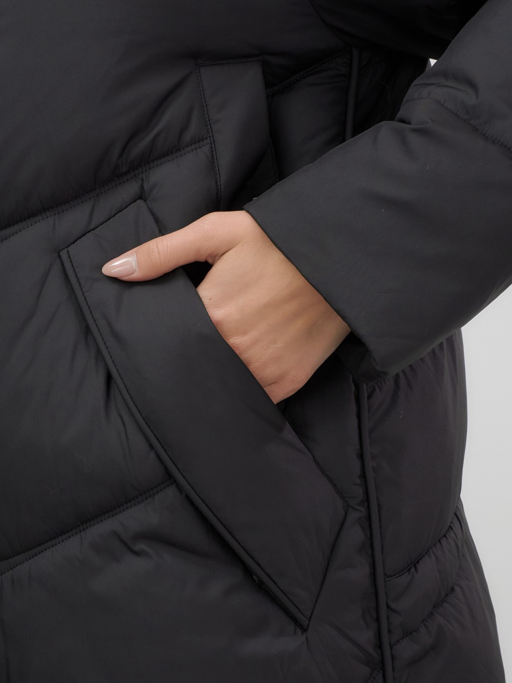 Пальто зимнее утепленное с мехом и капюшоном тренд черного цвета 7745Ch