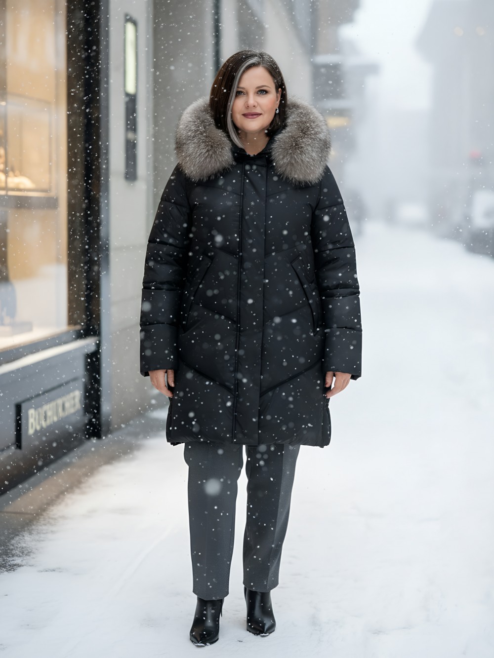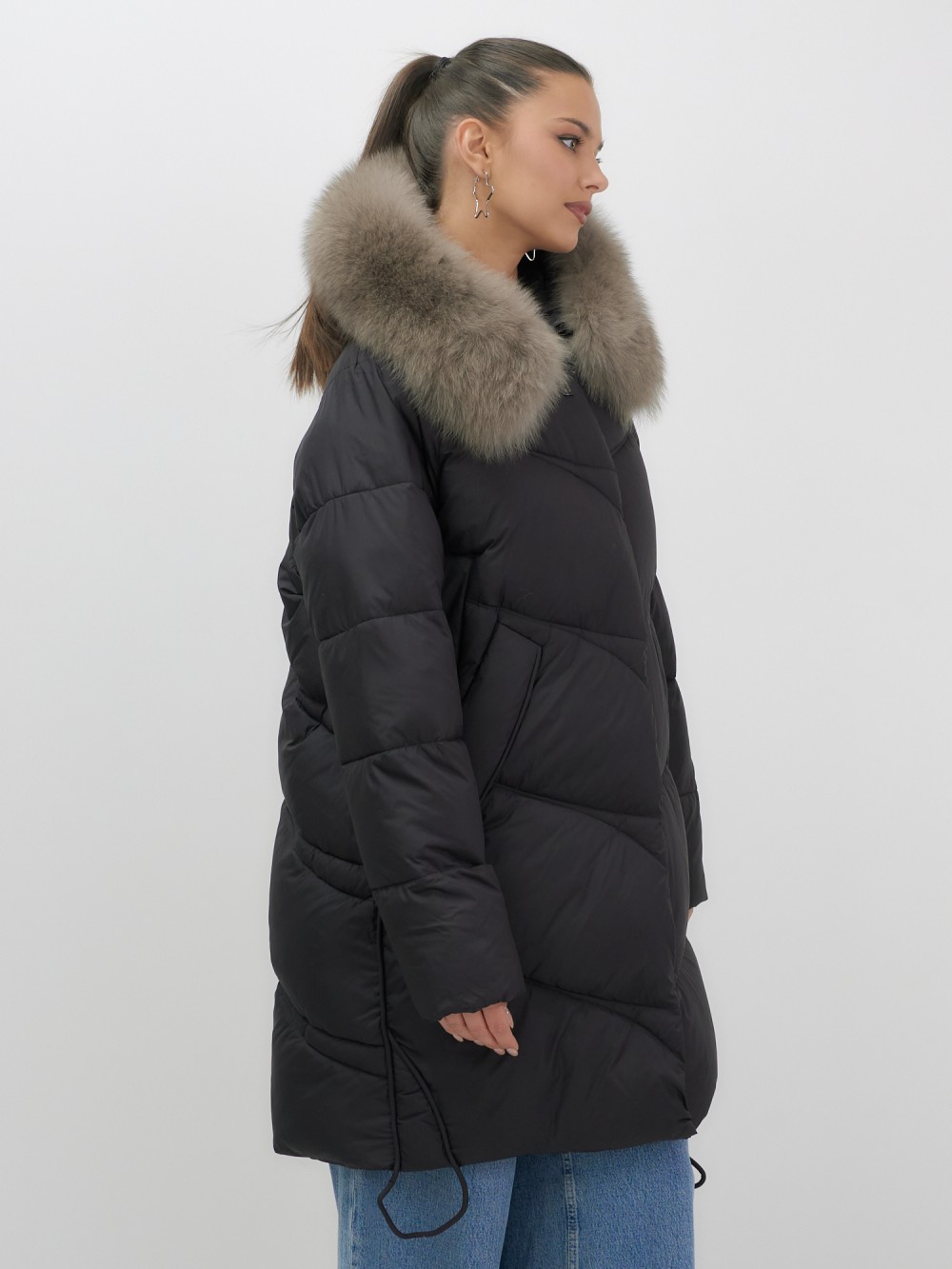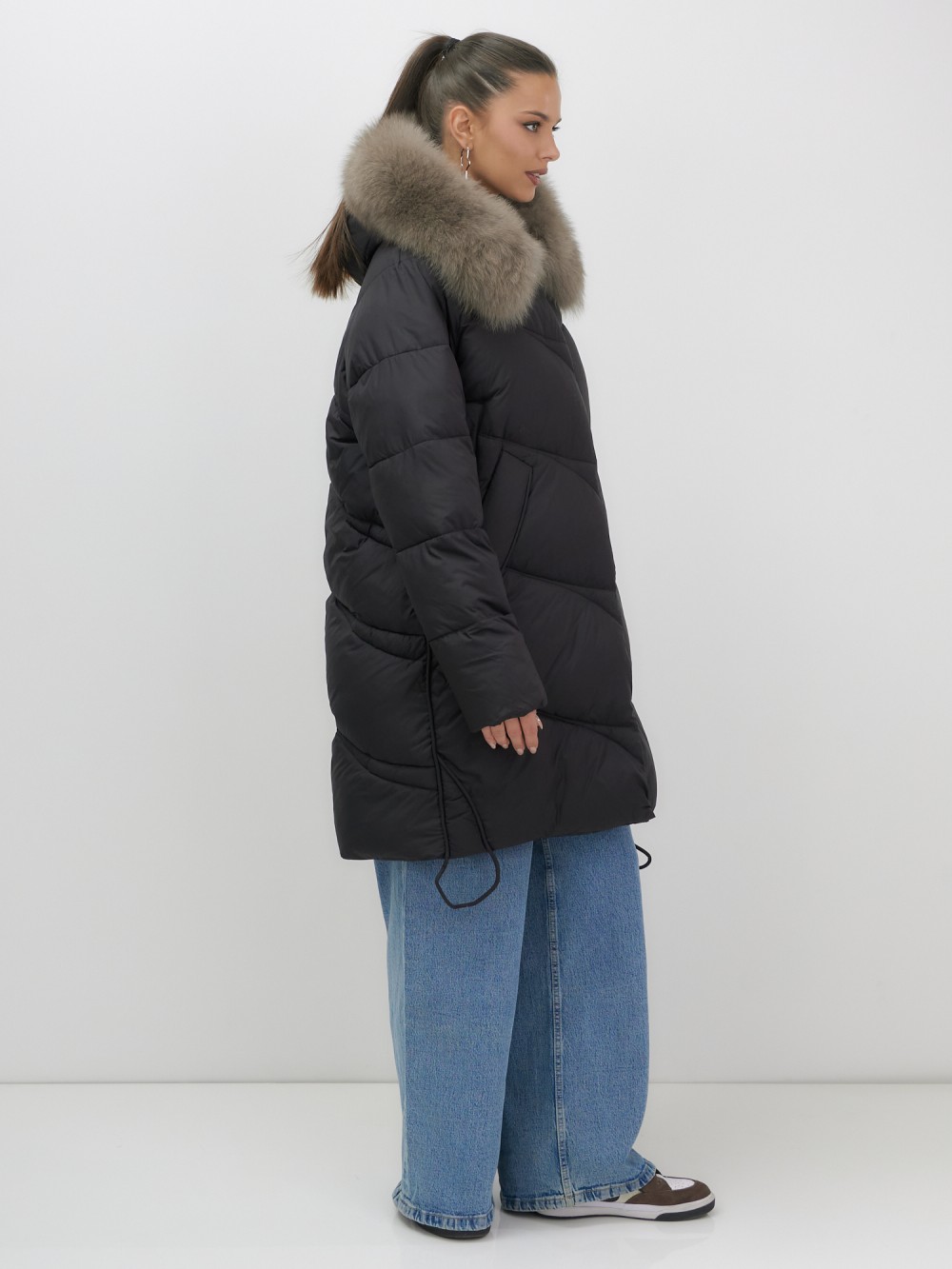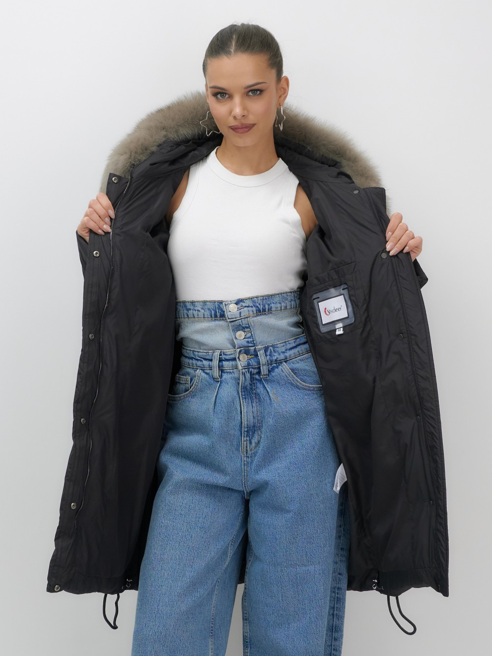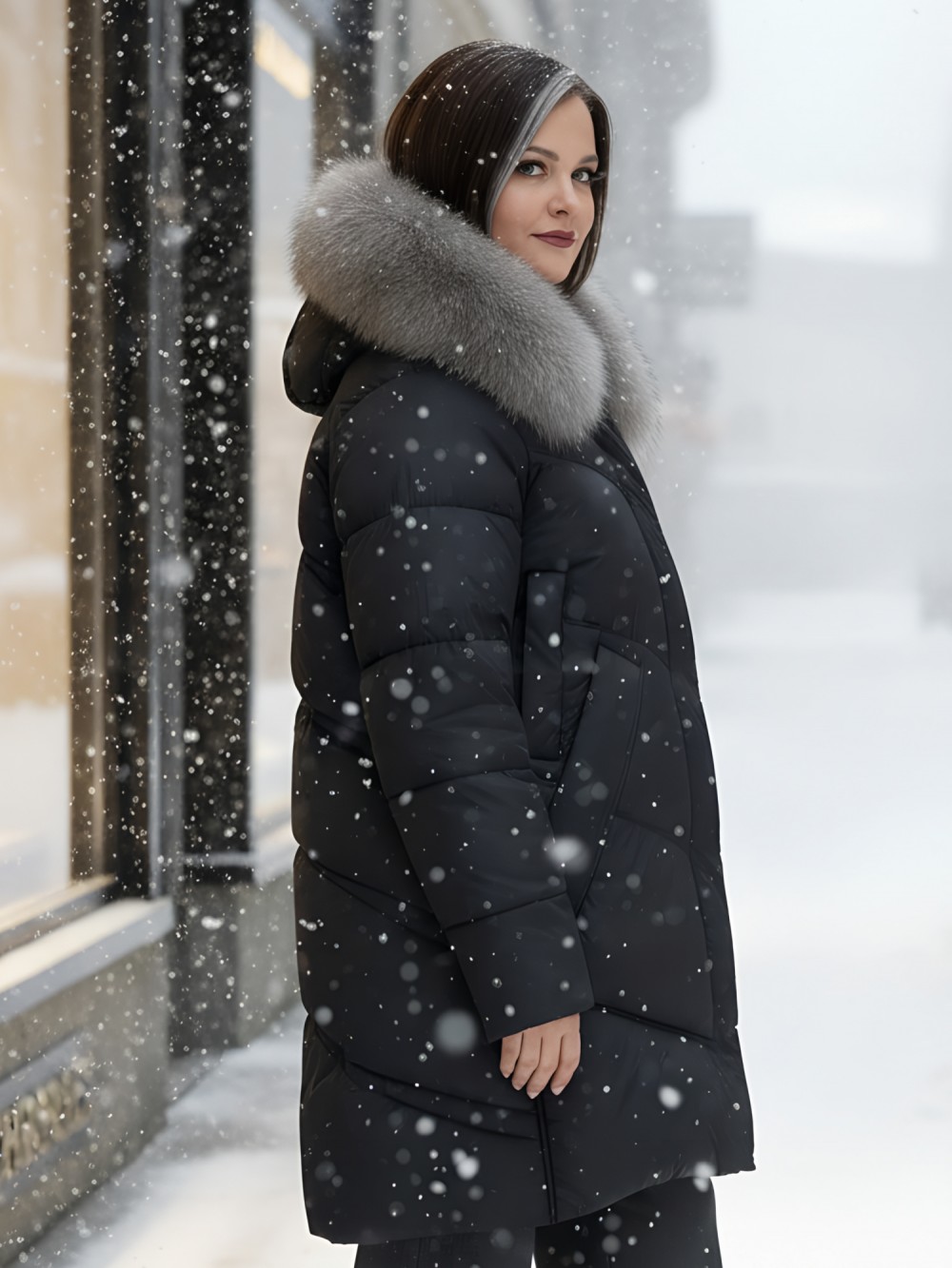 Четыре изысканных оттенка коллекции осень-зима 2025 – благородный черный, элегантный темно-коричневый, утонченный светло-коричневый и стильный хаки – безупречно гармонируют с натуральным мехом песца. Удлиненный силуэт до колена и свободный крой созданы для размеров 46-54.