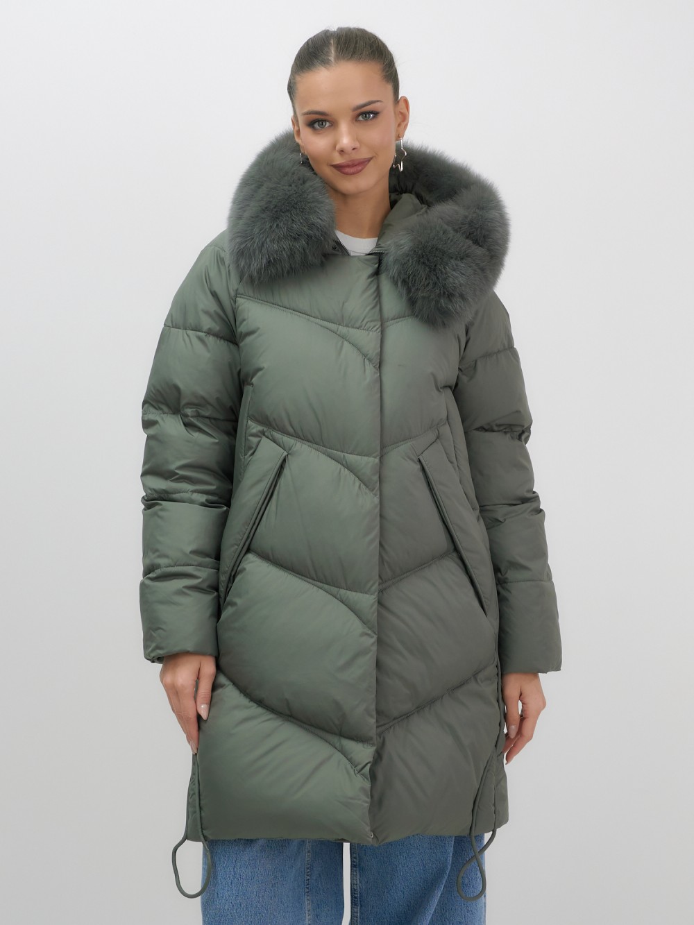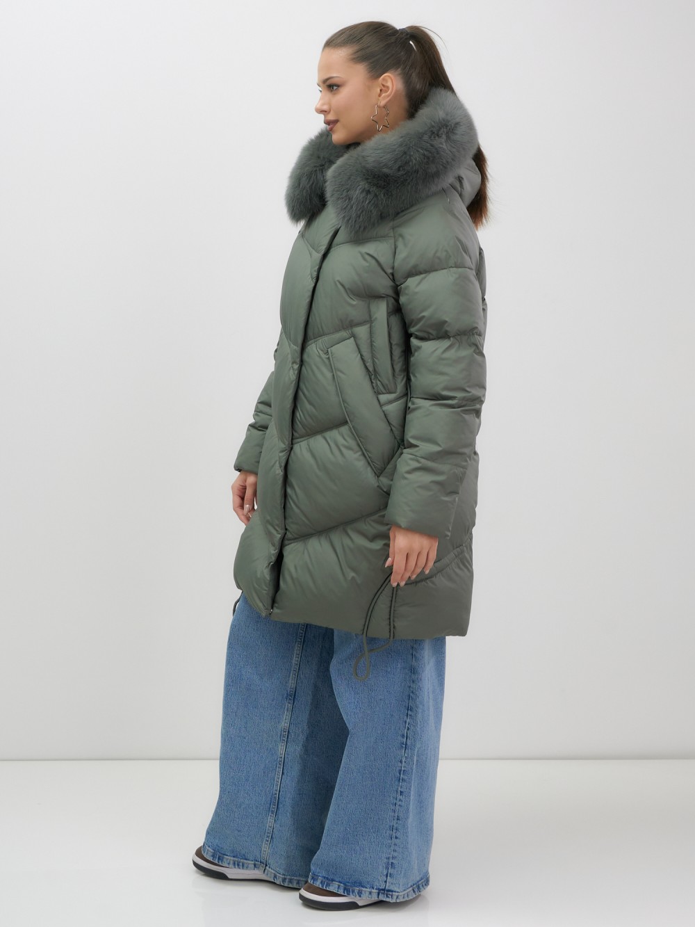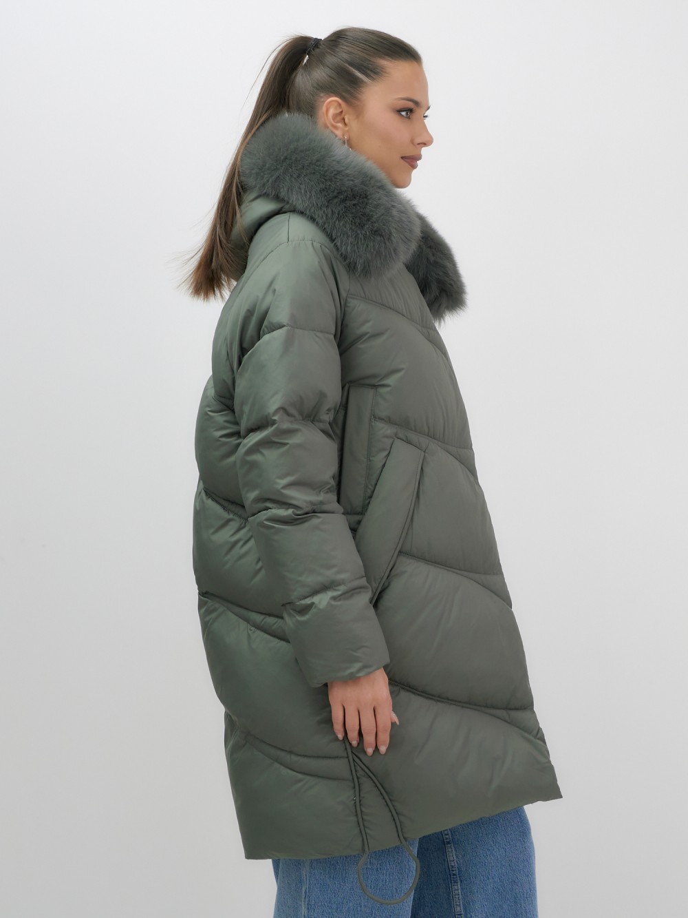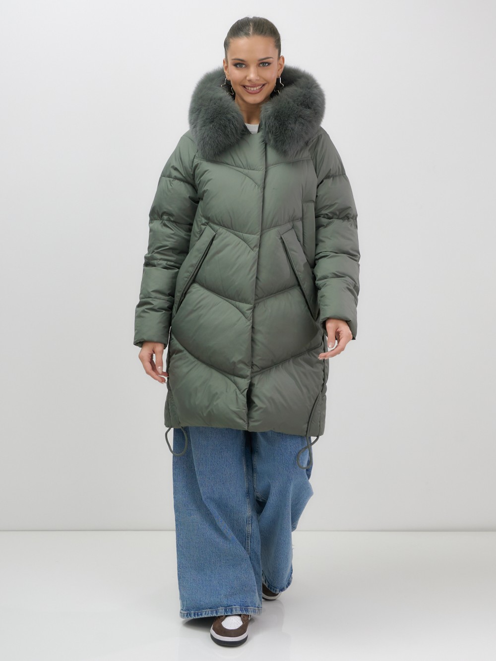 Пальто зимнее утепленное с мехом и капюшоном тренд цвета хаки 7745Kh