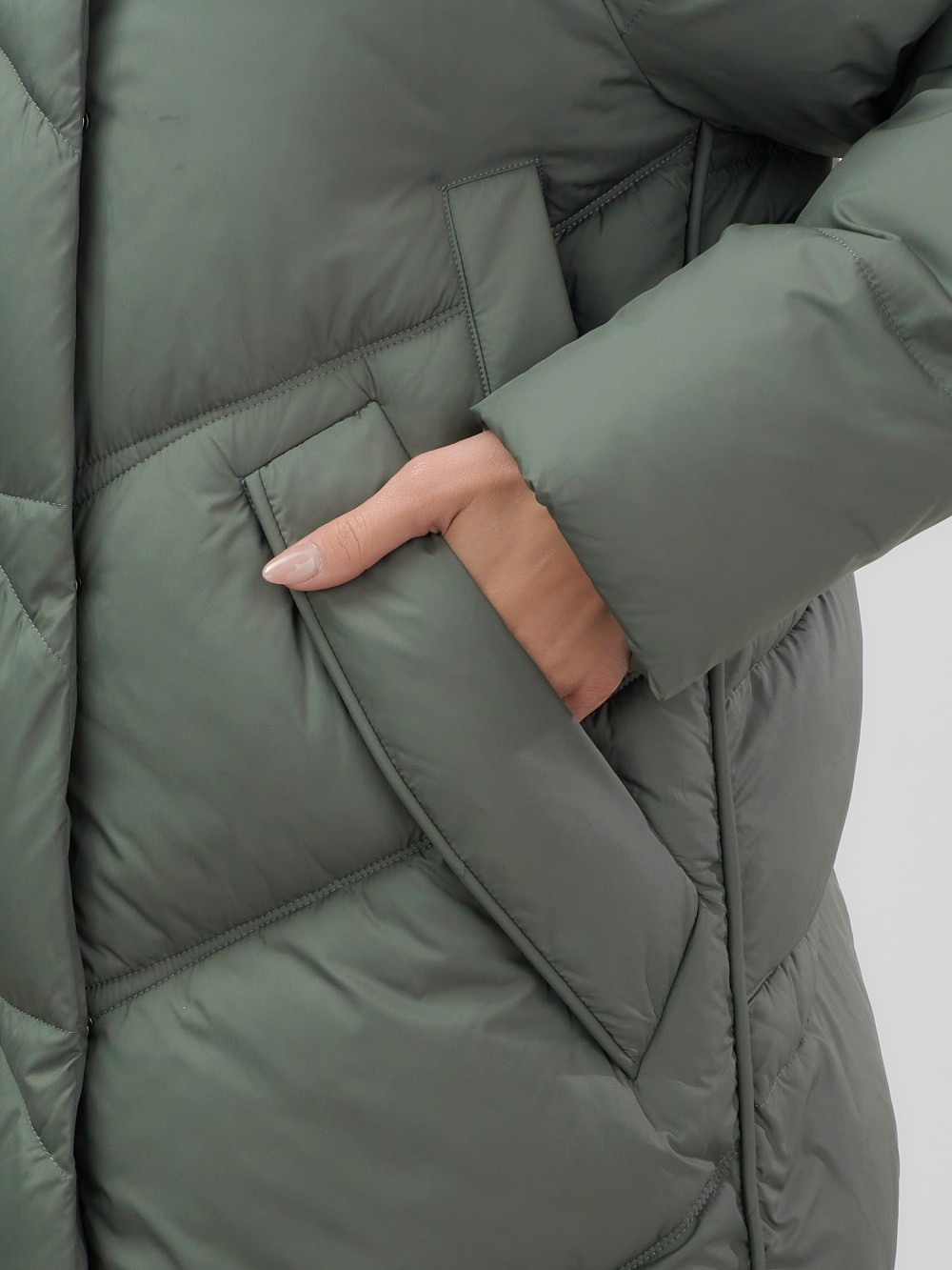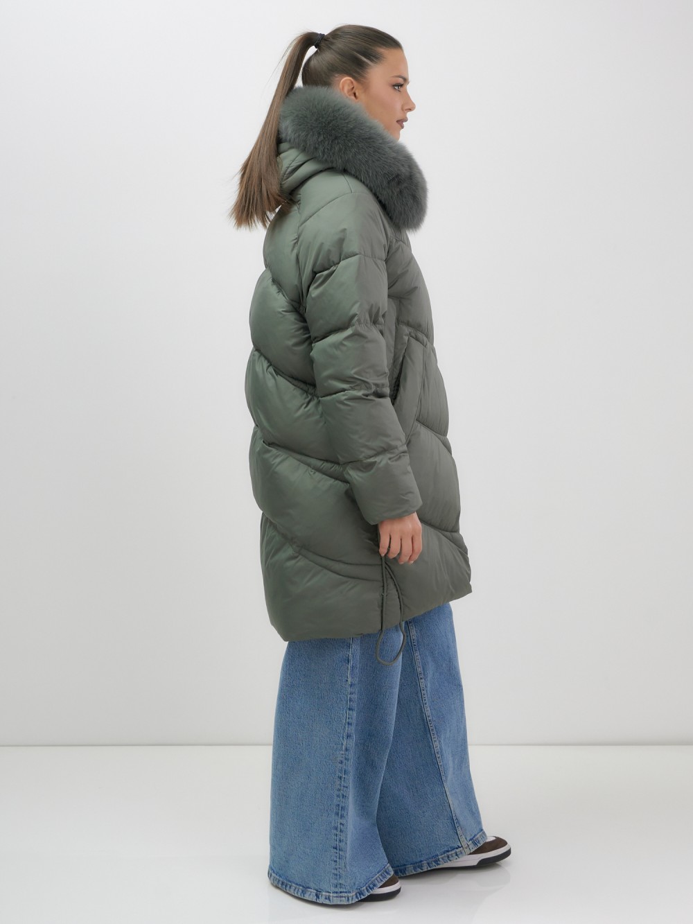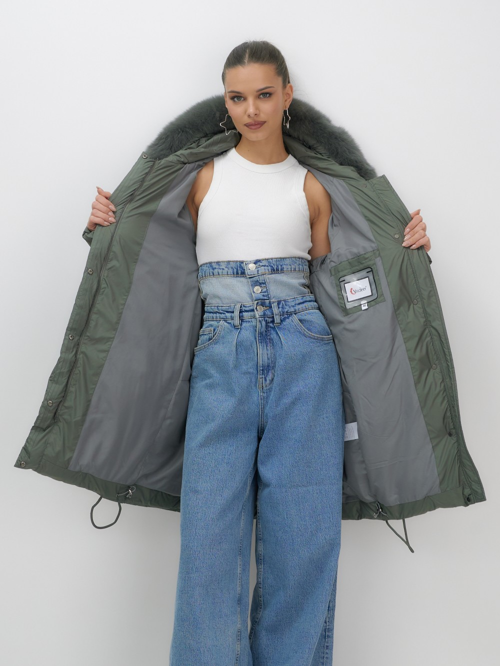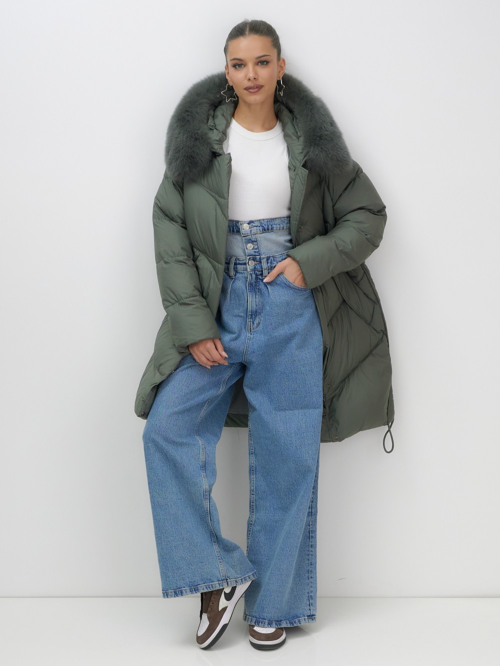 Пальто зимнее утепленное с мехом и капюшоном тренд цвета хаки 7745Kh