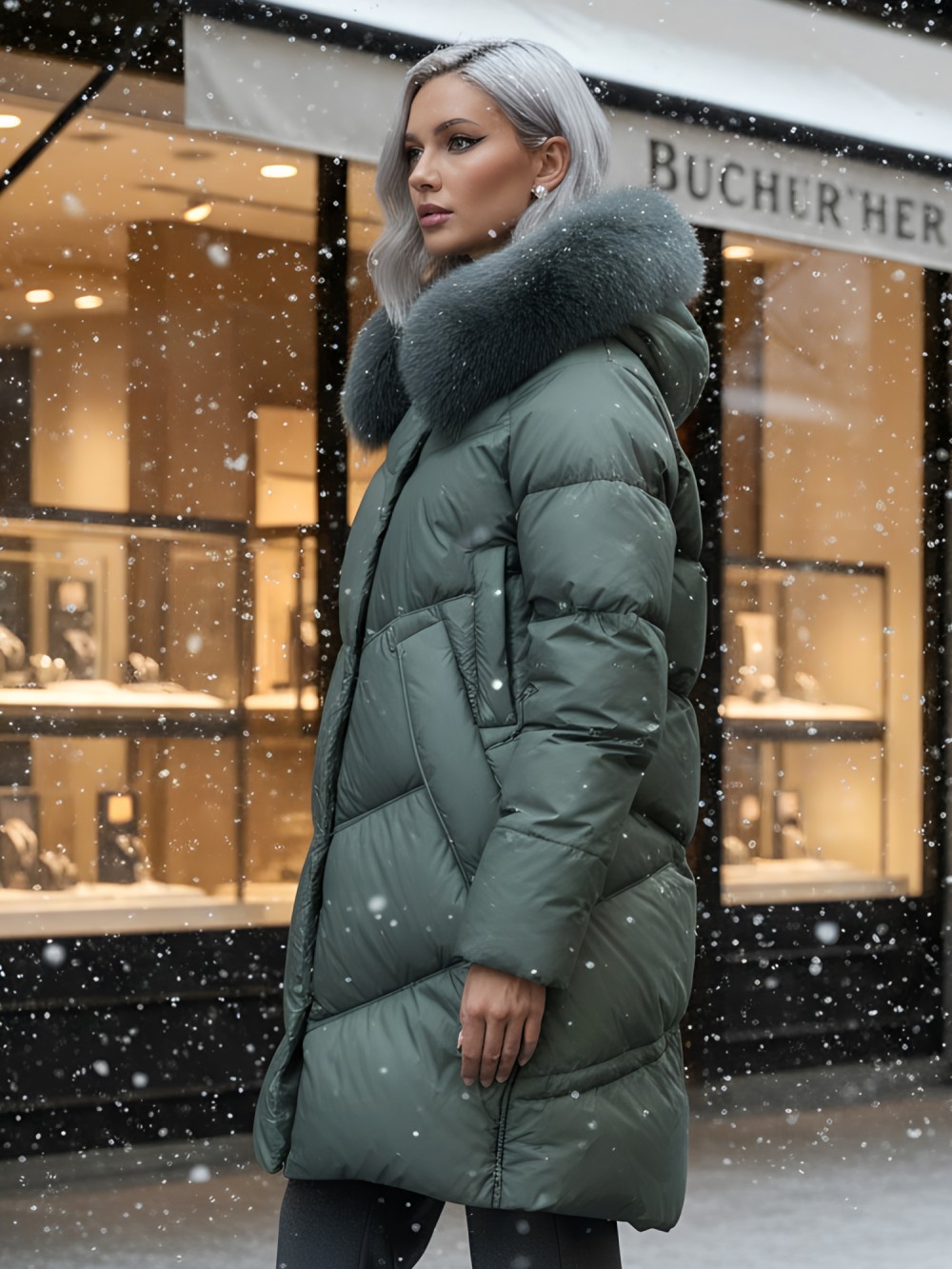 Четыре изысканных оттенка коллекции осень-зима 2025 – благородный черный, элегантный темно-коричневый, утонченный светло-коричневый и стильный хаки – безупречно гармонируют с натуральным мехом песца. Удлиненный силуэт до колена и свободный крой созданы для размеров 46-54.
