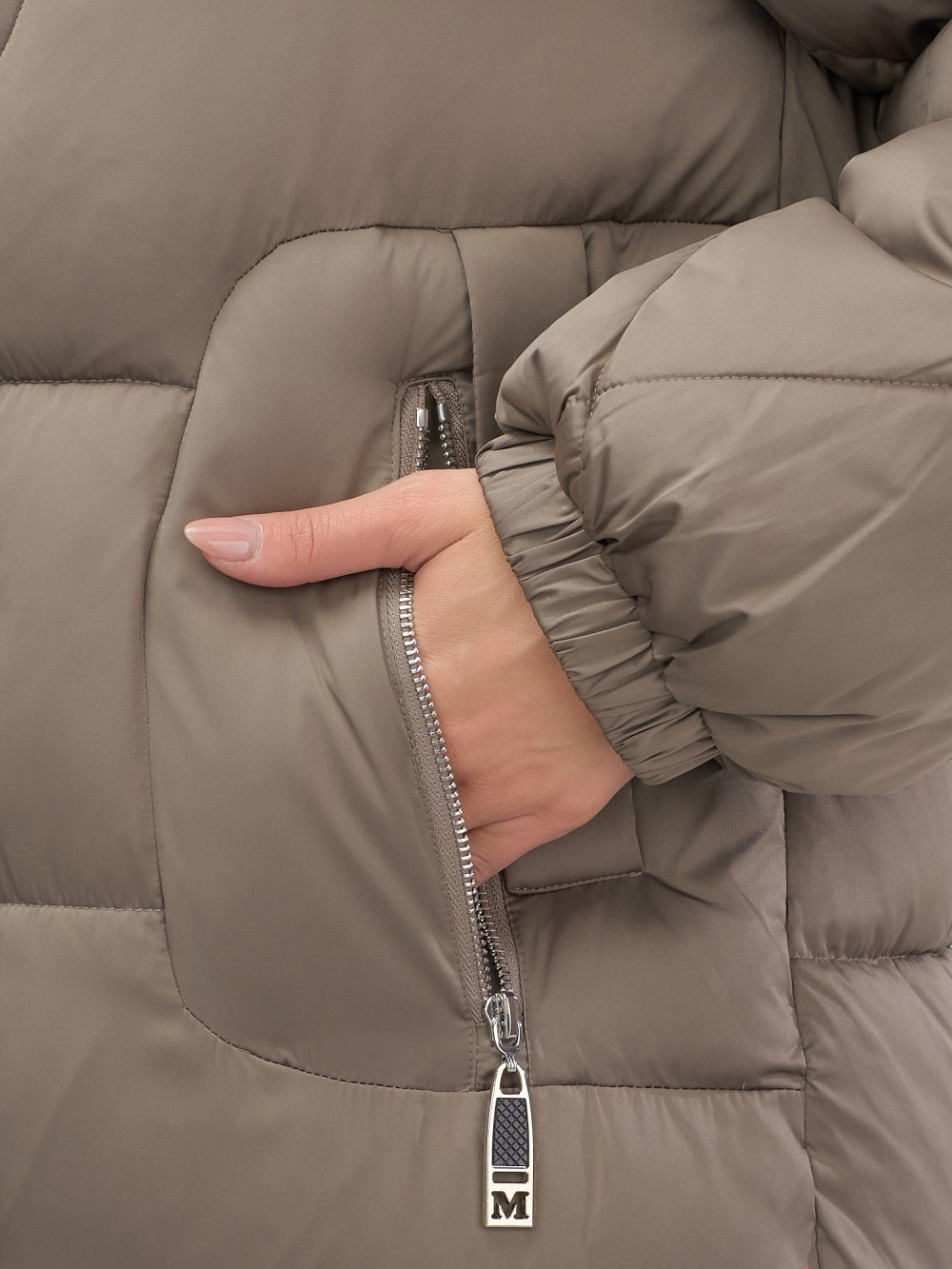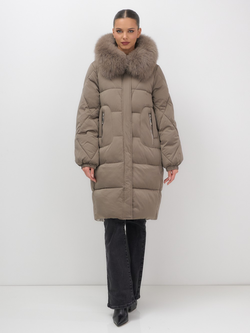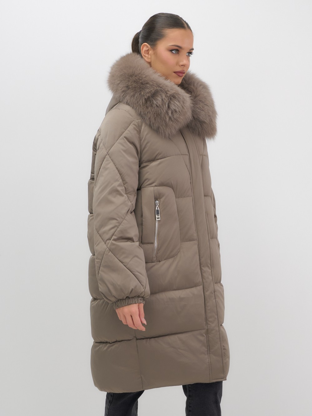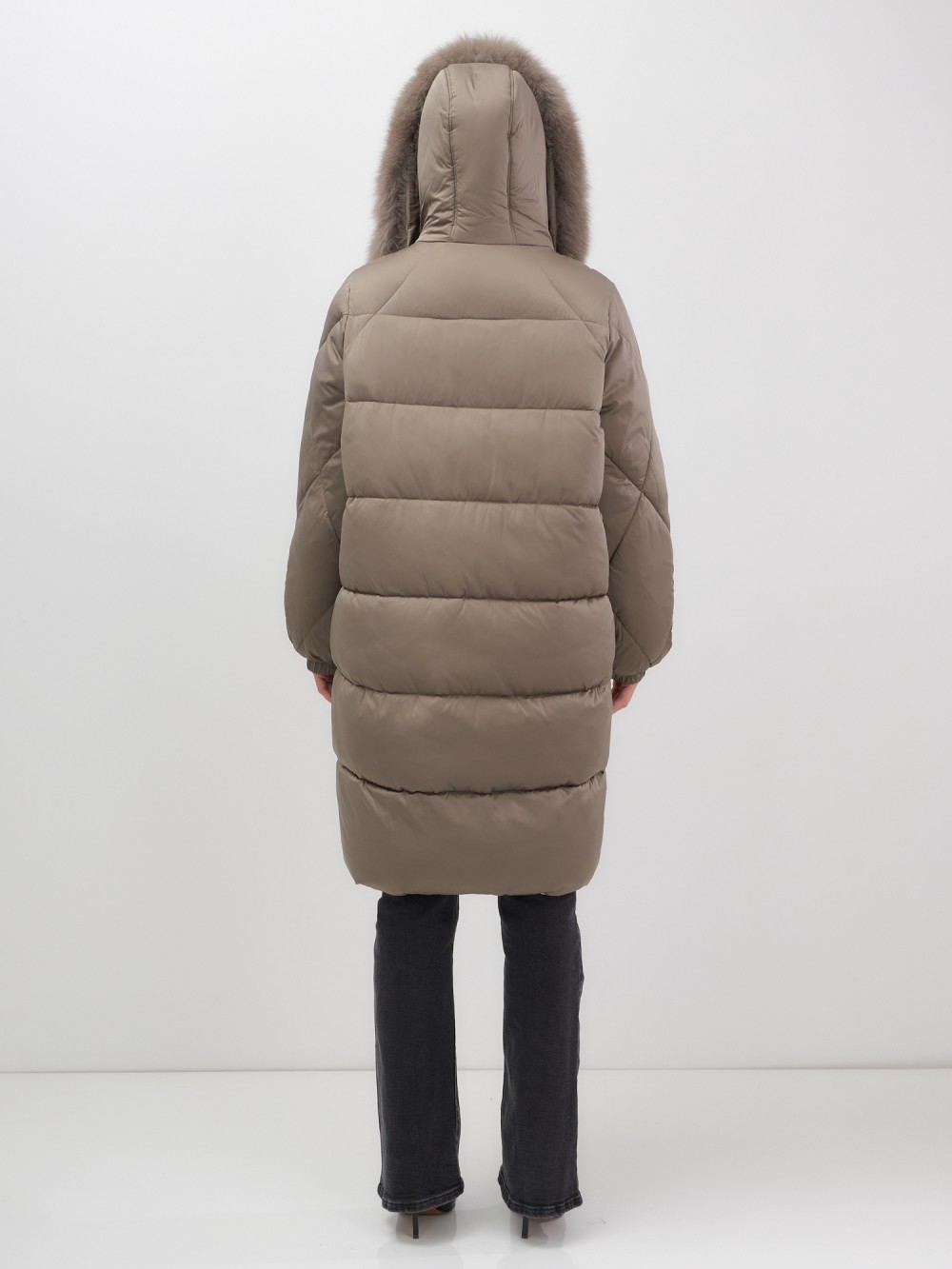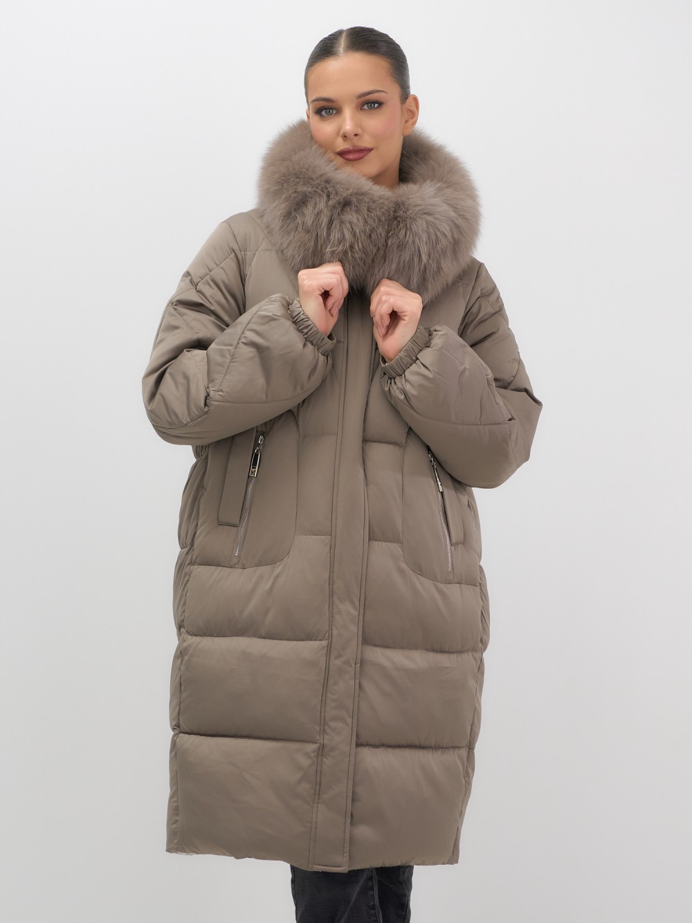 Пальто зимнее утепленное с мехом и капюшоном тренд коричневого цвета 7629K